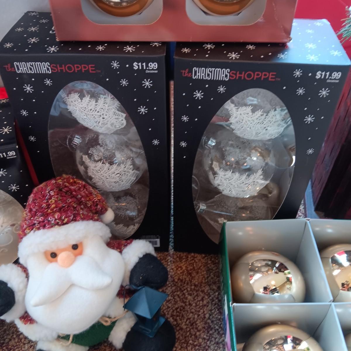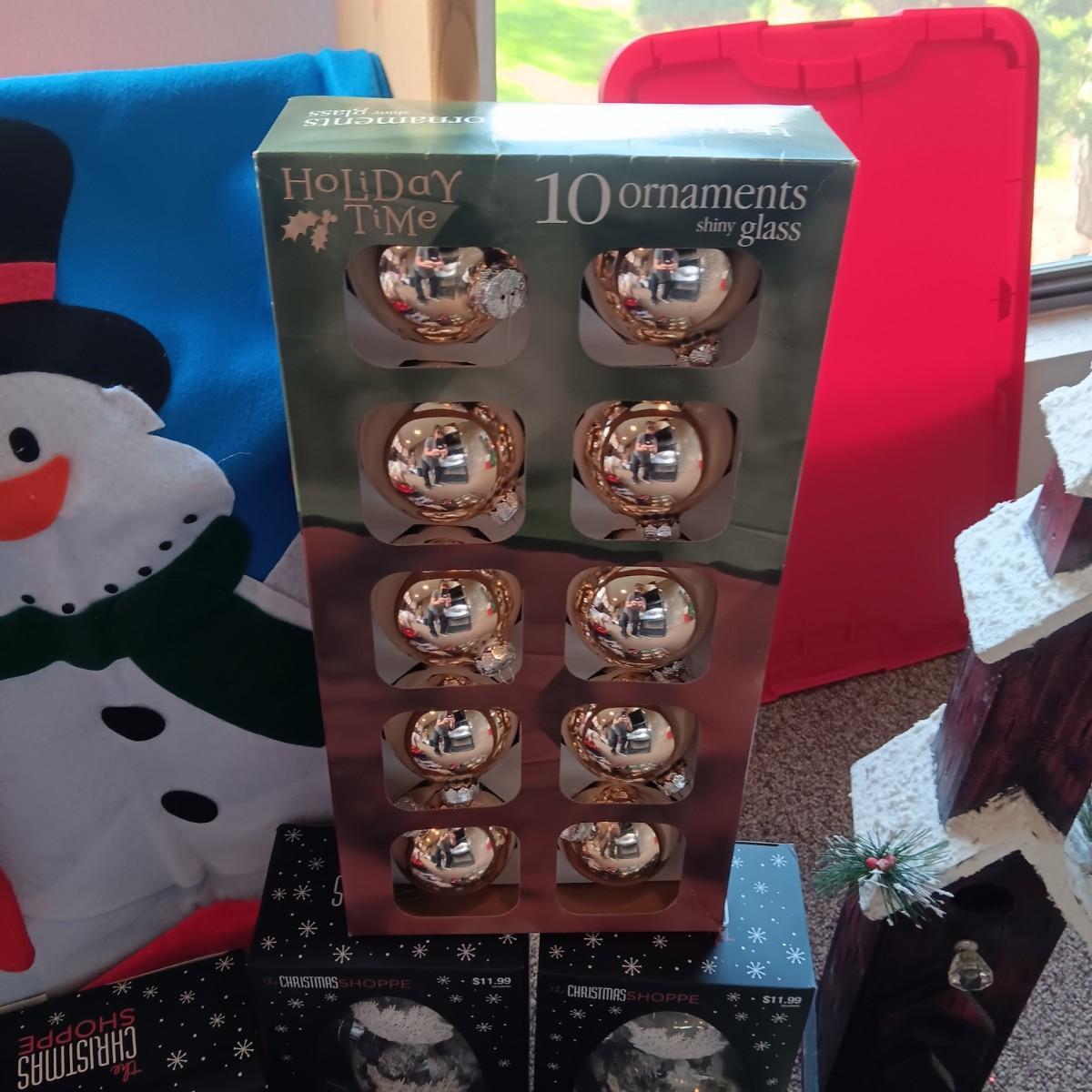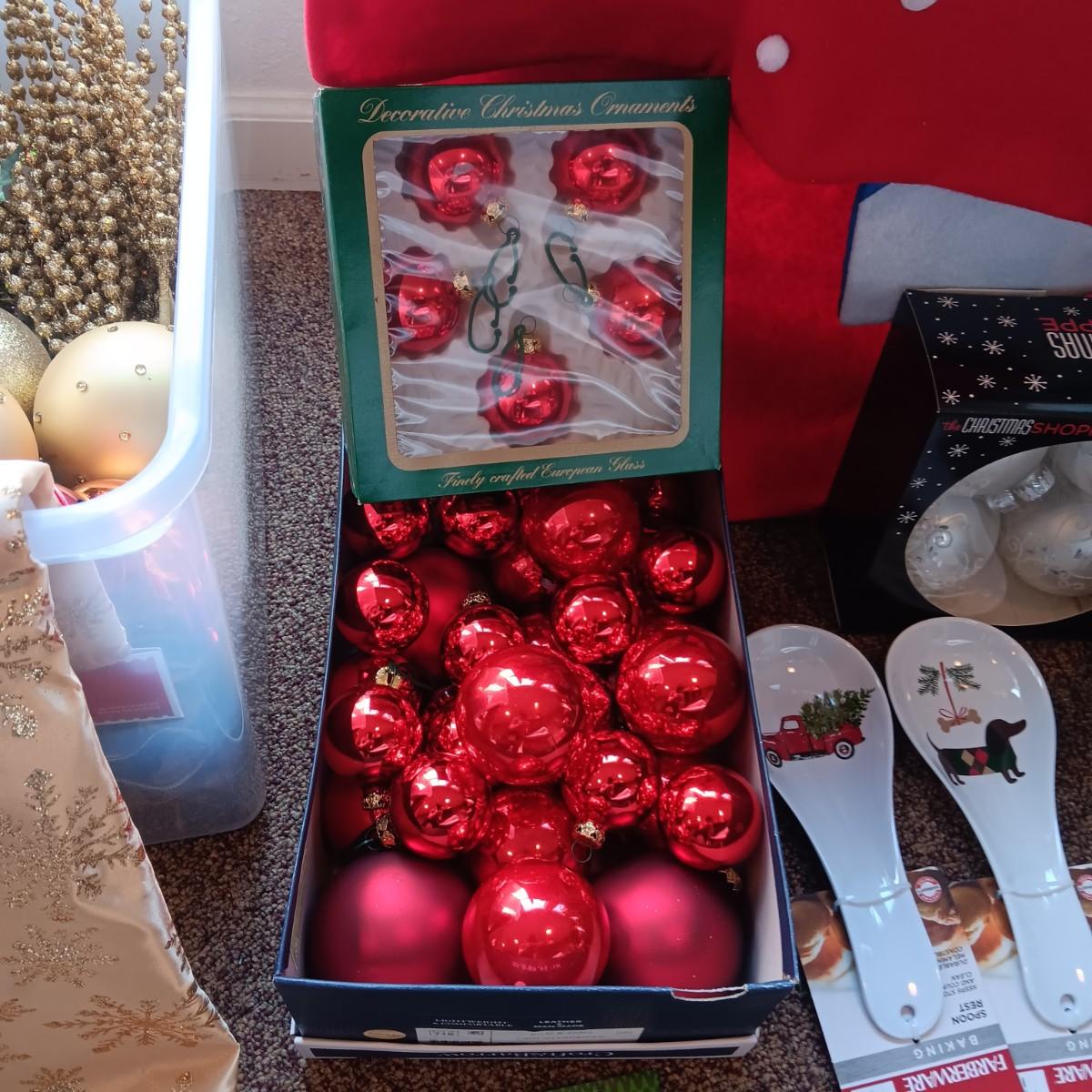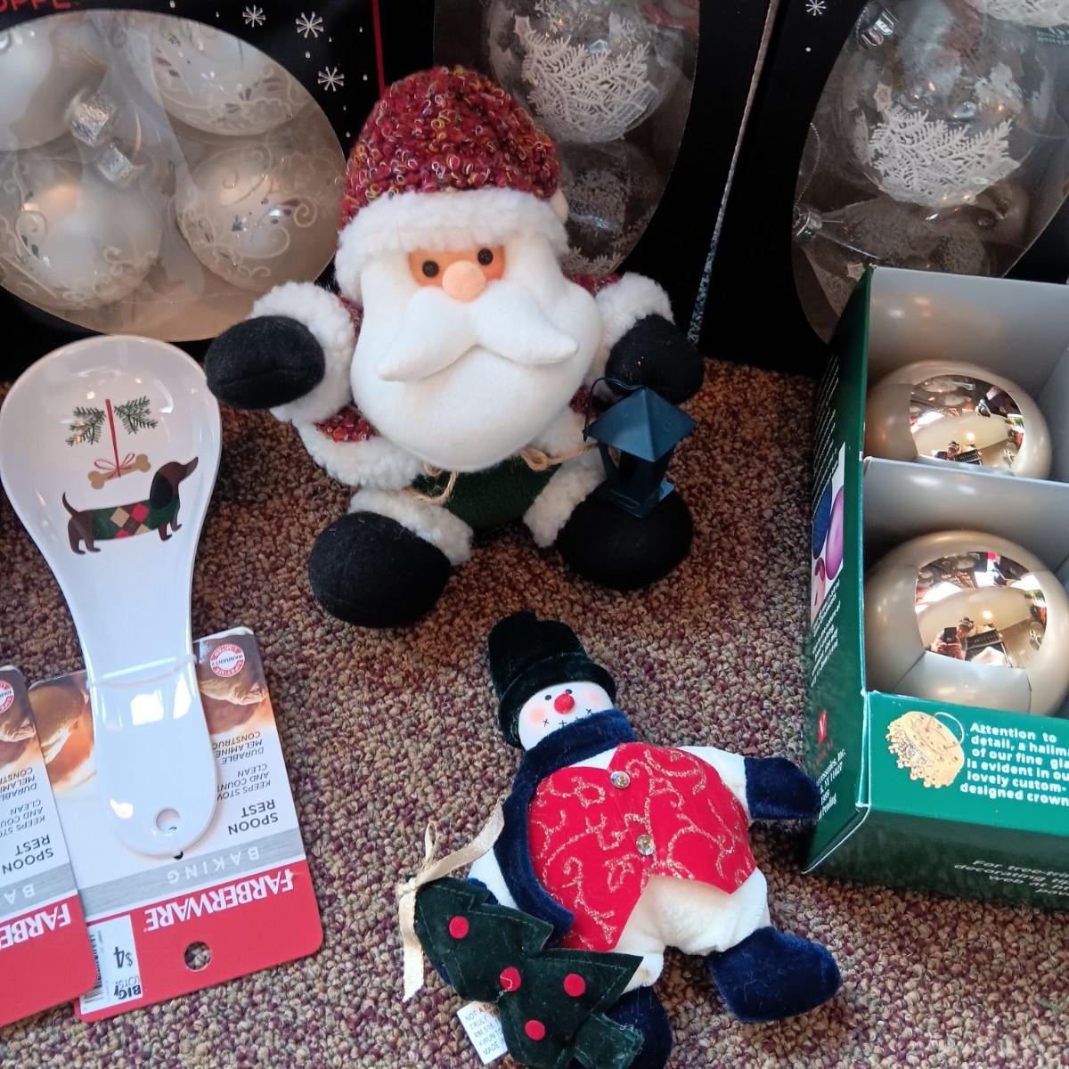 CHRISTMAS DECORATIONS, 2 TOTES AND AN AFGHAN HOLDER
