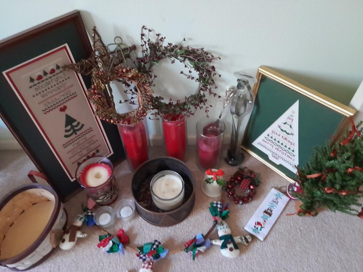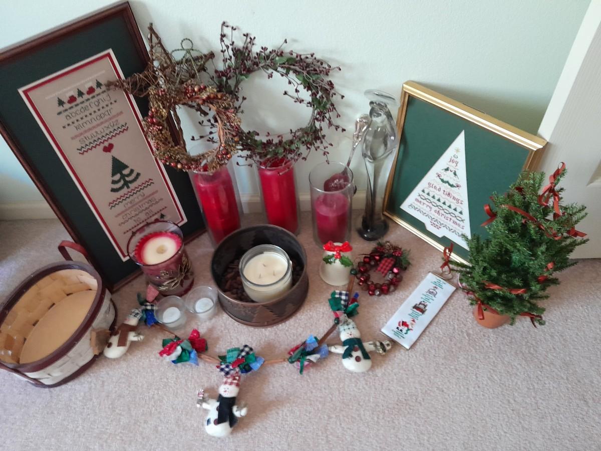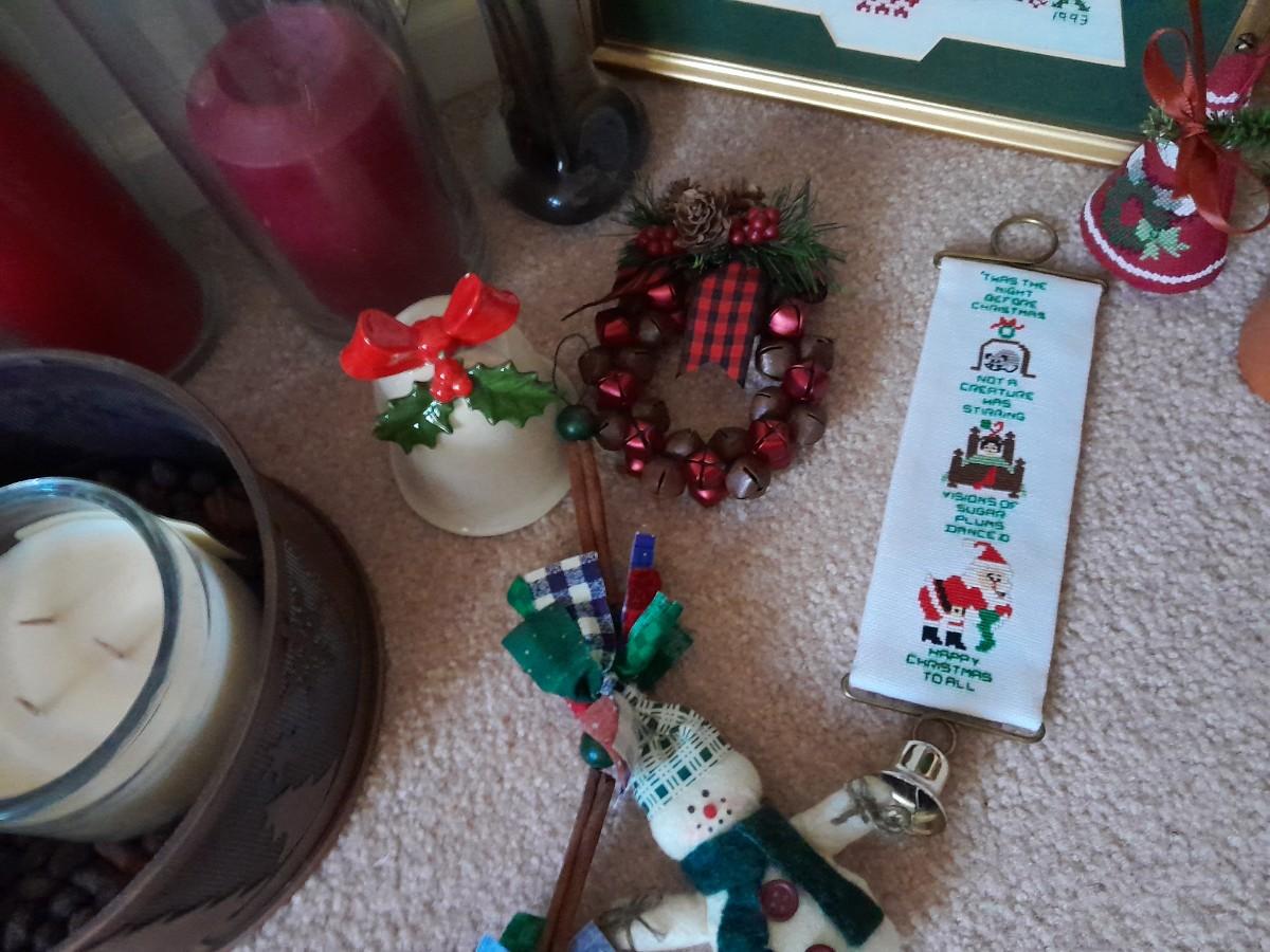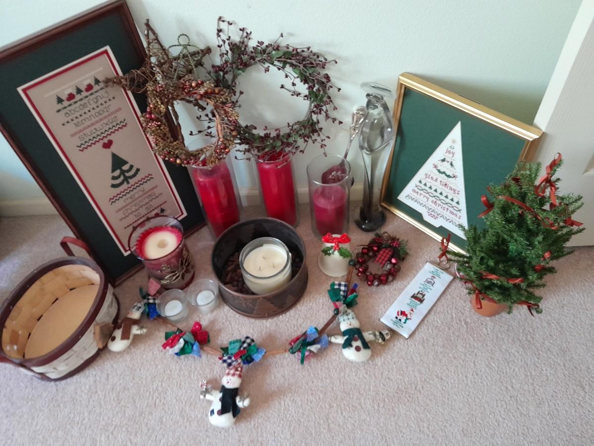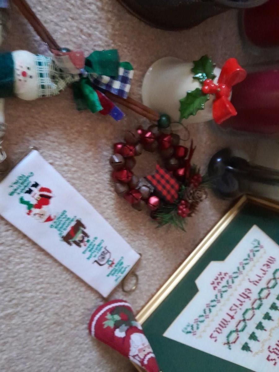 CHRISTMAS DECORATIONS SMALL WREATHS, CROSS STITCH ART, CANDLE HOLDER, STRING OF SNOWMEN AND MORE