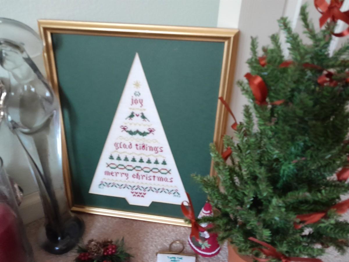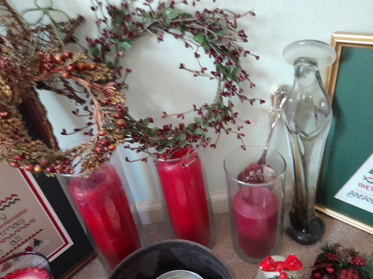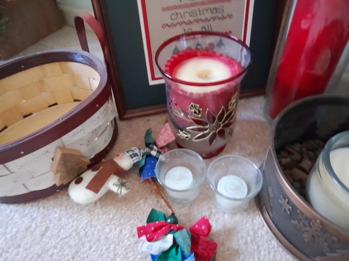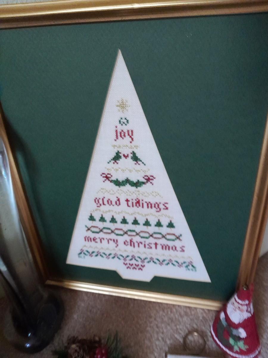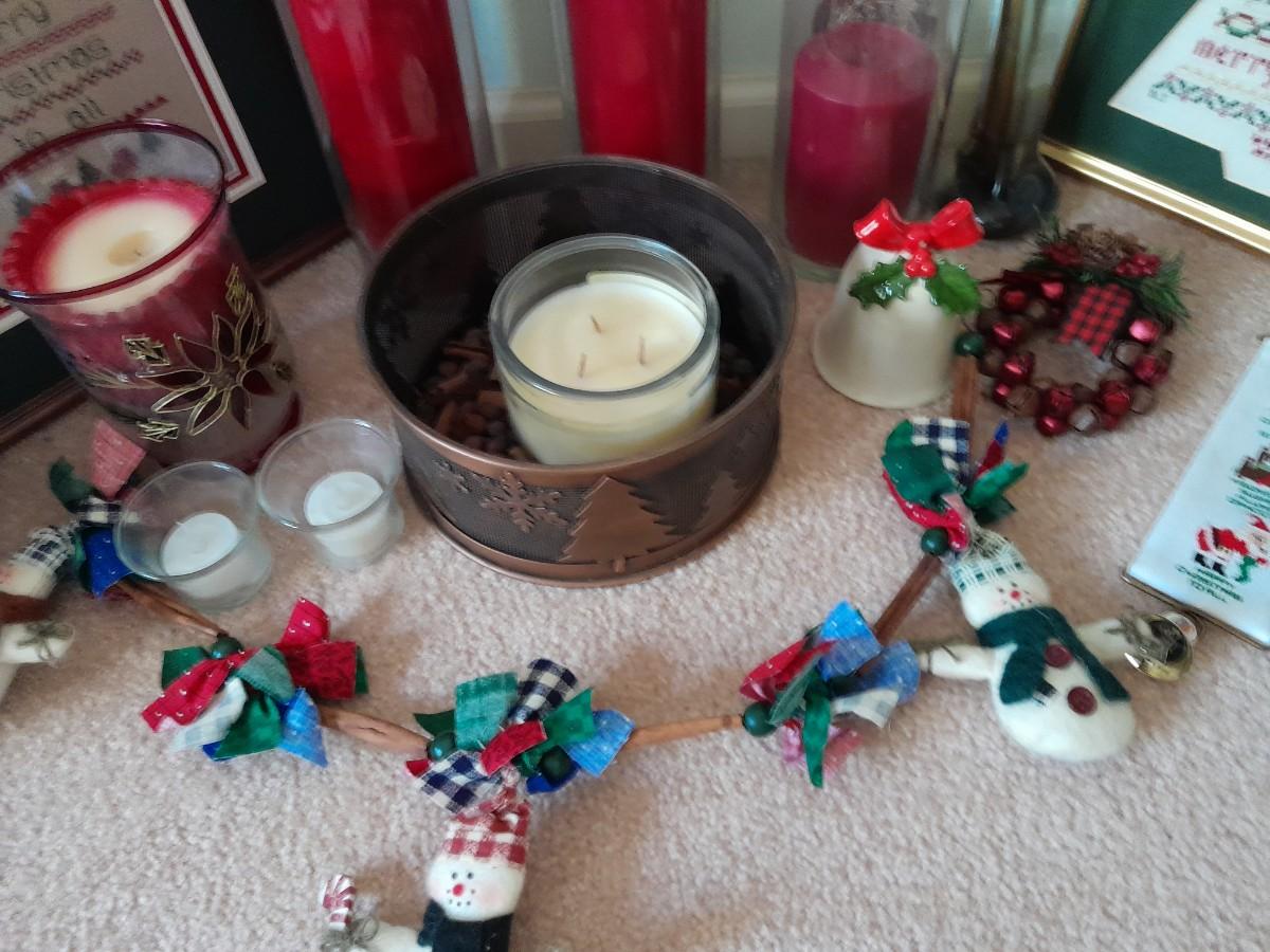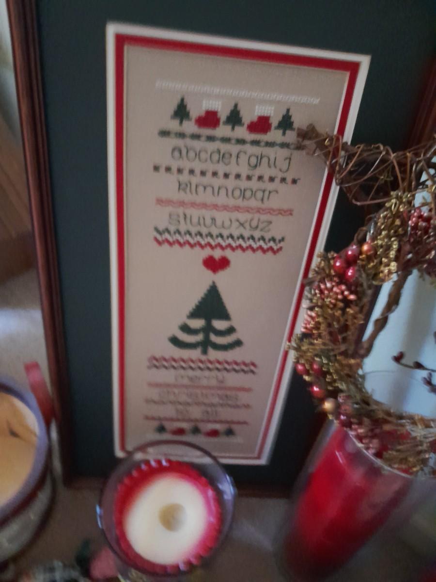 CHRISTMAS DECORATIONS SMALL WREATHS, CROSS STITCH ART, CANDLE HOLDER, STRING OF SNOWMEN AND MORE