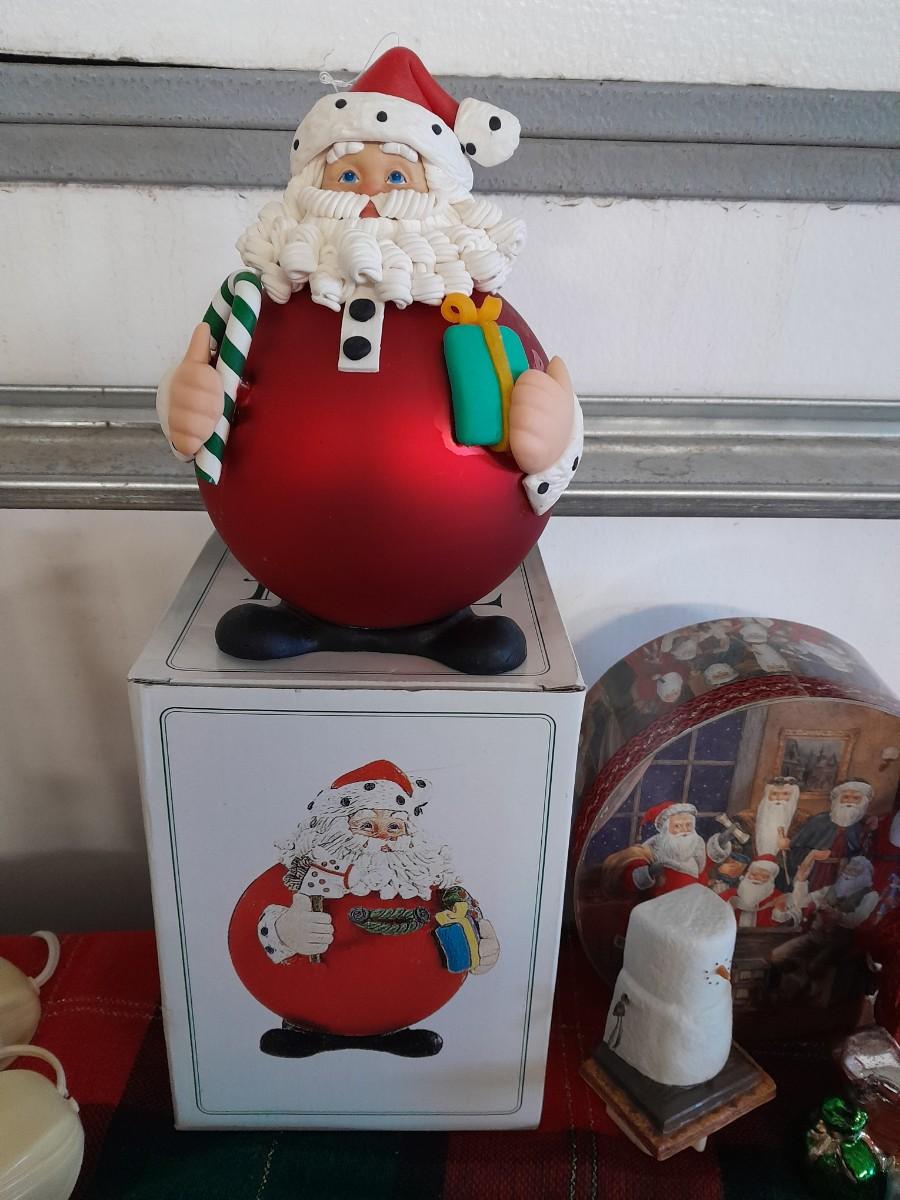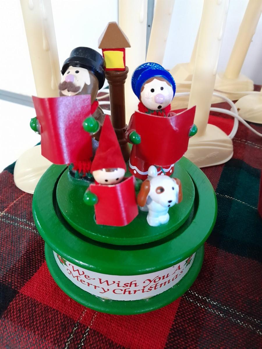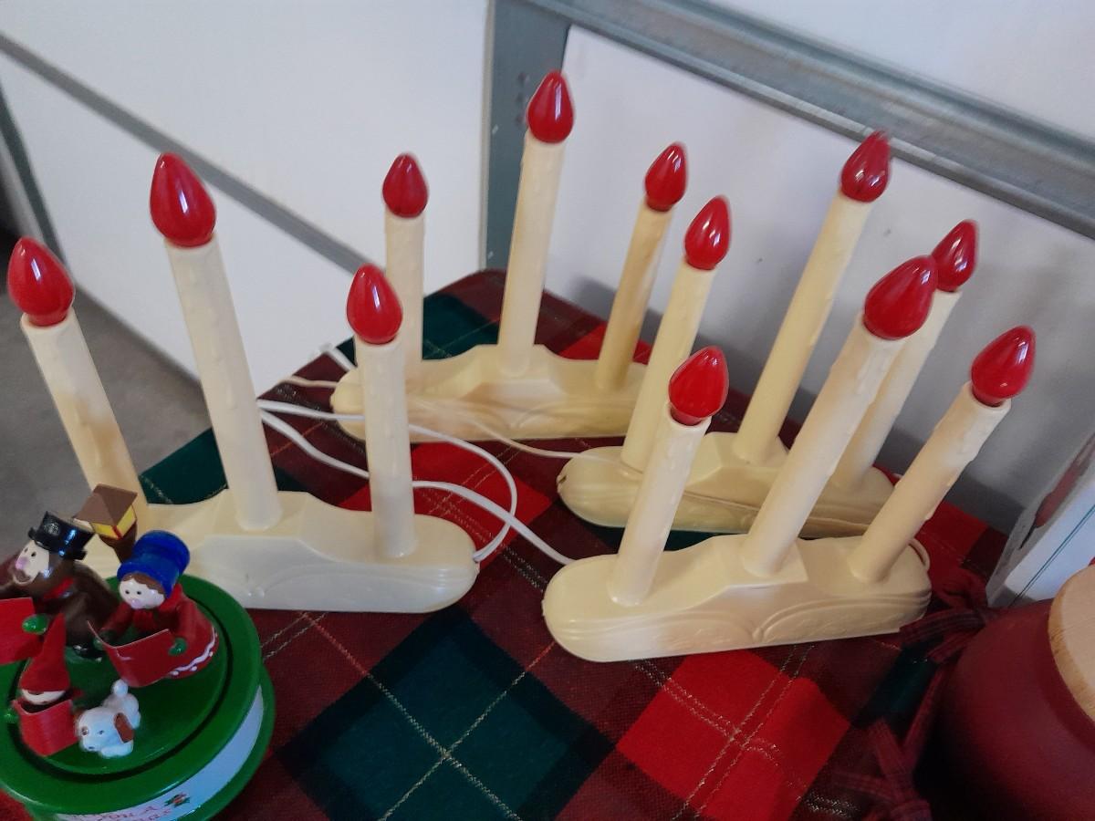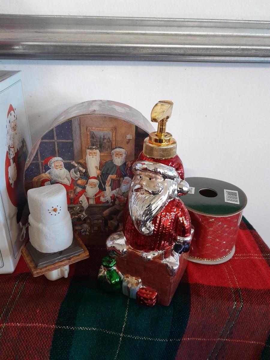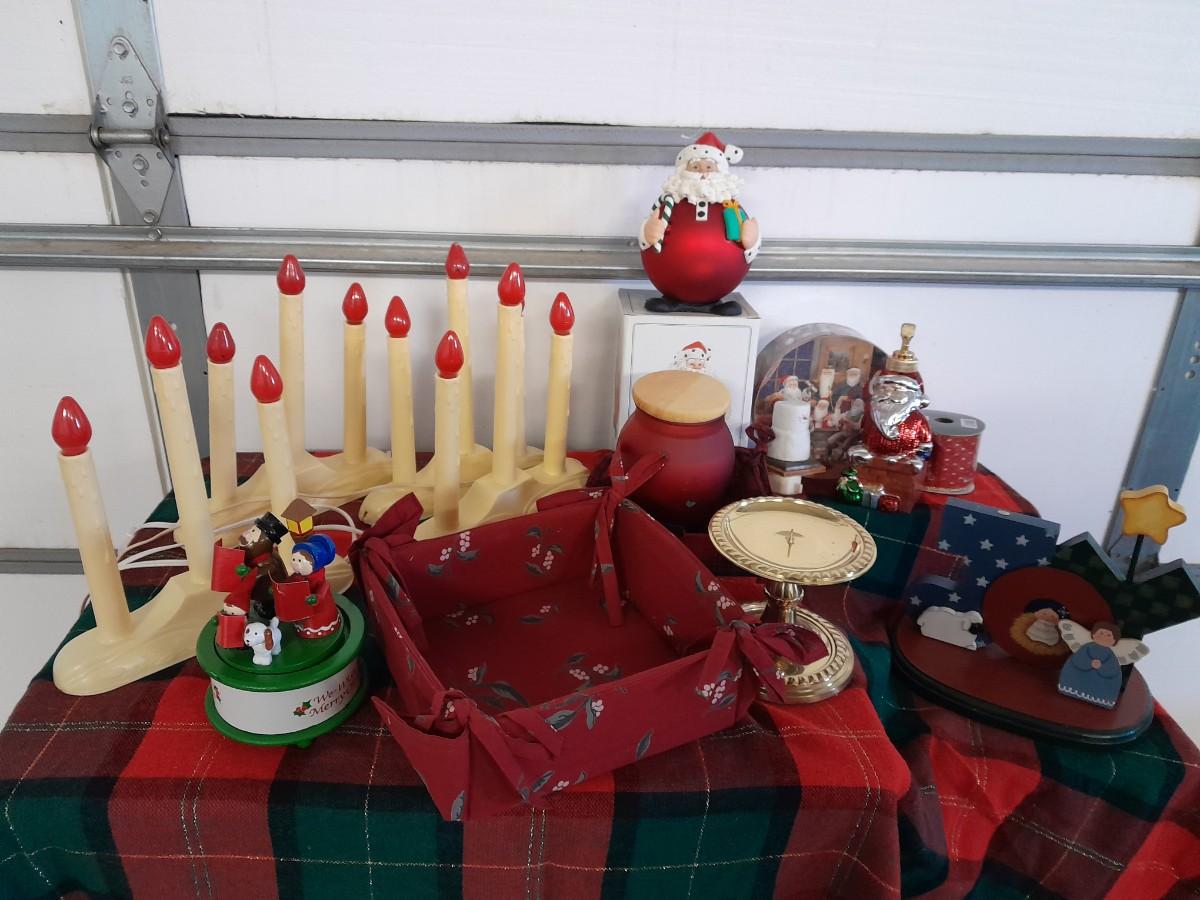 ELECTRIC LIGHTED CANDOLIERS. CAROLERS MUSIC BOX, LINEN BASKET, JOLLY SANTA, CANDLES, SANTA SOAP DISPENSER, RIBBON AND MORE