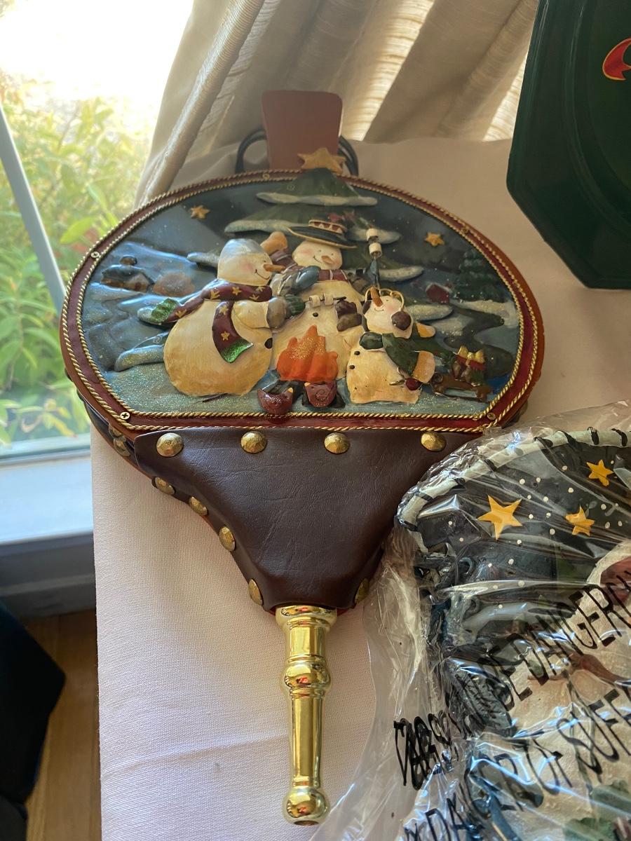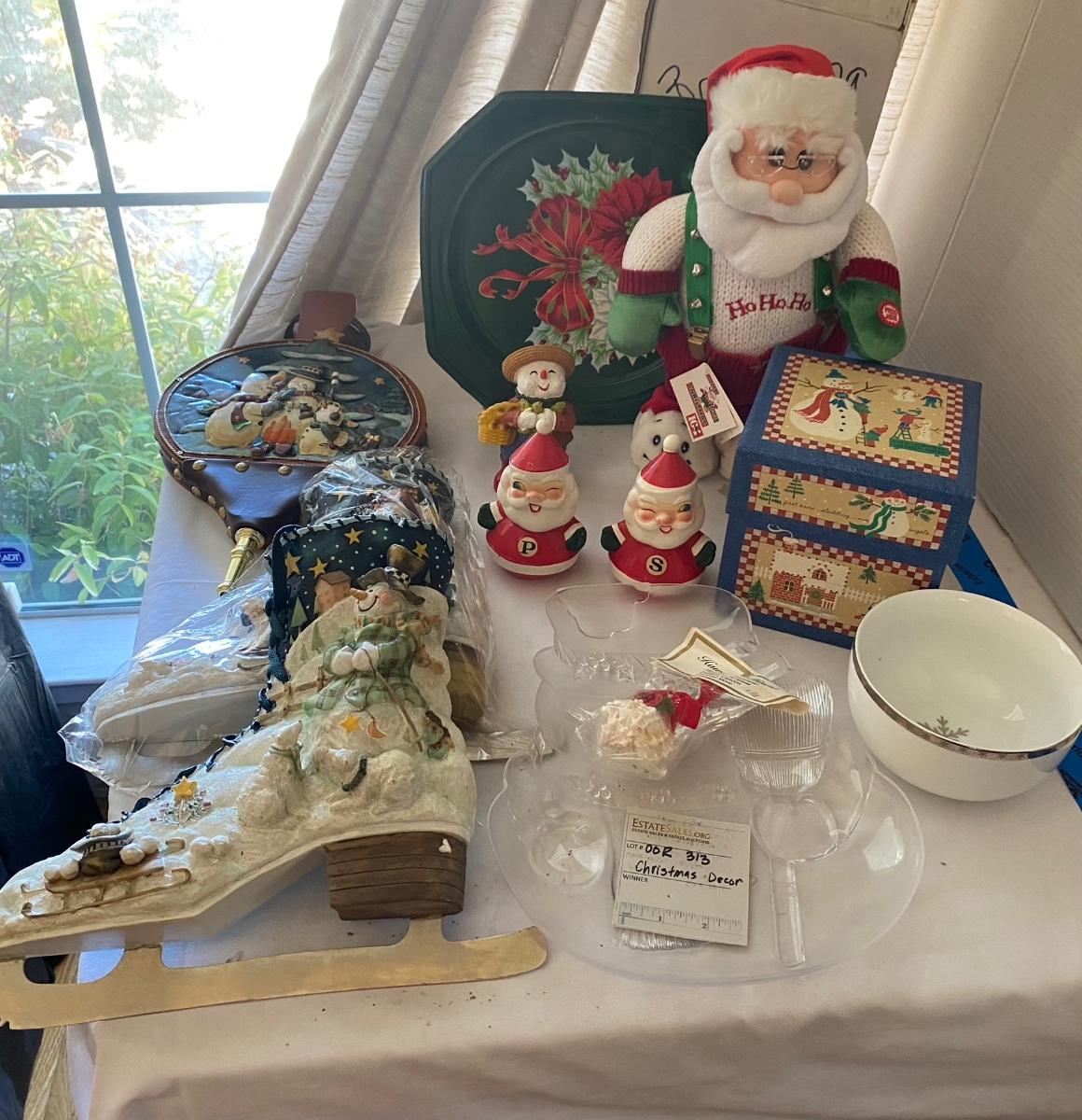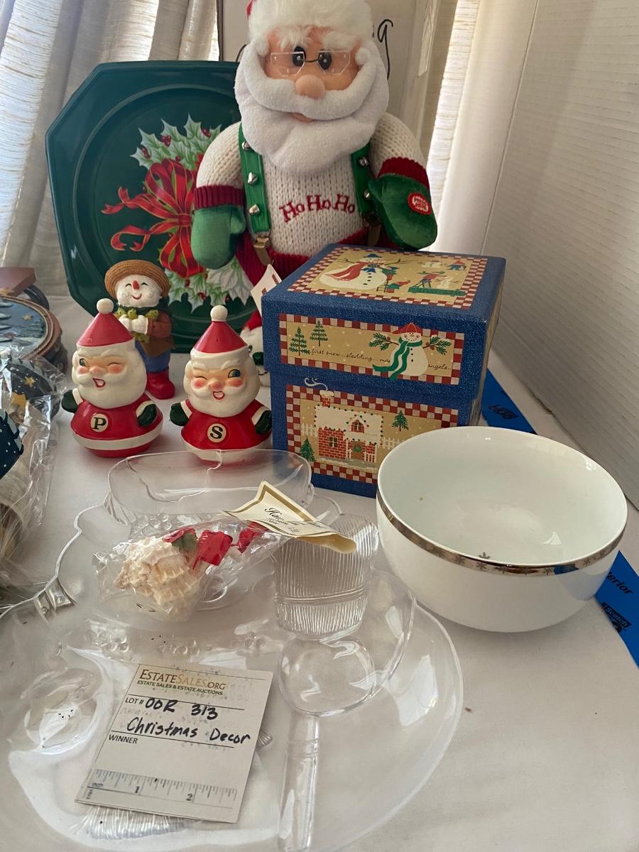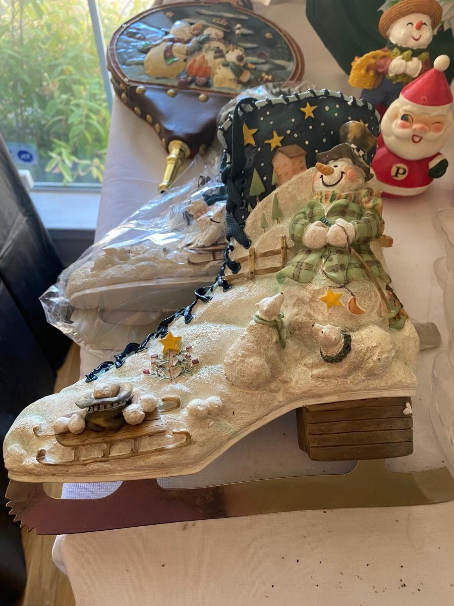 Ice skates wall decor, bouncing Santa, decorative snowman and Santa salt and pepper shakers.