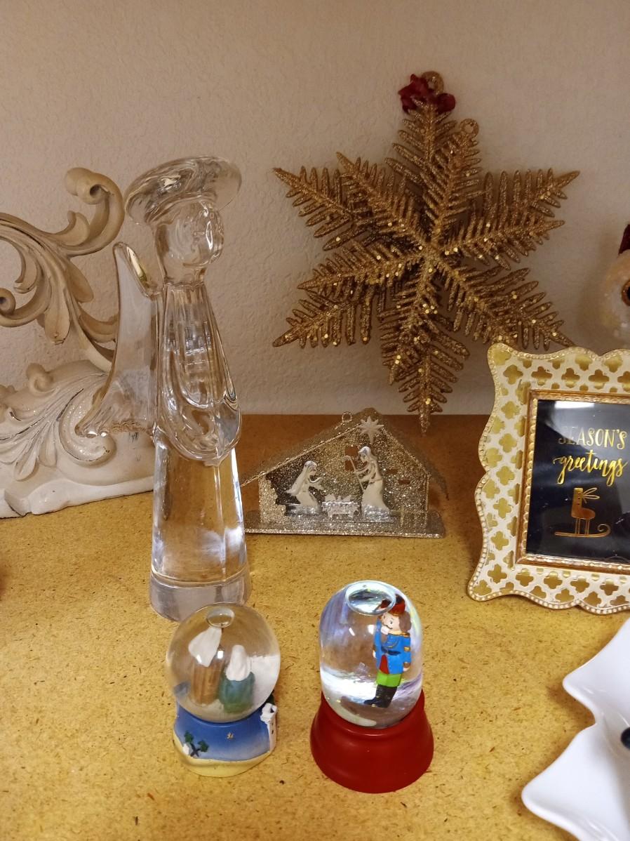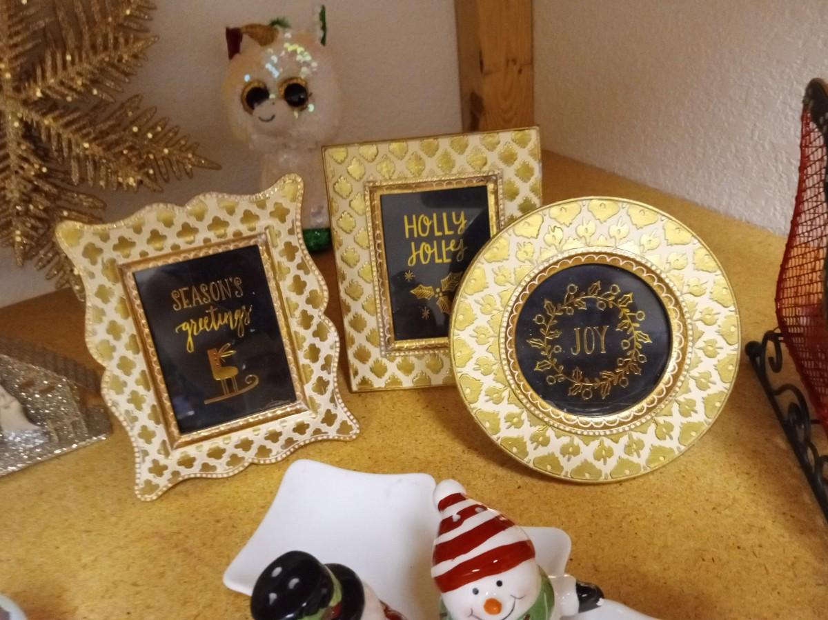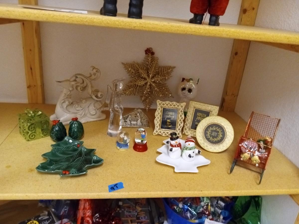 CHRISTMAS DECORATIONS AND 3 SMALL FRAMES