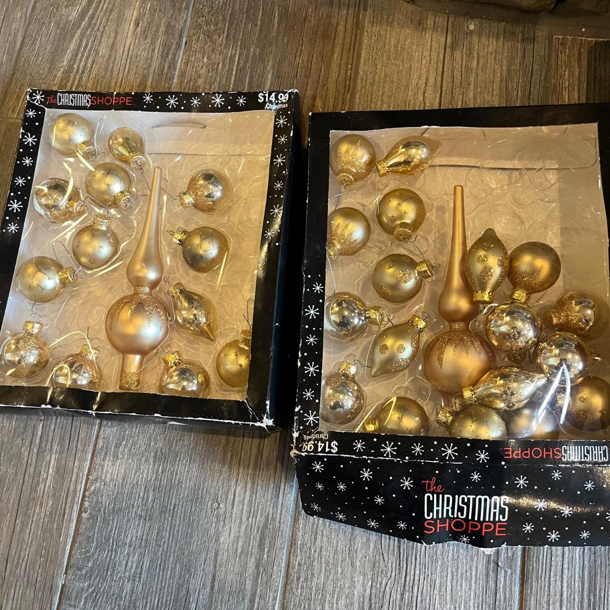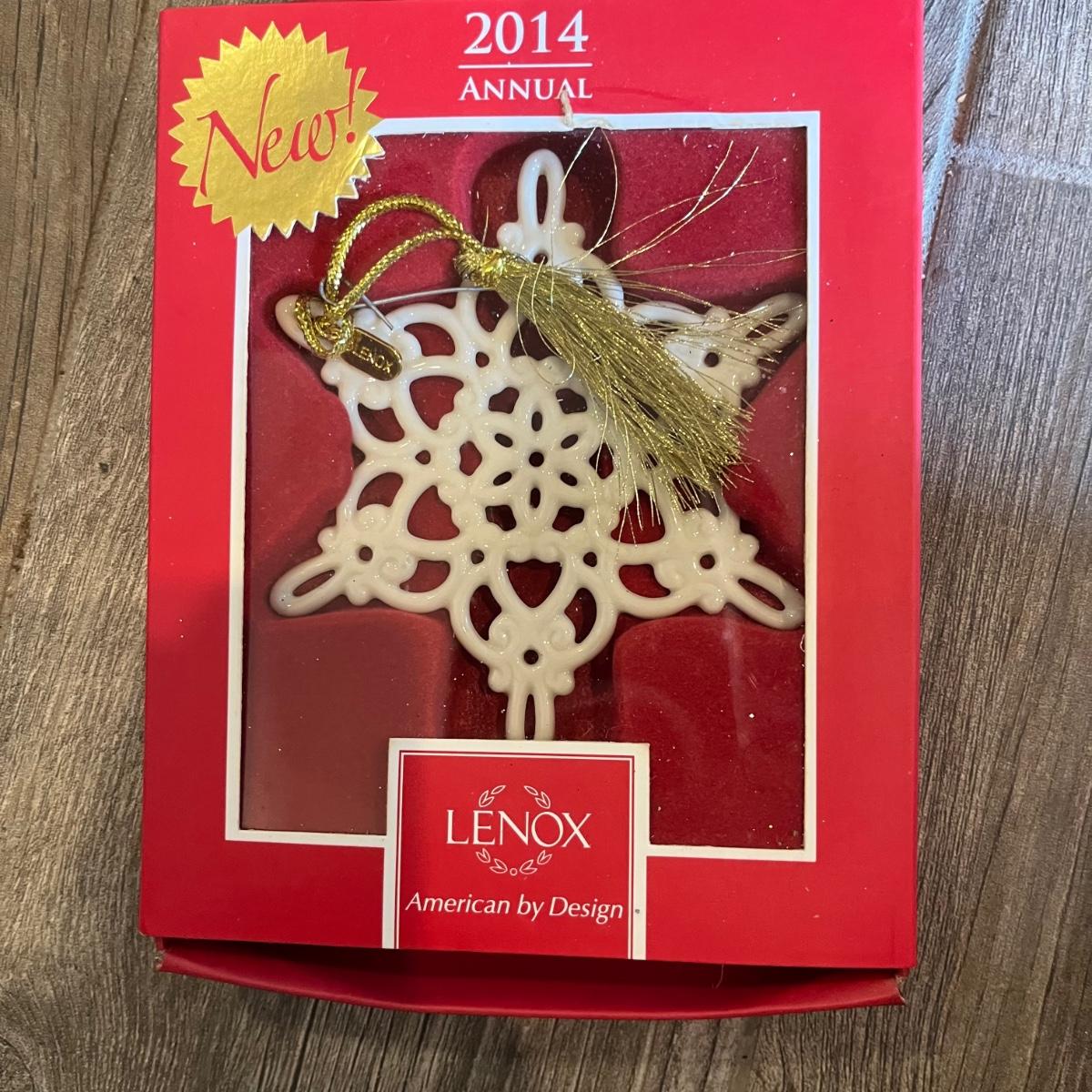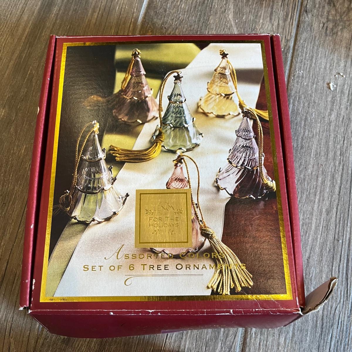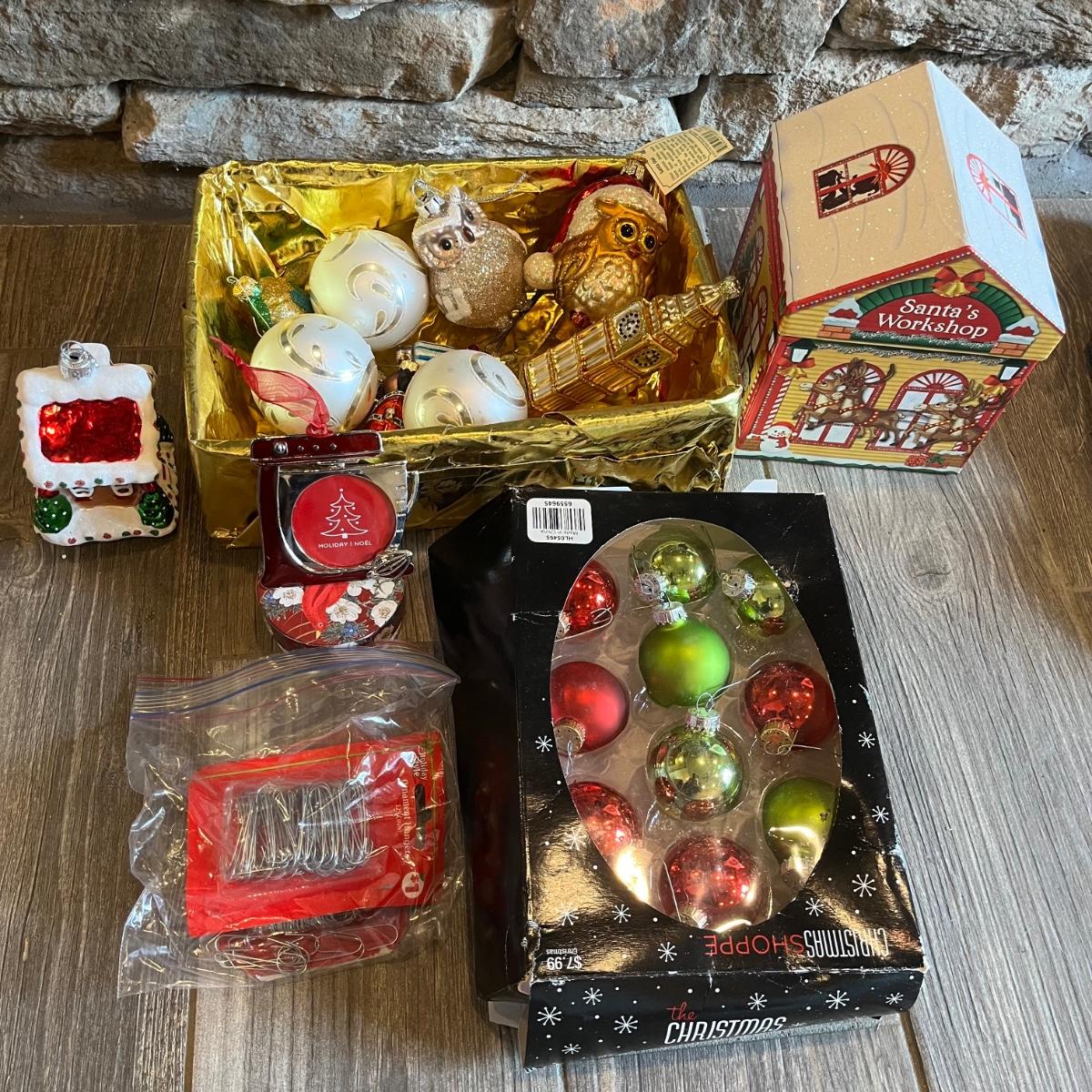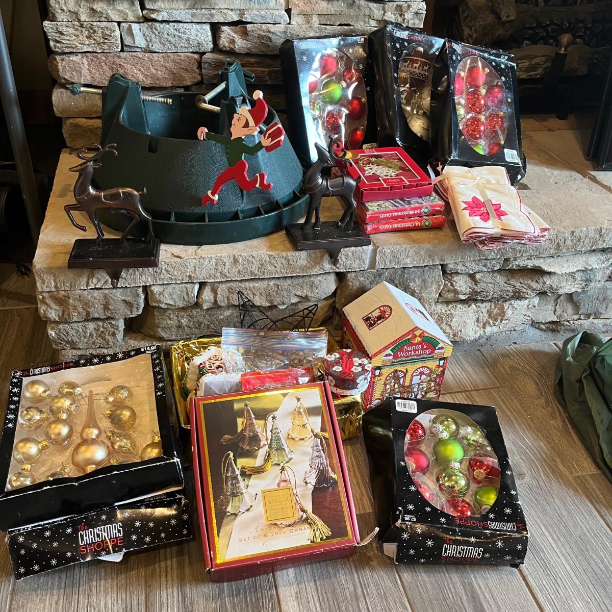 Lot includes Lenox Ornament and tree ornaments, tree stand, linens, pair of stocking holders and a selection of other ornaments.