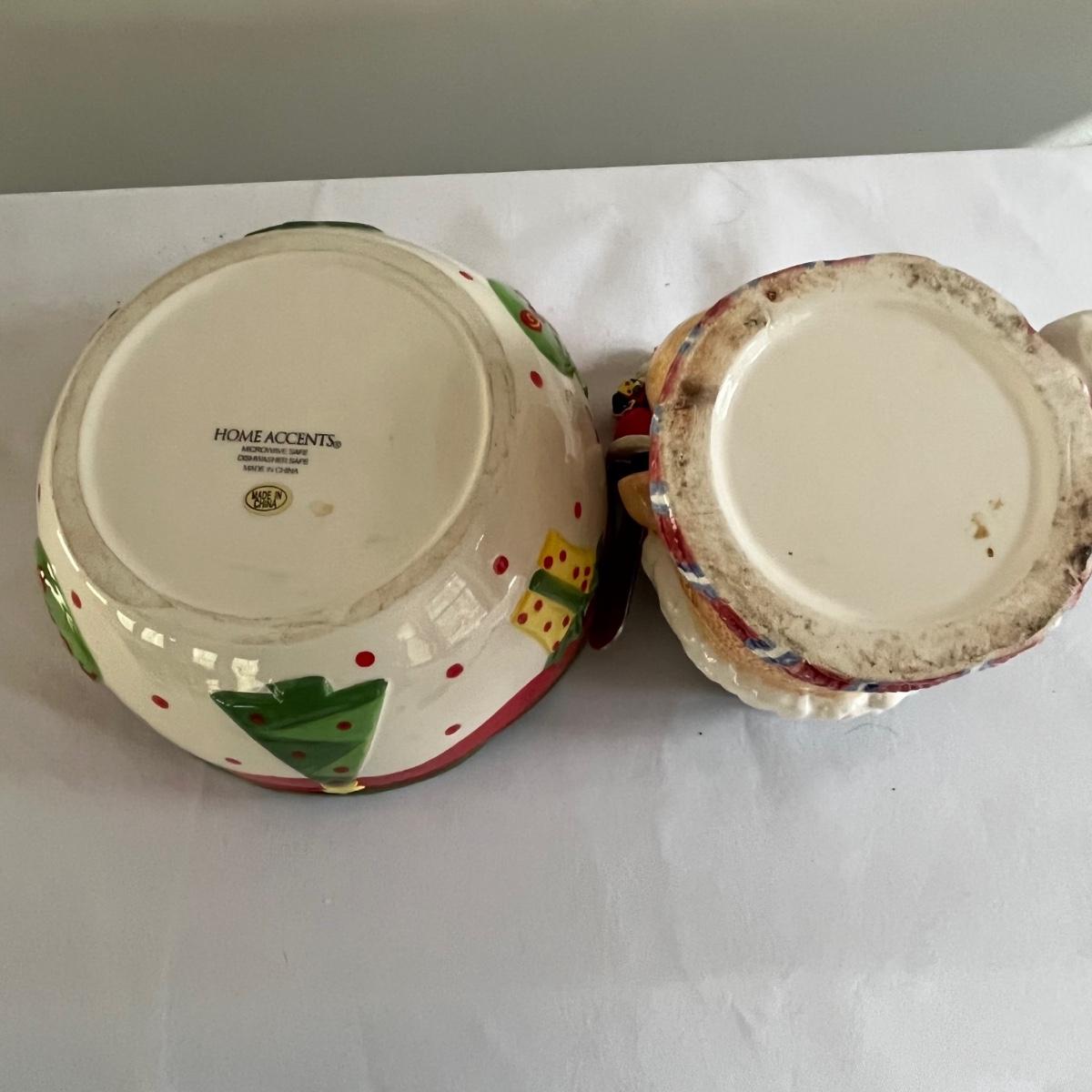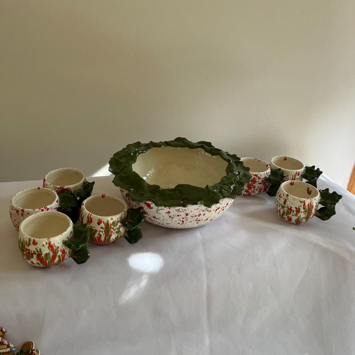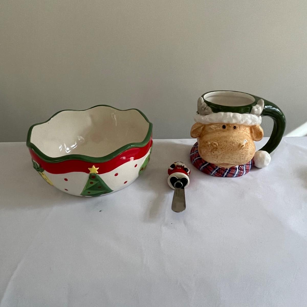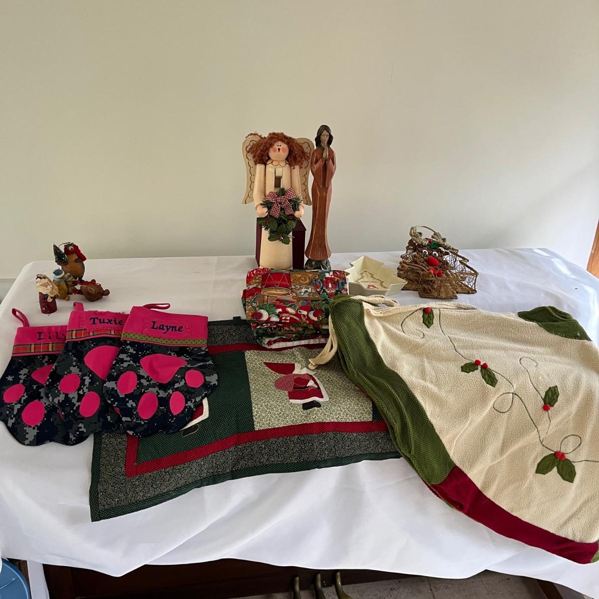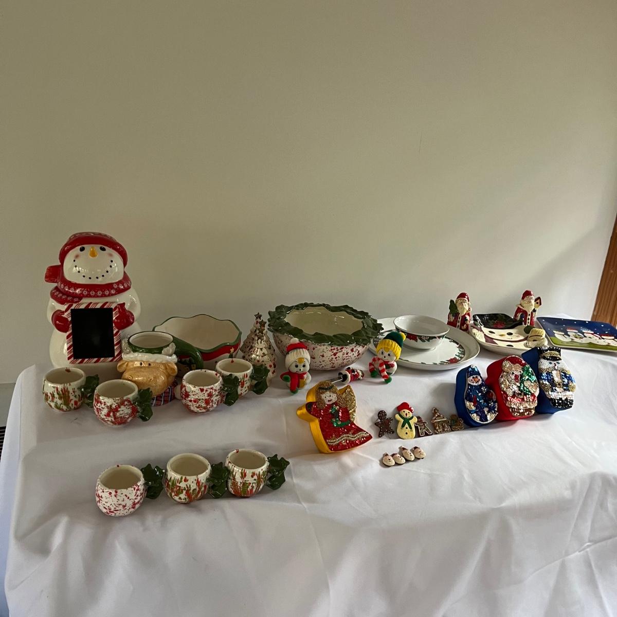 A collection of Christmas decorations in this lot that contains a snowman cookie jar, punch bowl and cups, bowl, mug, sequined storage boxes, wooden pins and more. Cookie jar measures 7”D x 12” tall. Also includes tree skirt, placemats, angel nutcracker, Christmas tree shaped decorations, La Bien Ceramic ornament, three dog stockings and resin figurines.