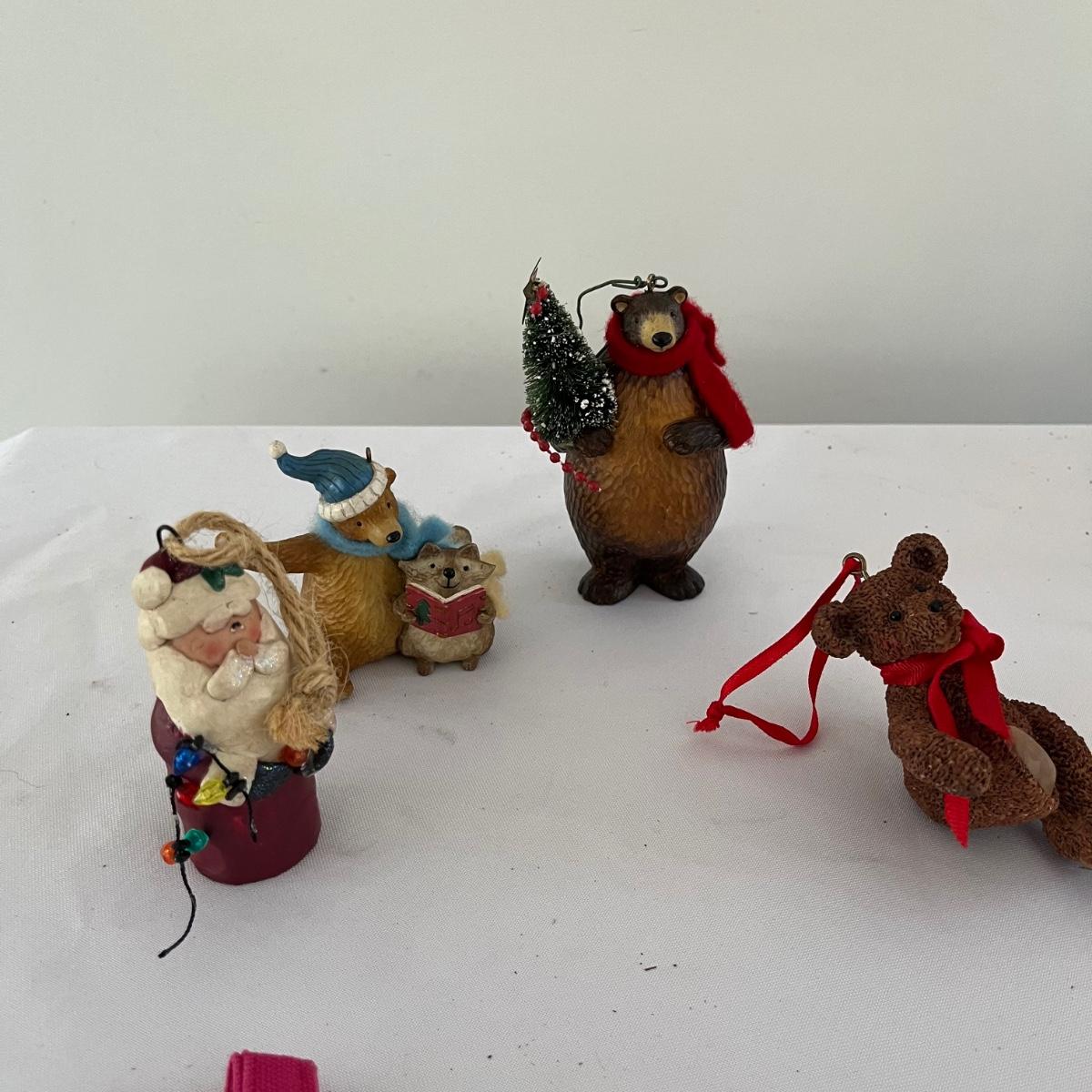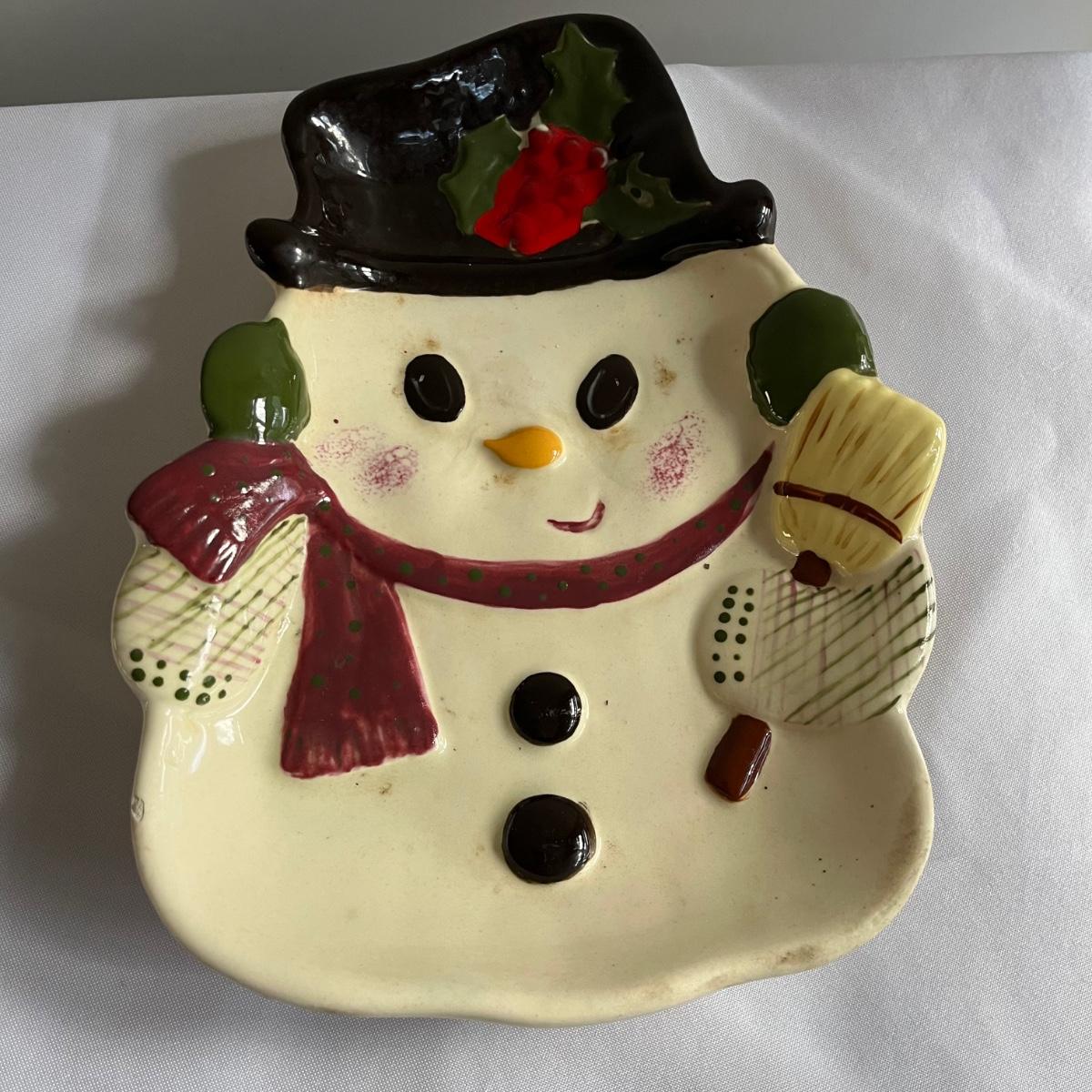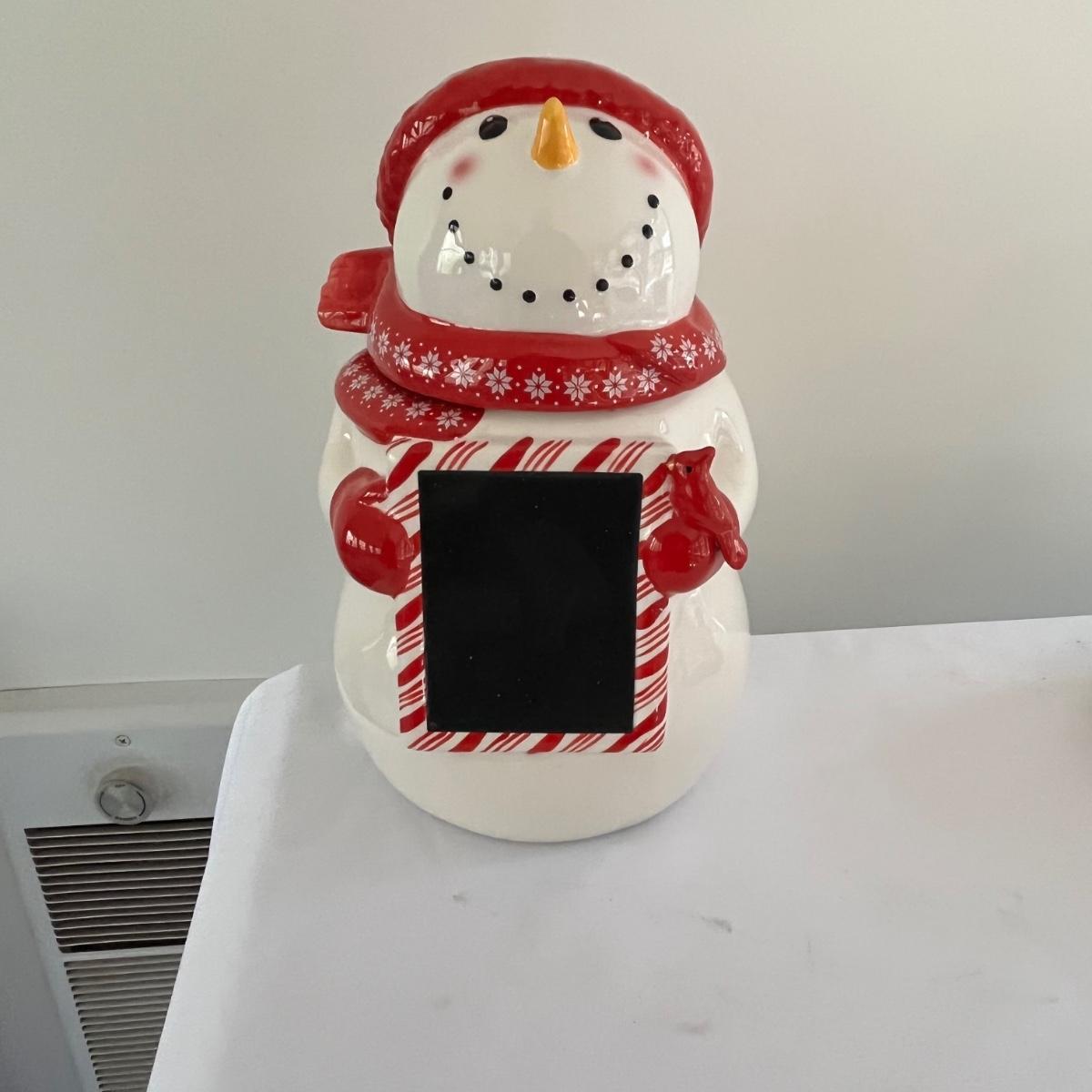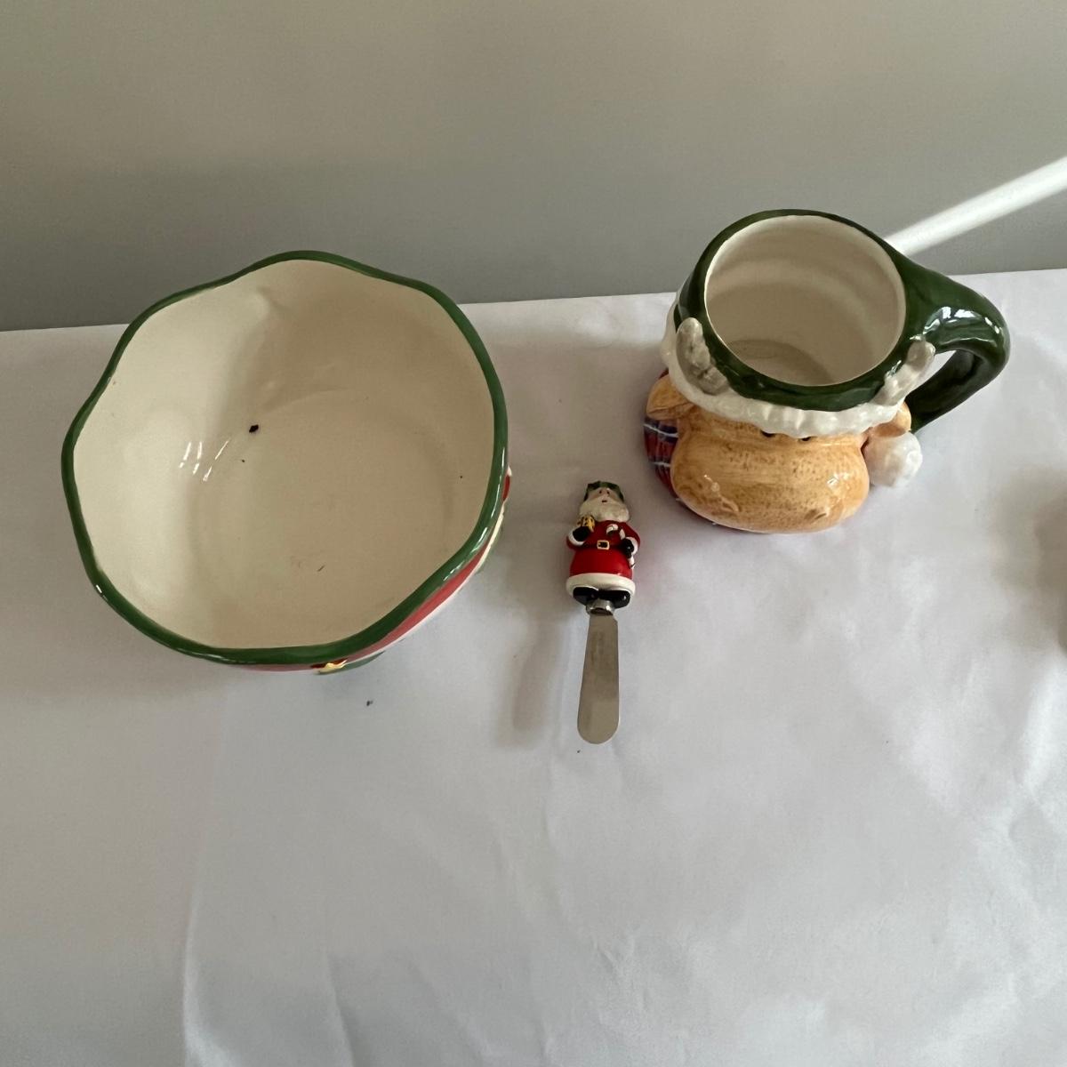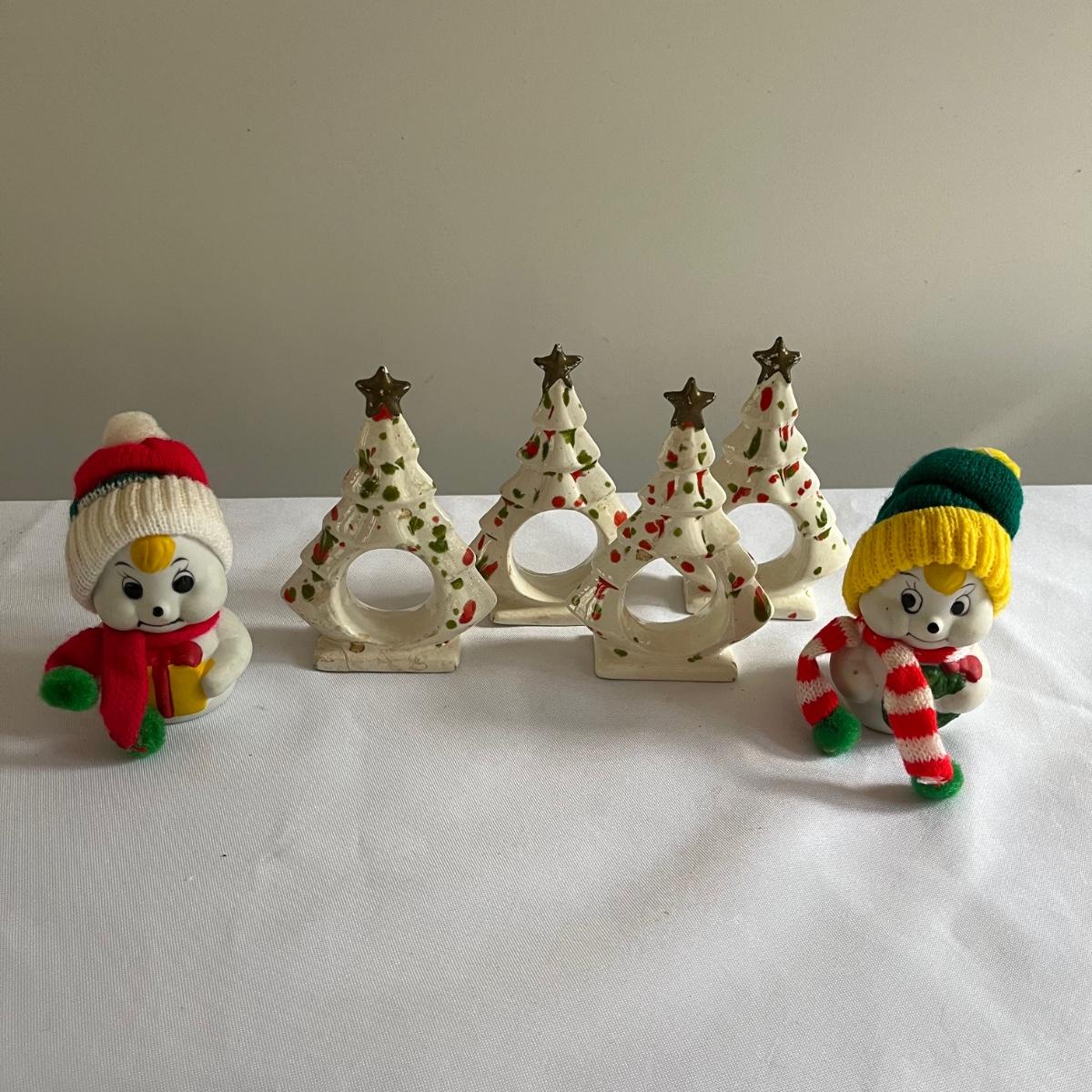 A collection of Christmas decorations in this lot that contains a snowman cookie jar, punch bowl and cups, bowl, mug, sequined storage boxes, wooden pins and more. Cookie jar measures 7”D x 12” tall. Also includes tree skirt, placemats, angel nutcracker, Christmas tree shaped decorations, La Bien Ceramic ornament, three dog stockings and resin figurines.