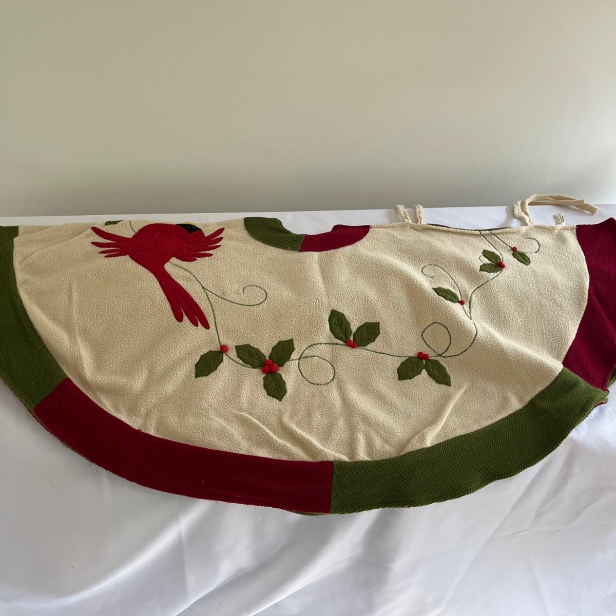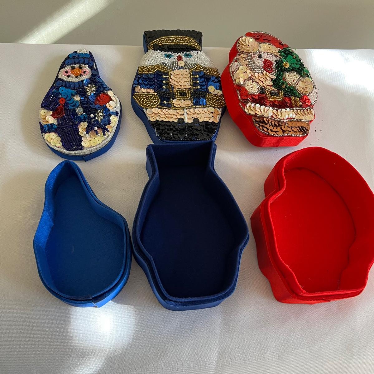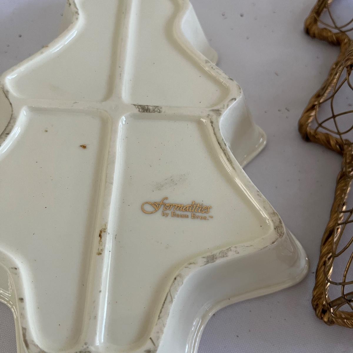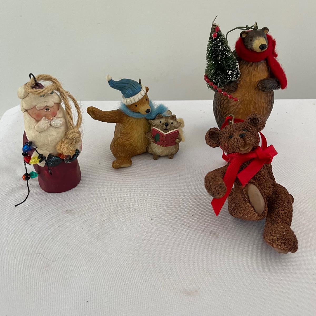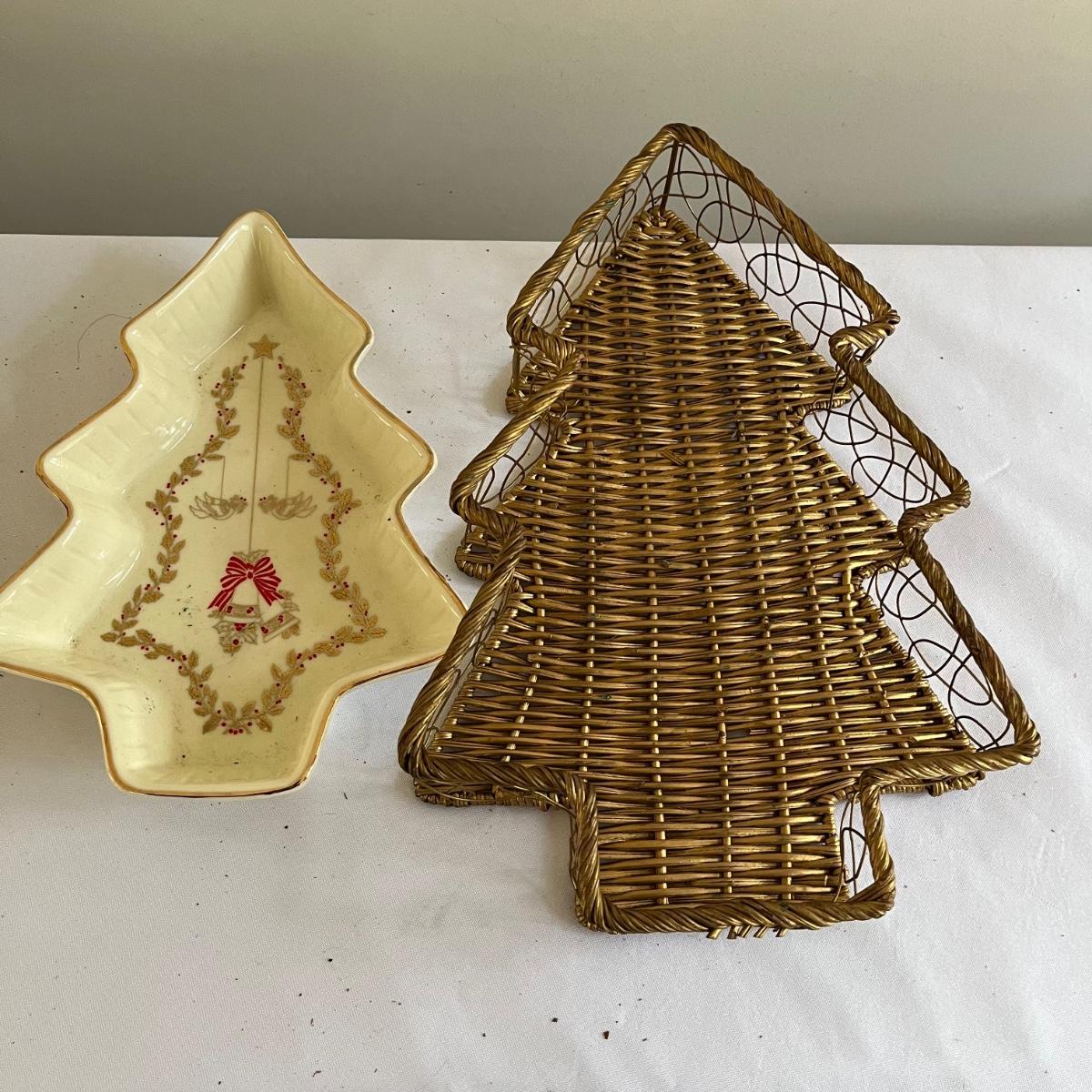A collection of Christmas decorations in this lot that contains a snowman cookie jar, punch bowl and cups, bowl, mug, sequined storage boxes, wooden pins and more. Cookie jar measures 7”D x 12” tall. Also includes tree skirt, placemats, angel nutcracker, Christmas tree shaped decorations, La Bien Ceramic ornament, three dog stockings and resin figurines.