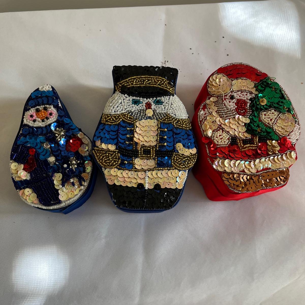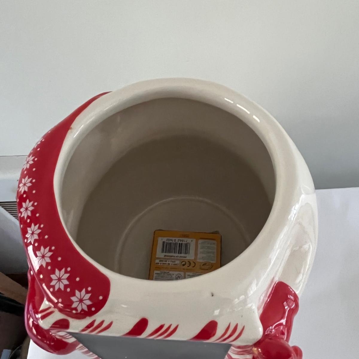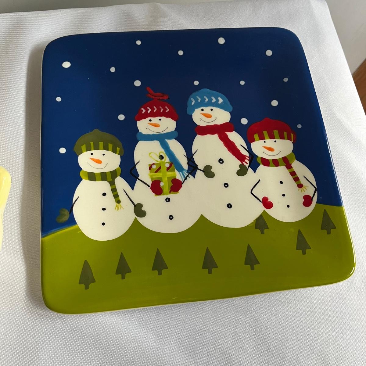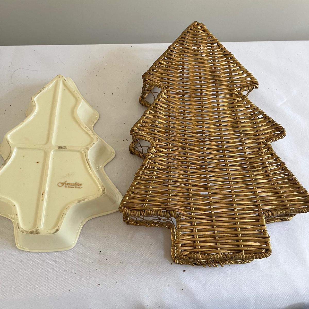 A collection of Christmas decorations in this lot that contains a snowman cookie jar, punch bowl and cups, bowl, mug, sequined storage boxes, wooden pins and more. Cookie jar measures 7”D x 12” tall. Also includes tree skirt, placemats, angel nutcracker, Christmas tree shaped decorations, La Bien Ceramic ornament, three dog stockings and resin figurines.