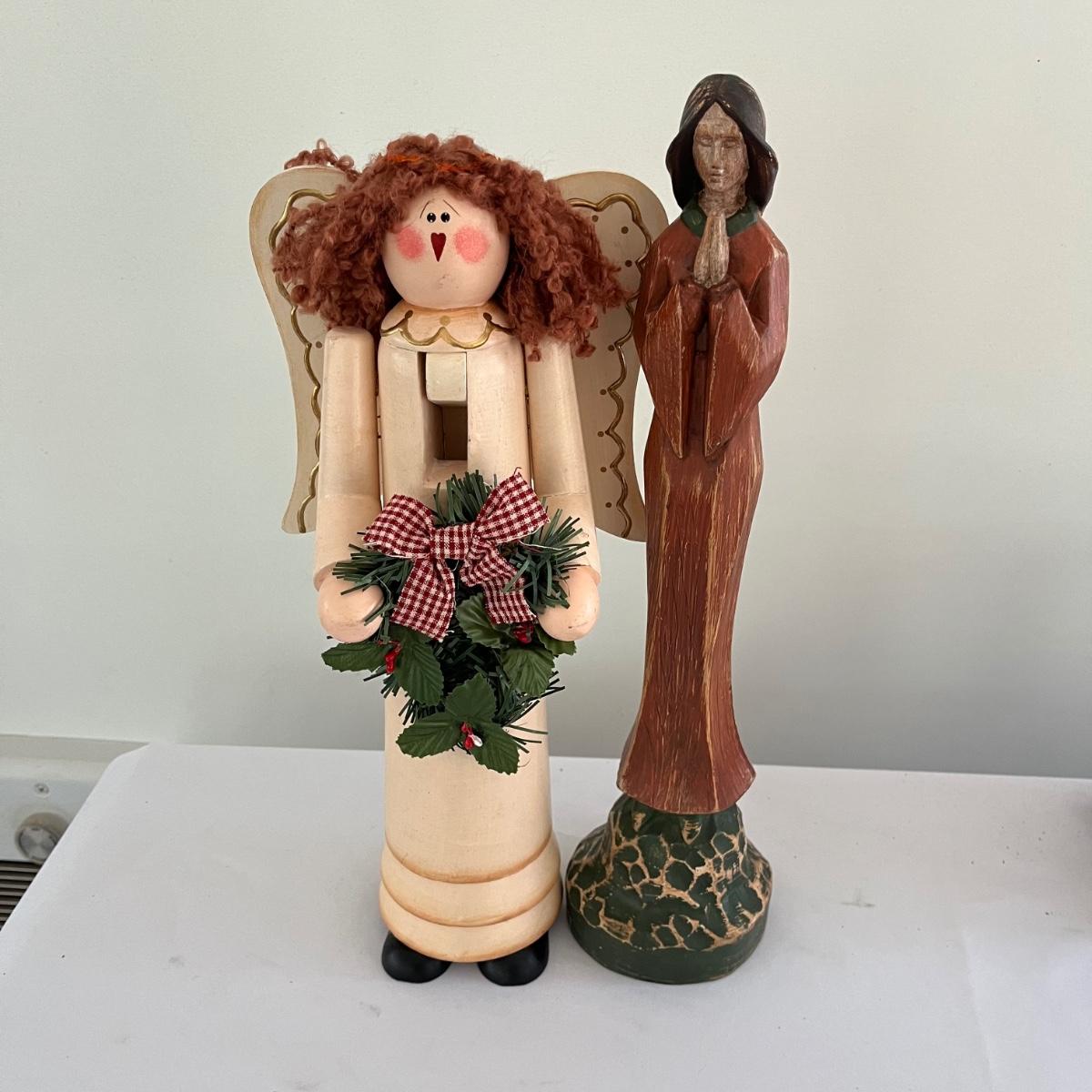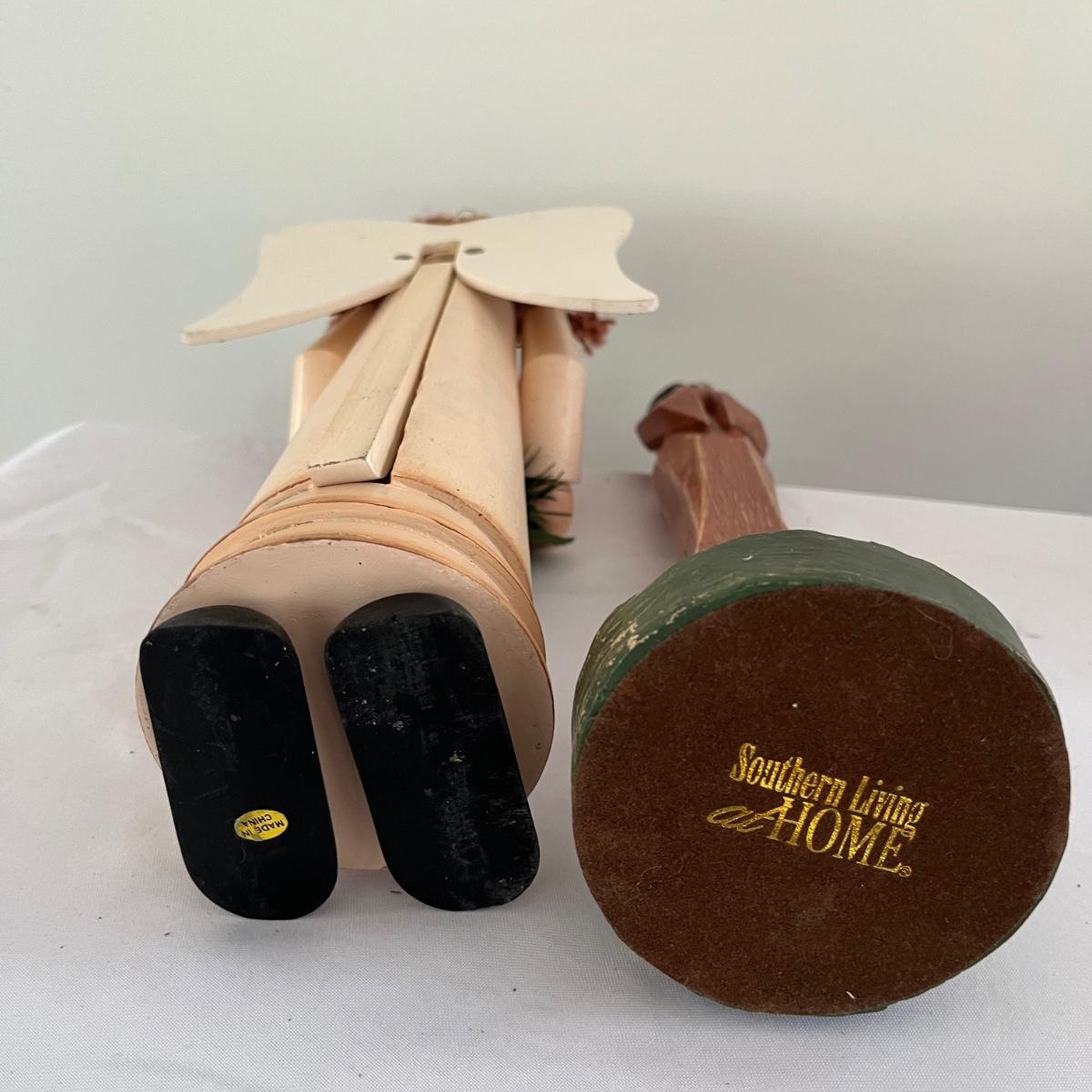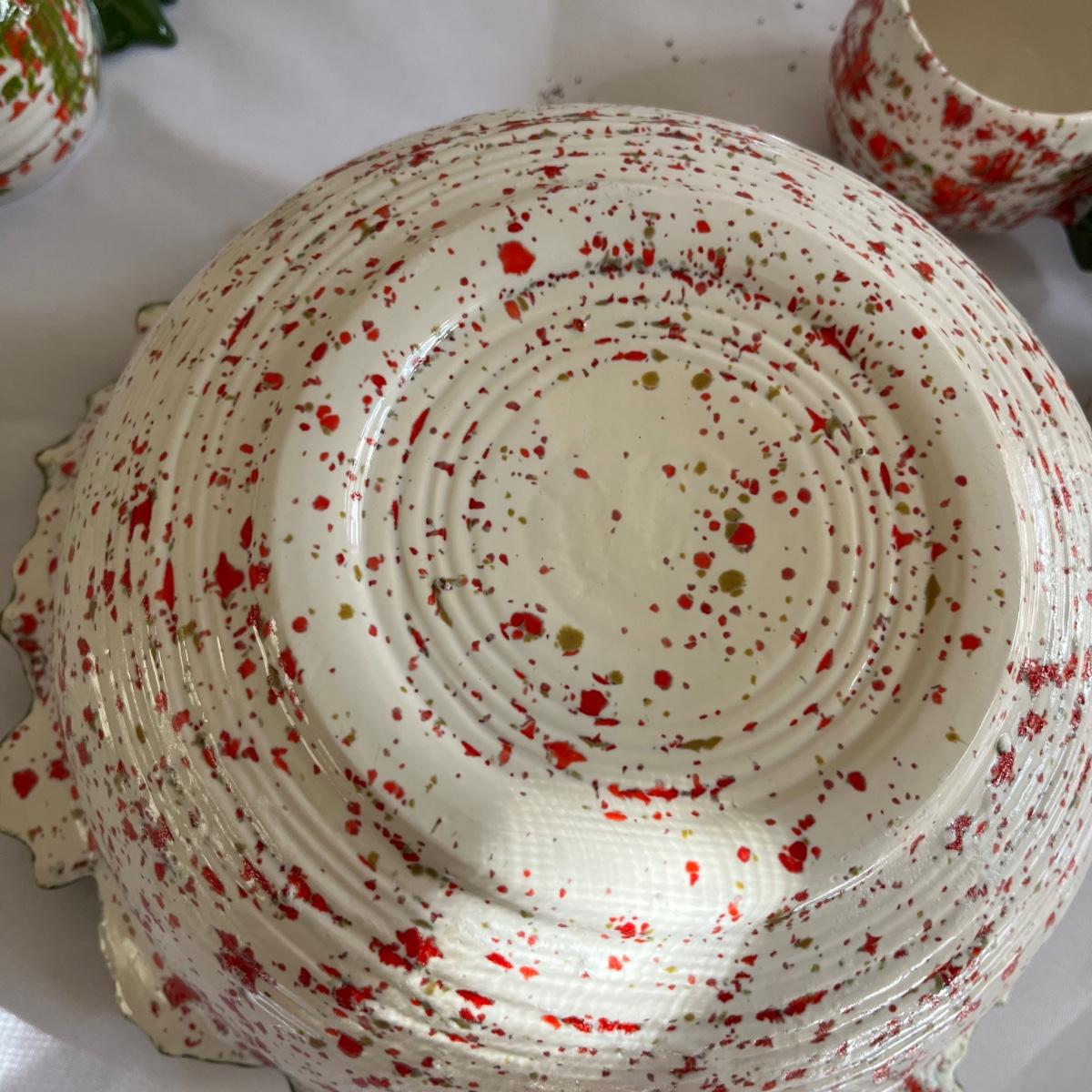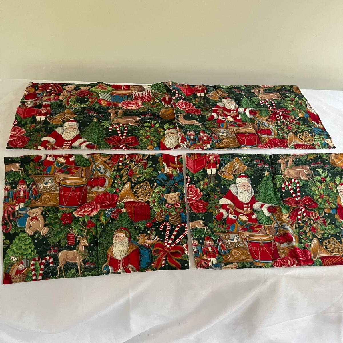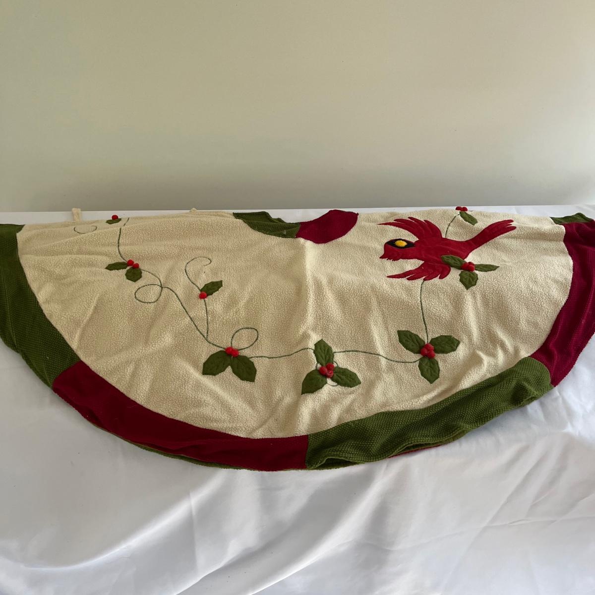 A collection of Christmas decorations in this lot that contains a snowman cookie jar, punch bowl and cups, bowl, mug, sequined storage boxes, wooden pins and more. Cookie jar measures 7”D x 12” tall. Also includes tree skirt, placemats, angel nutcracker, Christmas tree shaped decorations, La Bien Ceramic ornament, three dog stockings and resin figurines.