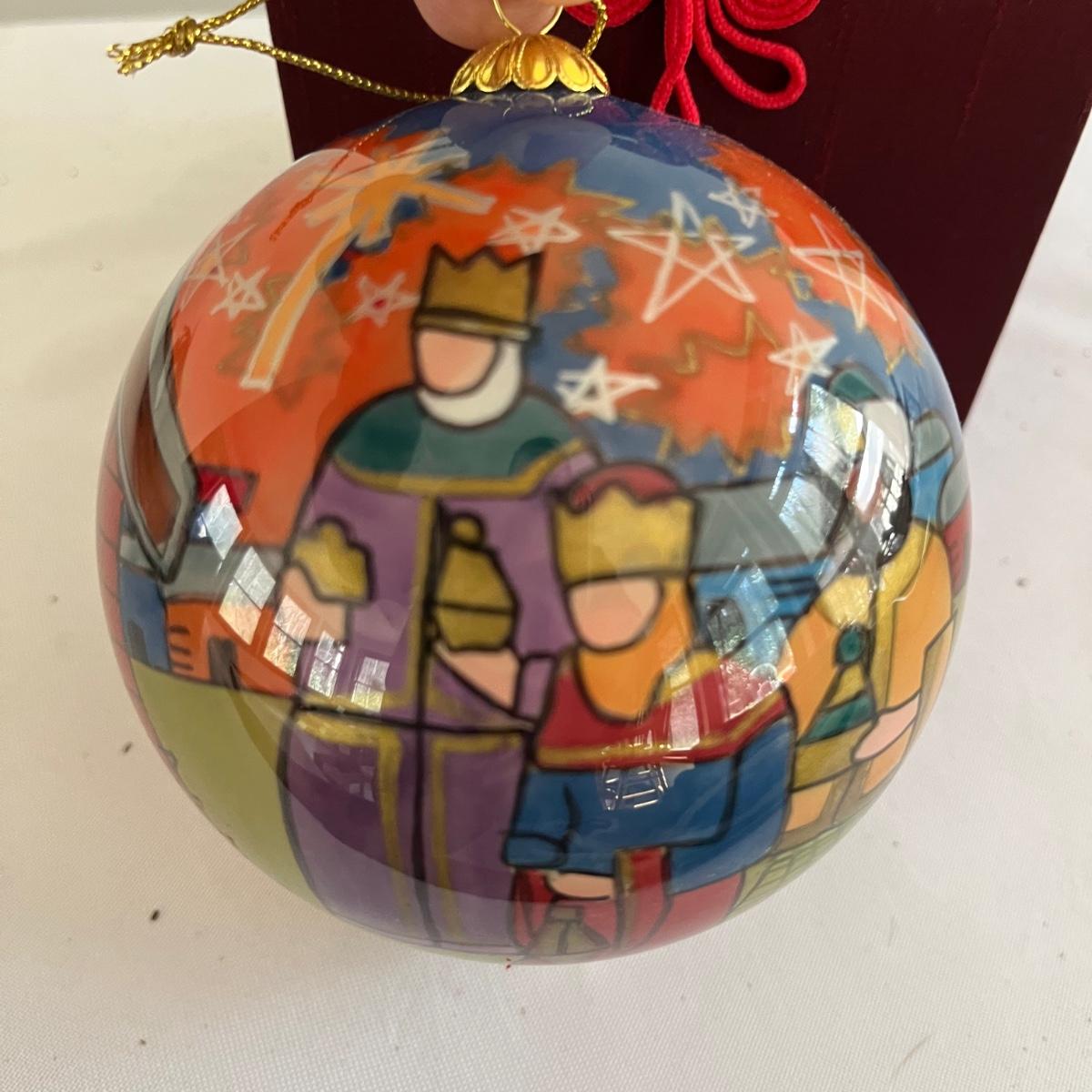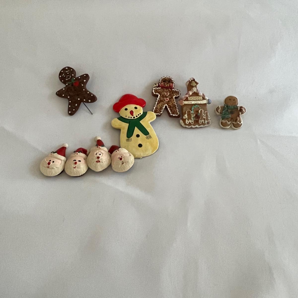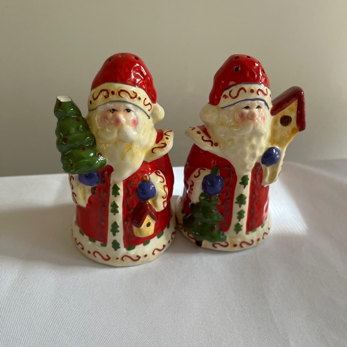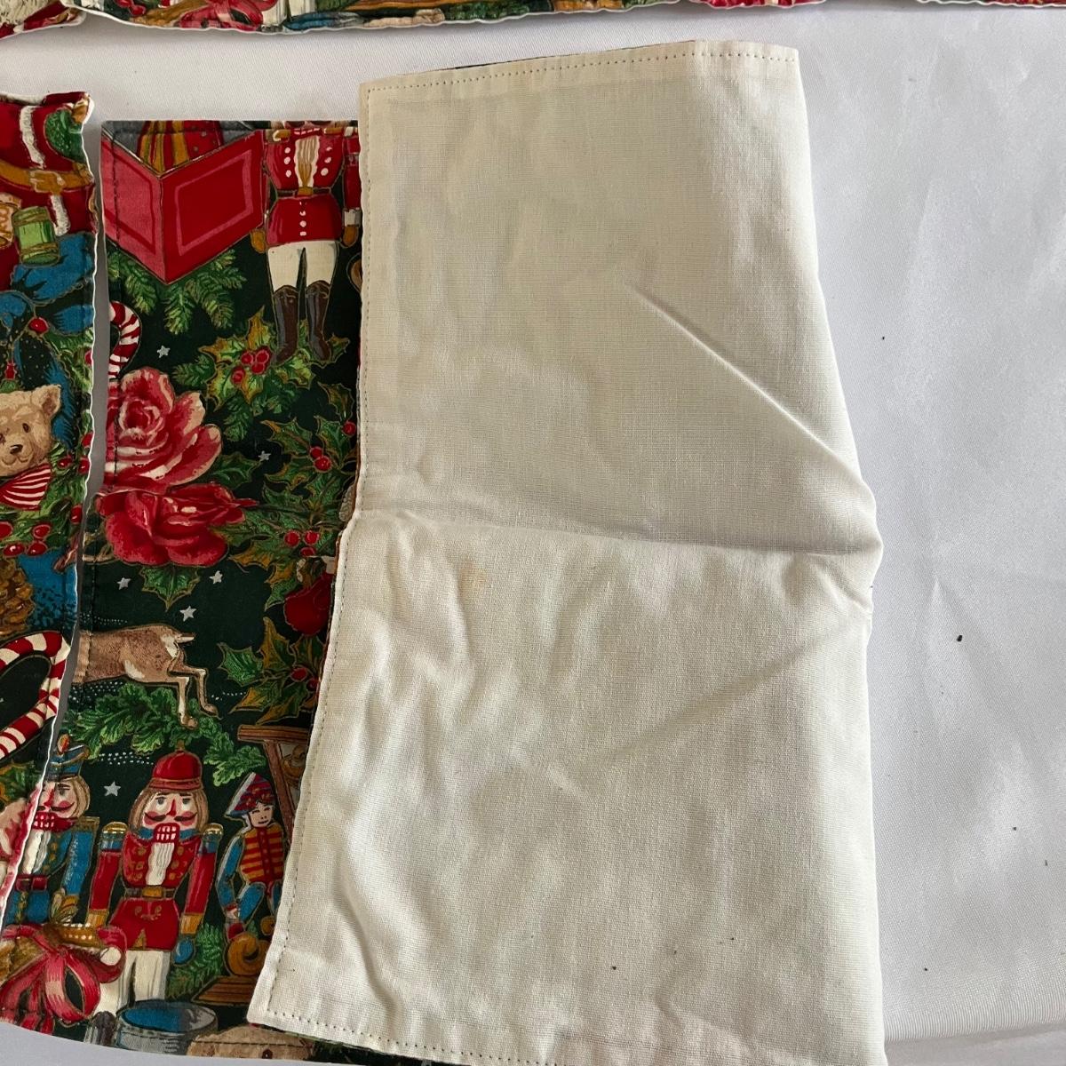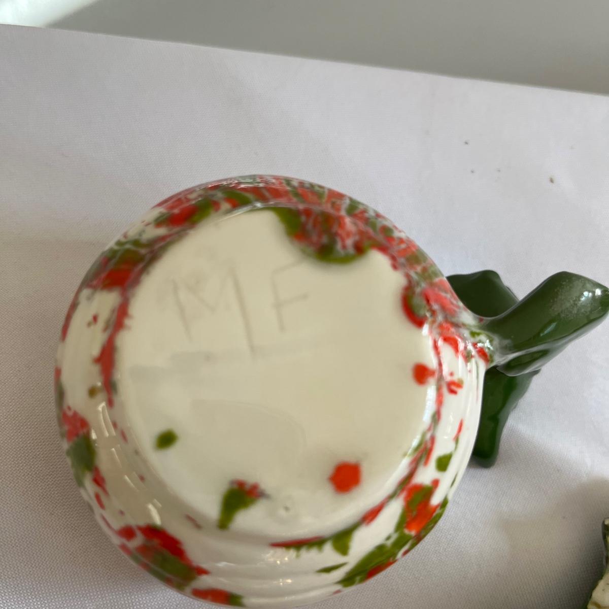 A collection of Christmas decorations in this lot that contains a snowman cookie jar, punch bowl and cups, bowl, mug, sequined storage boxes, wooden pins and more. Cookie jar measures 7”D x 12” tall. Also includes tree skirt, placemats, angel nutcracker, Christmas tree shaped decorations, La Bien Ceramic ornament, three dog stockings and resin figurines.
