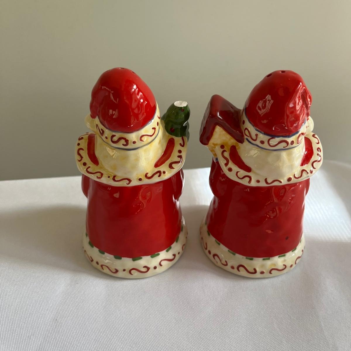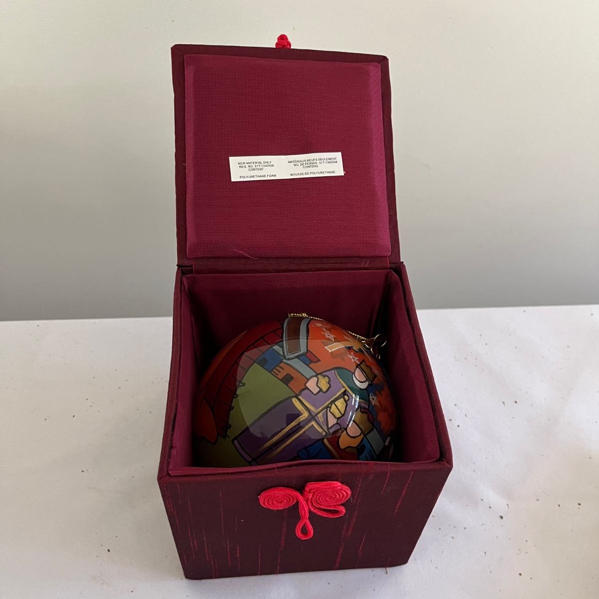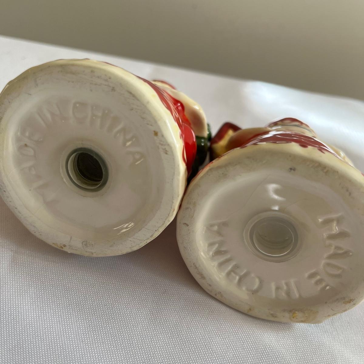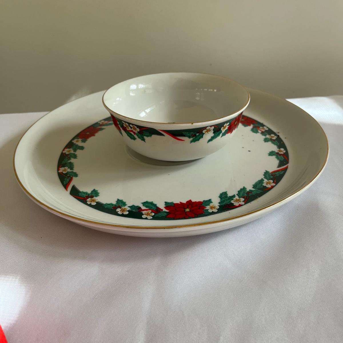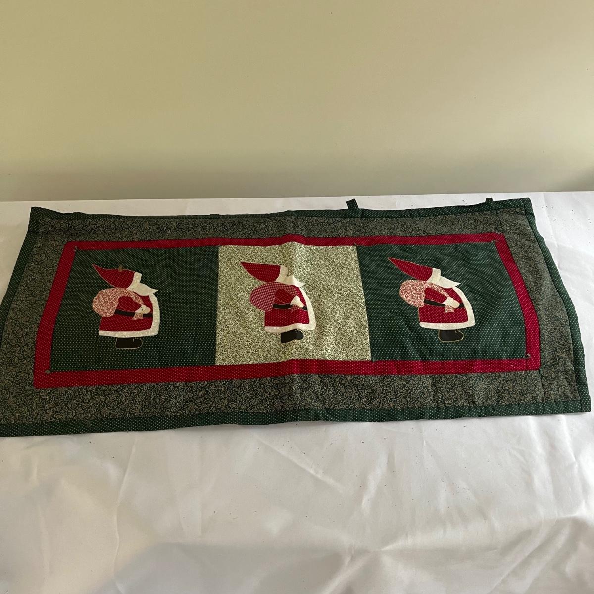 A collection of Christmas decorations in this lot that contains a snowman cookie jar, punch bowl and cups, bowl, mug, sequined storage boxes, wooden pins and more. Cookie jar measures 7”D x 12” tall. Also includes tree skirt, placemats, angel nutcracker, Christmas tree shaped decorations, La Bien Ceramic ornament, three dog stockings and resin figurines.