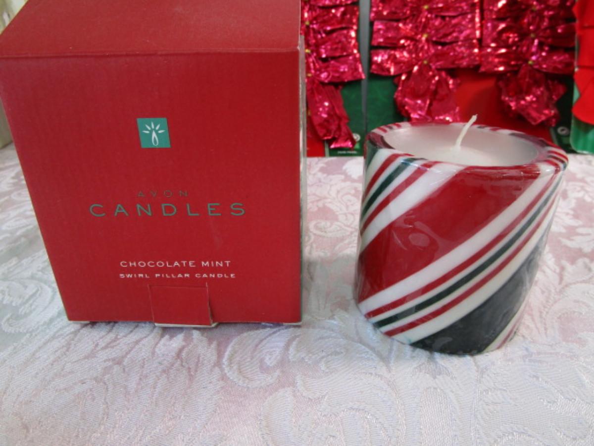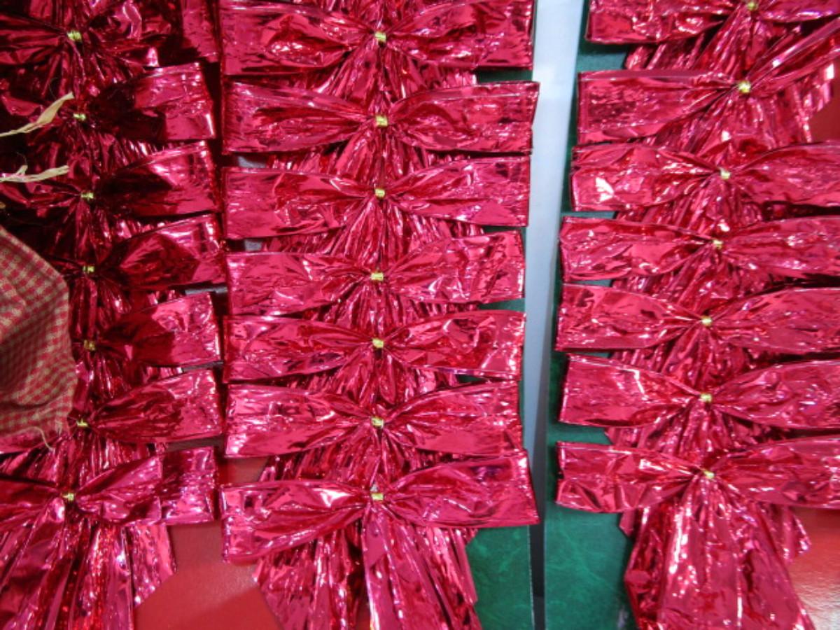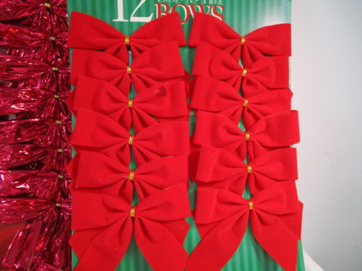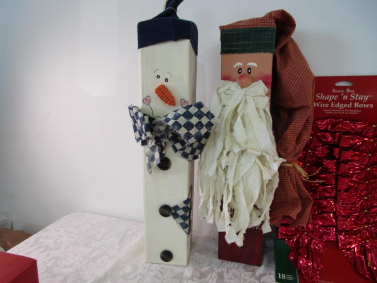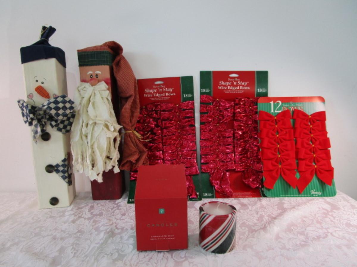 New 3 pkg Christmas bows, new striped Christmas chocolate peppermint swirl candle, wood Santa & Snowman decorations 18" tall , see pictures