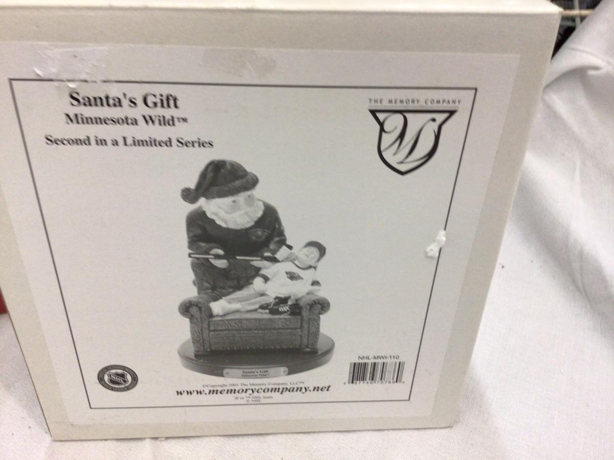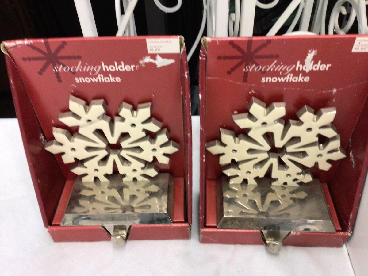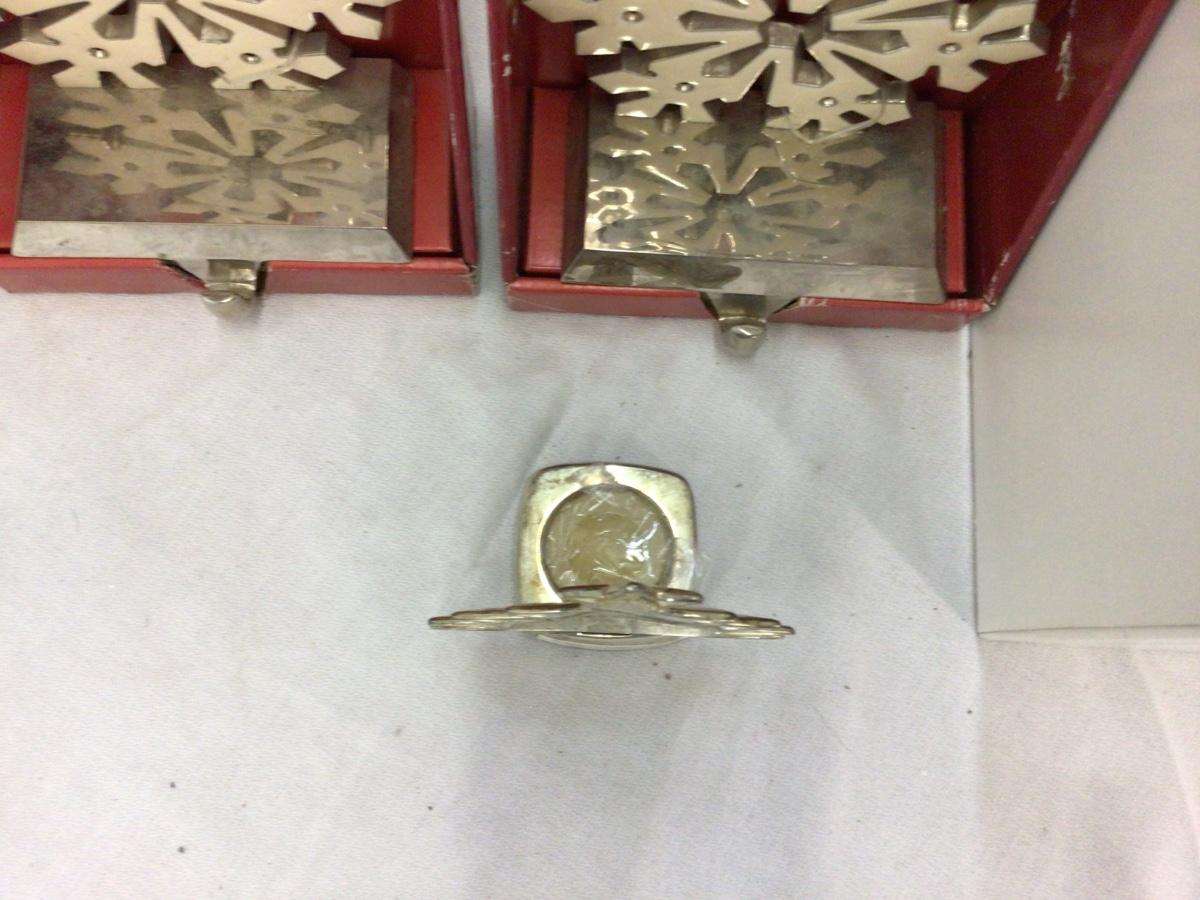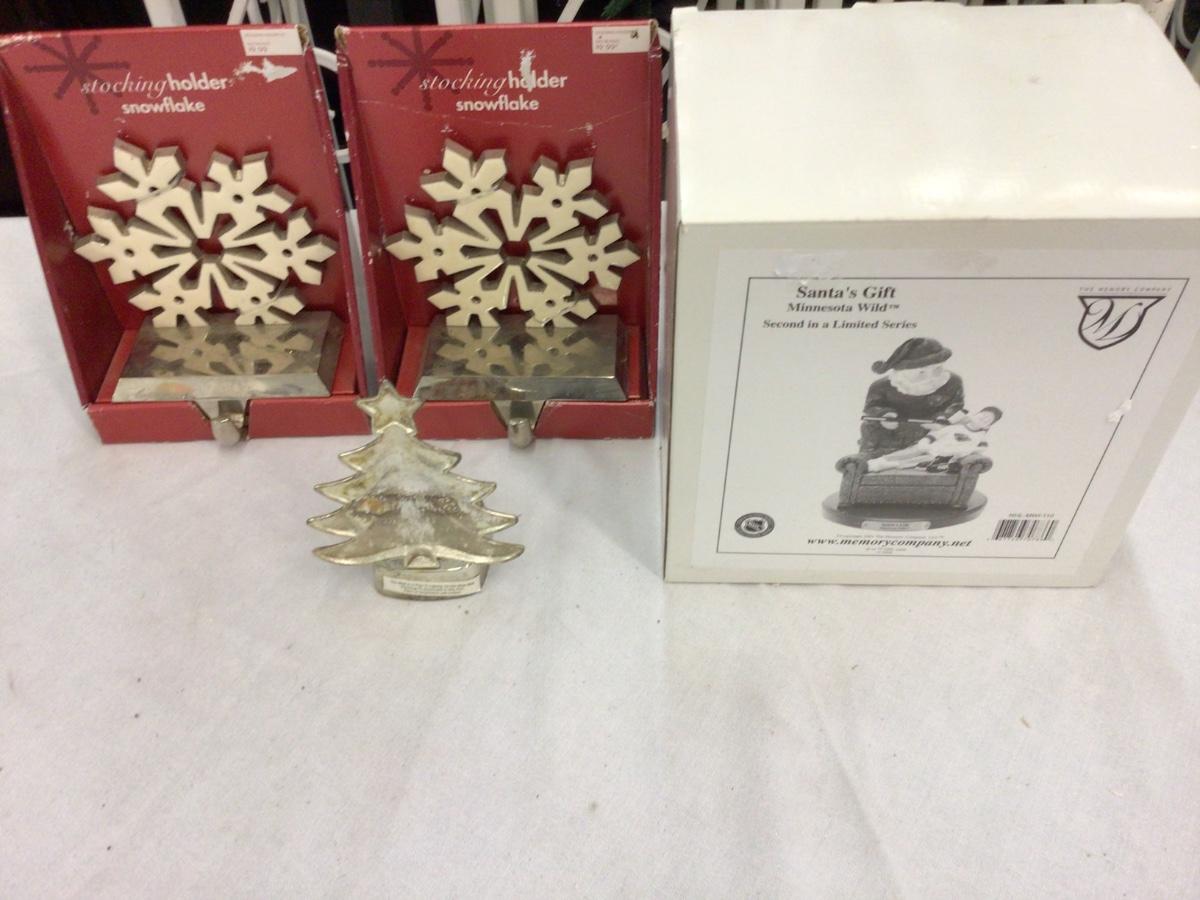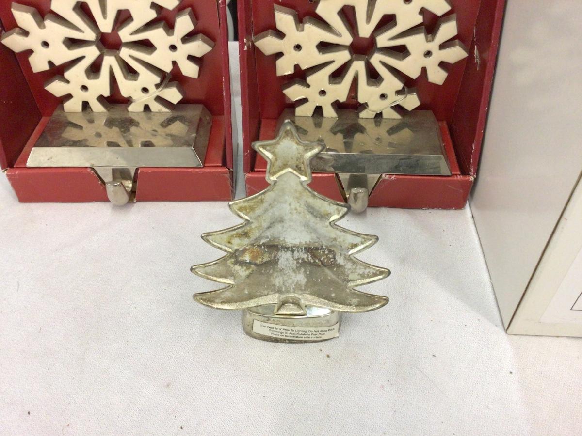 You get two matching Snow Flake Stocking hooks, a Christmas tree votive holder, and Santa’s Gift Figurine in the box.