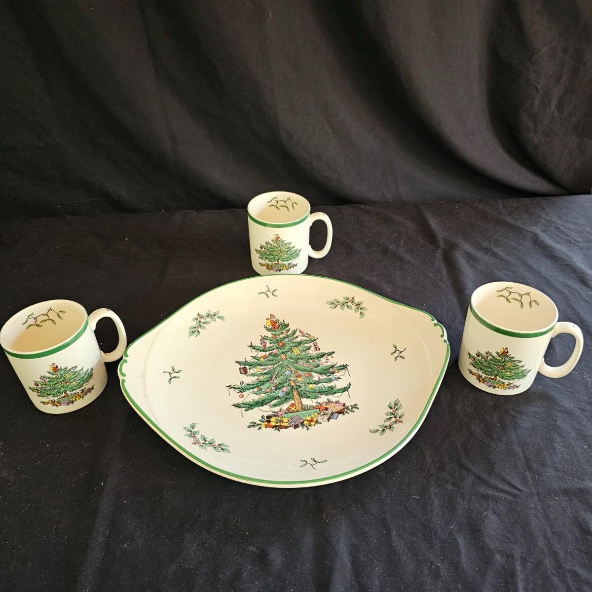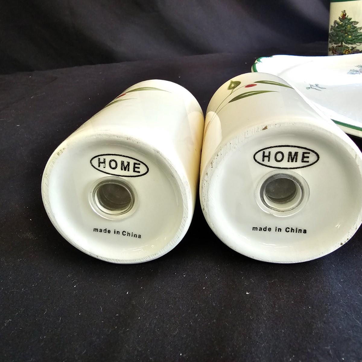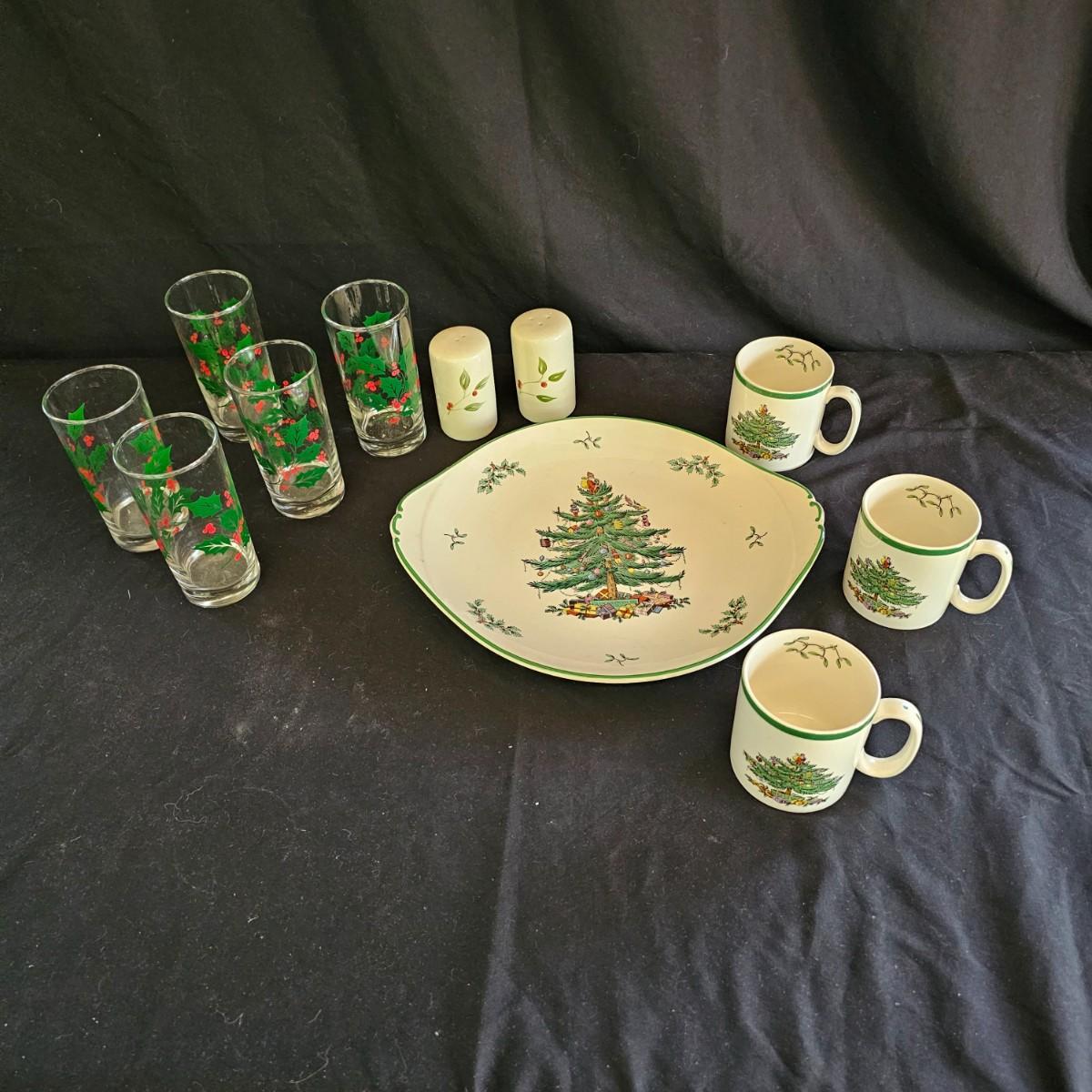 Five glasses, a salt/pepper set, and three Spode cups and a Spode plate. The plate measures 13" x 11", is done in the Christmas Tree pattern. Glasses have a holly and berry pattern on them. See photos for details. Shipping available.