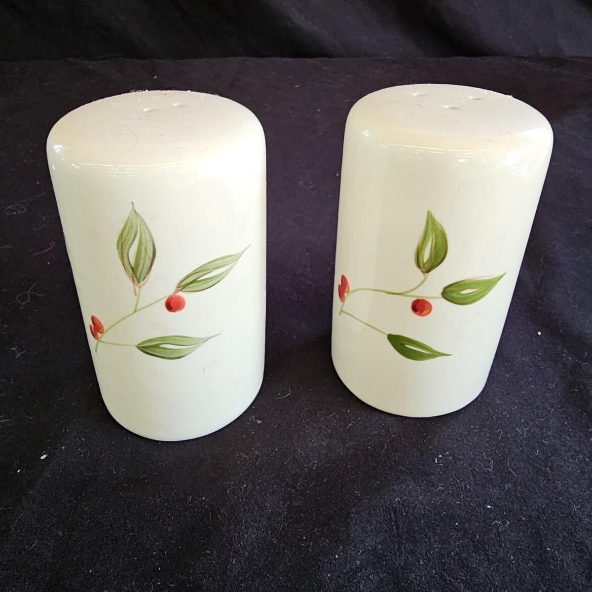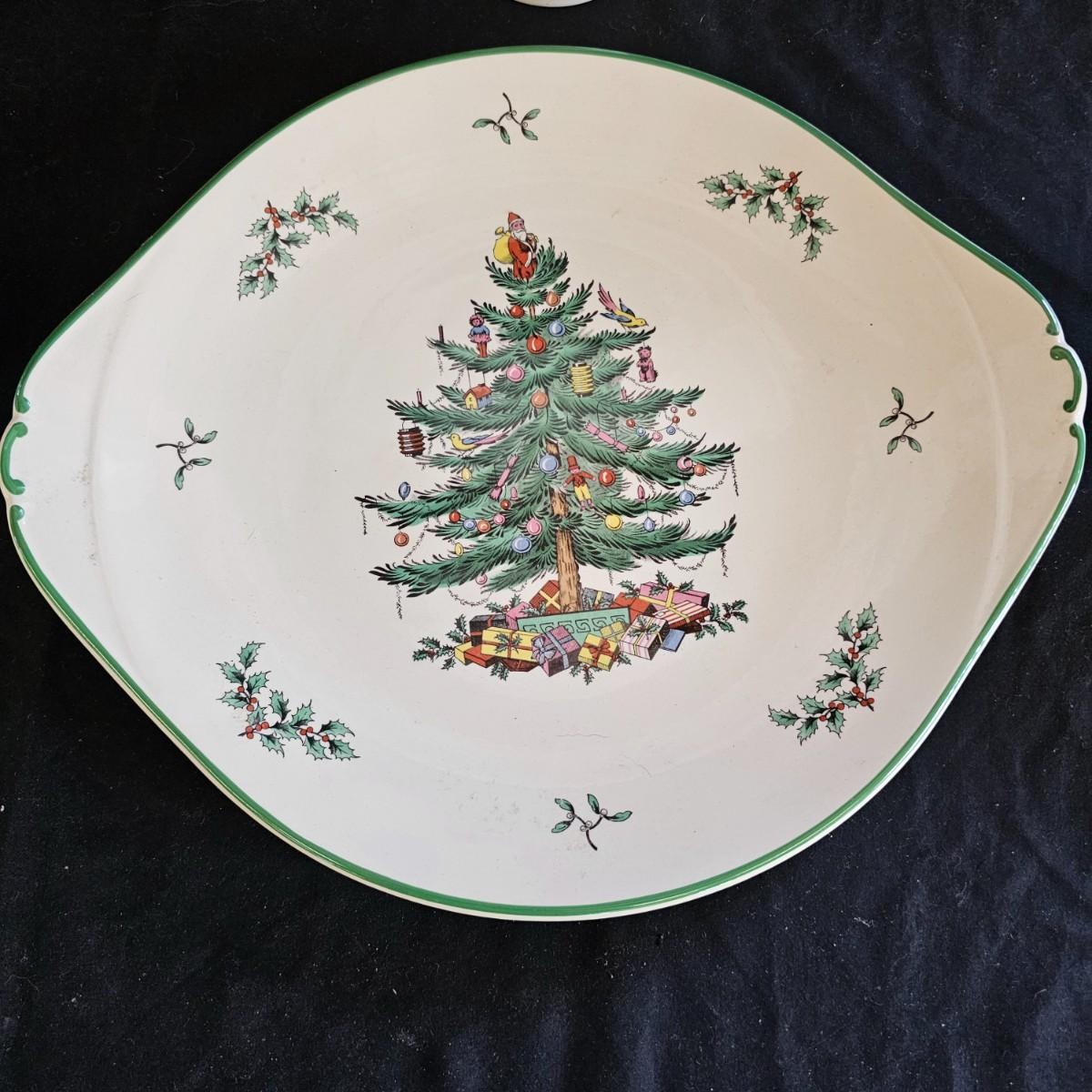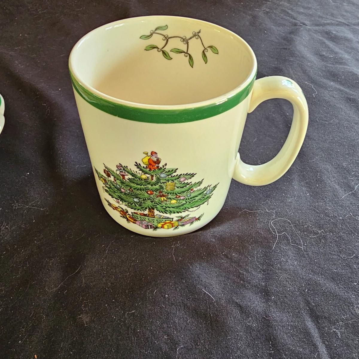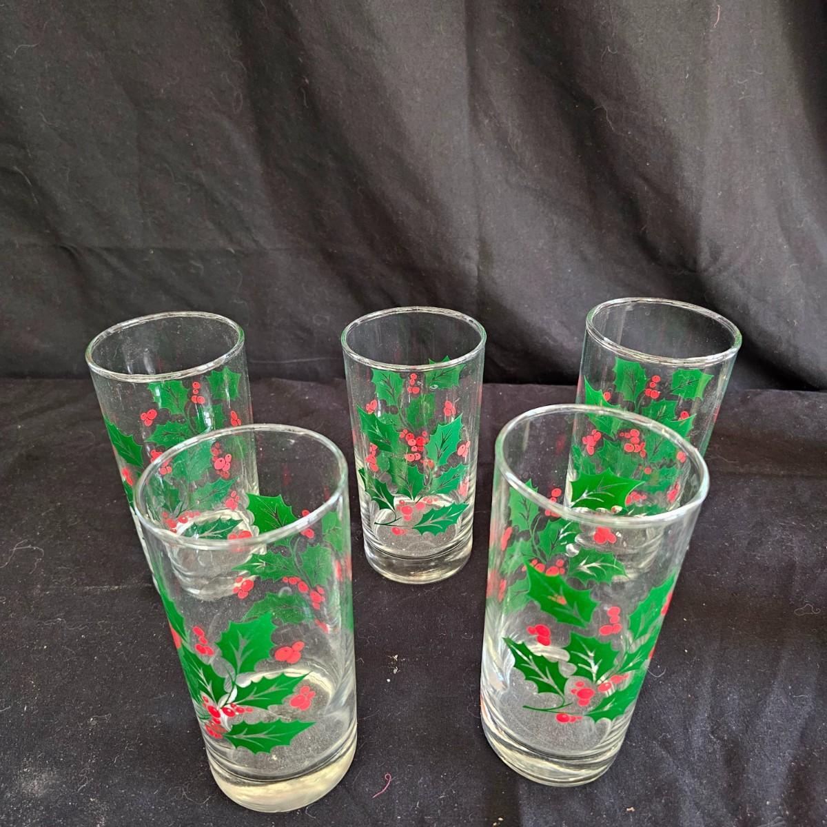 Five glasses, a salt/pepper set, and three Spode cups and a Spode plate. The plate measures 13" x 11", is done in the Christmas Tree pattern. Glasses have a holly and berry pattern on them. See photos for details. Shipping available.