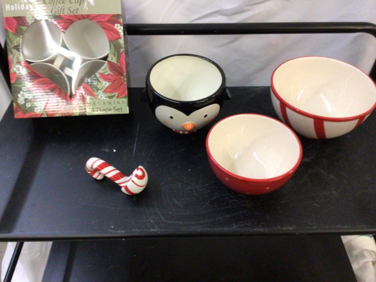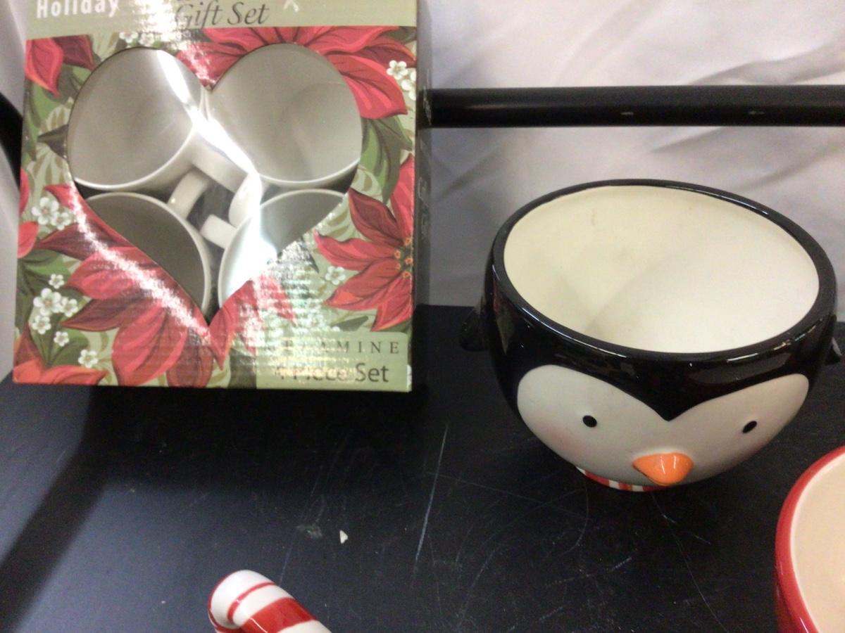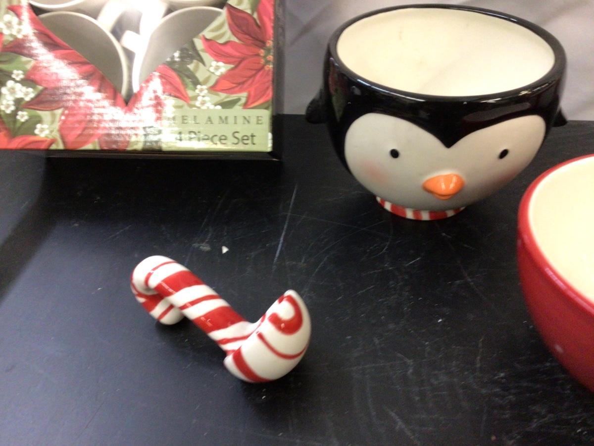 You get a Hallmark penguin bowl, candy cane bowl, red and white polka dot bowl, and candy cane ladle. Also get set 4 pointsetta coffee mugs new in package.