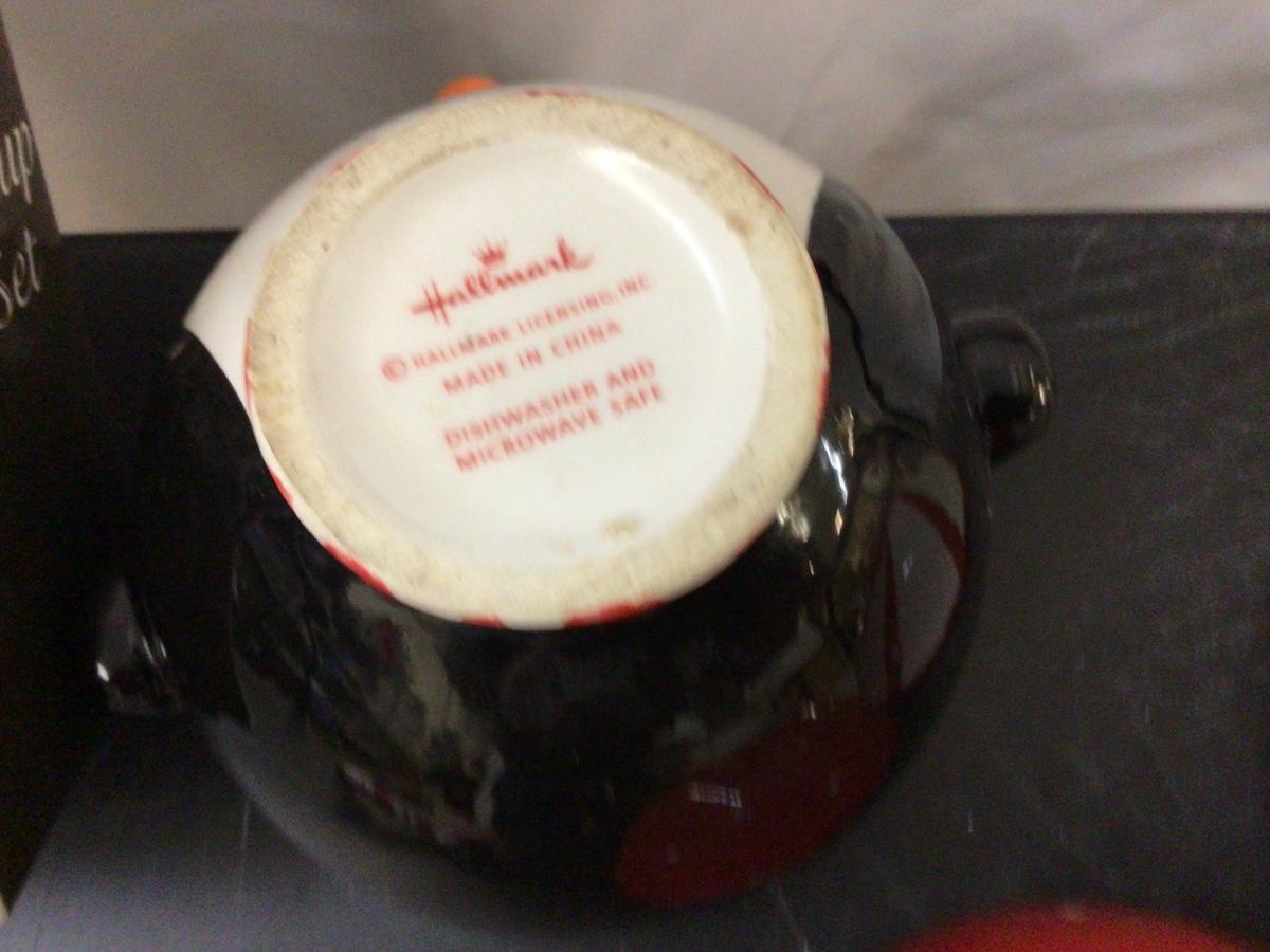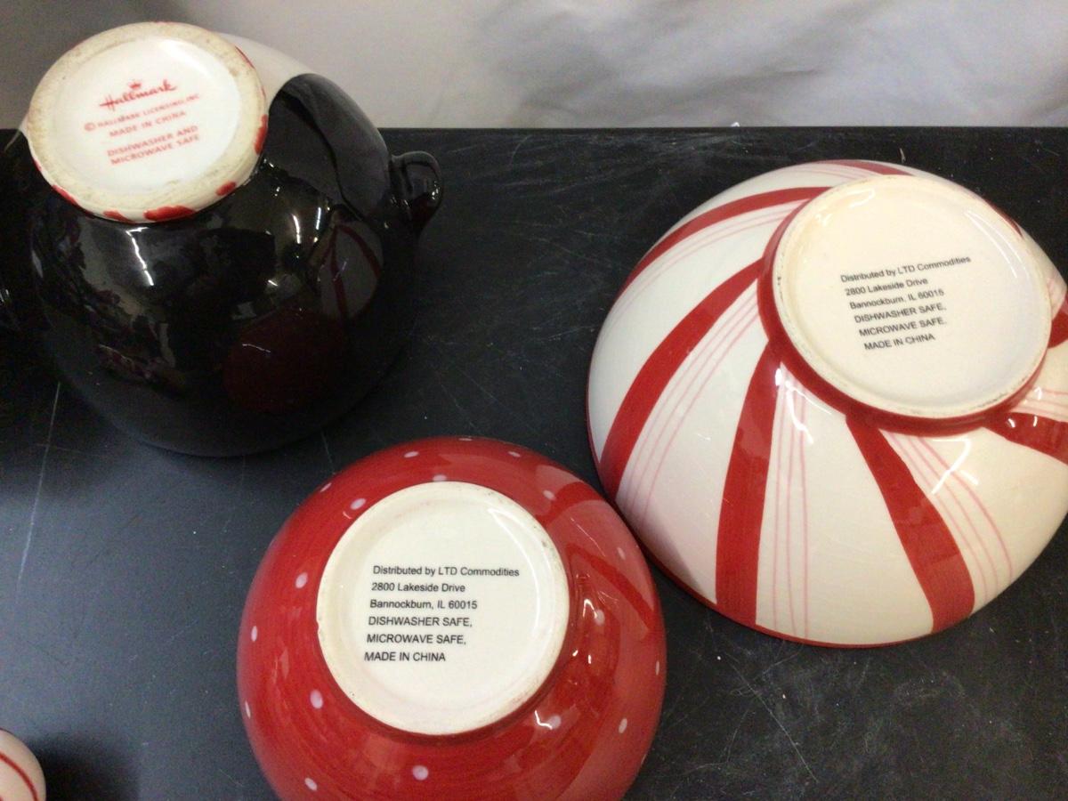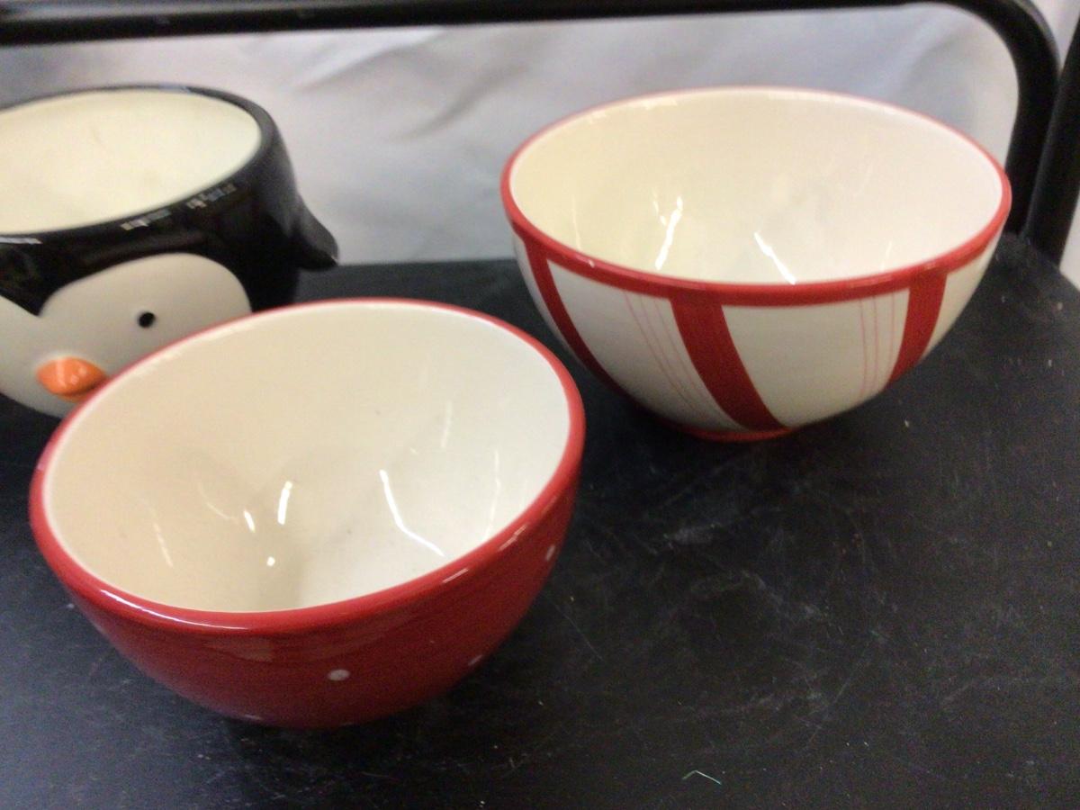 You get a Hallmark penguin bowl, candy cane bowl, red and white polka dot bowl, and candy cane ladle. Also get set 4 pointsetta coffee mugs new in package.