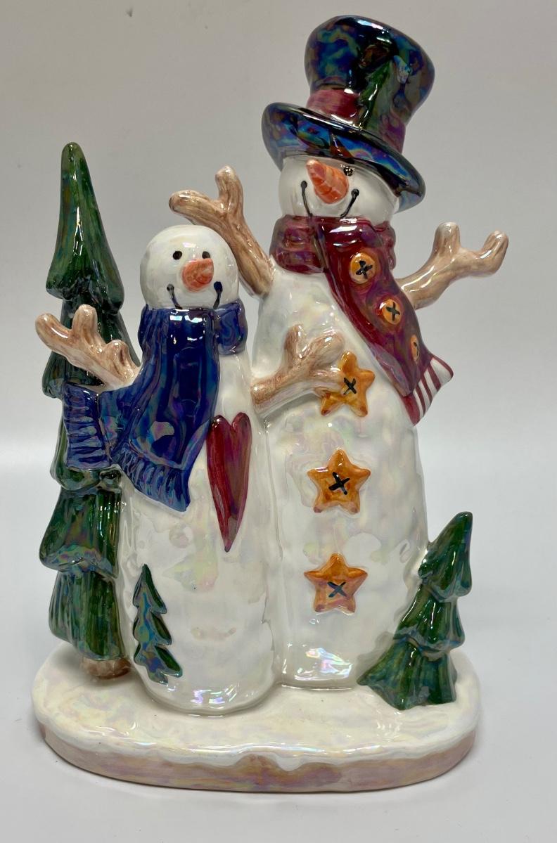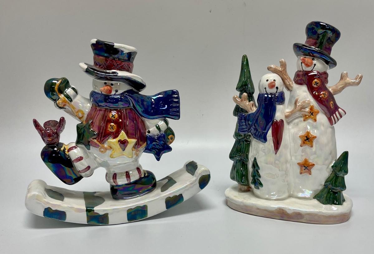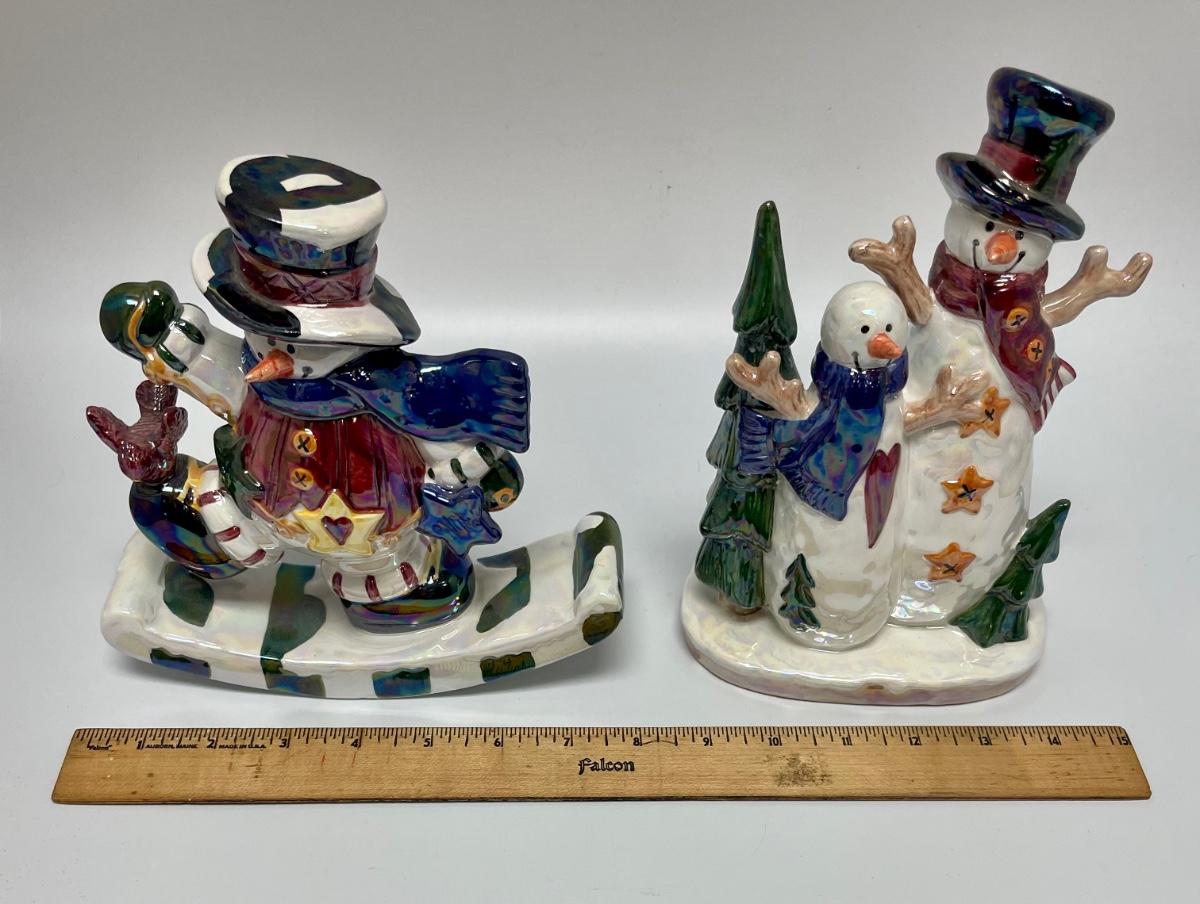 Pair of Dept. 18 Christmas figurines. Walking snowman and pair of posing snowmen. Hand painted.