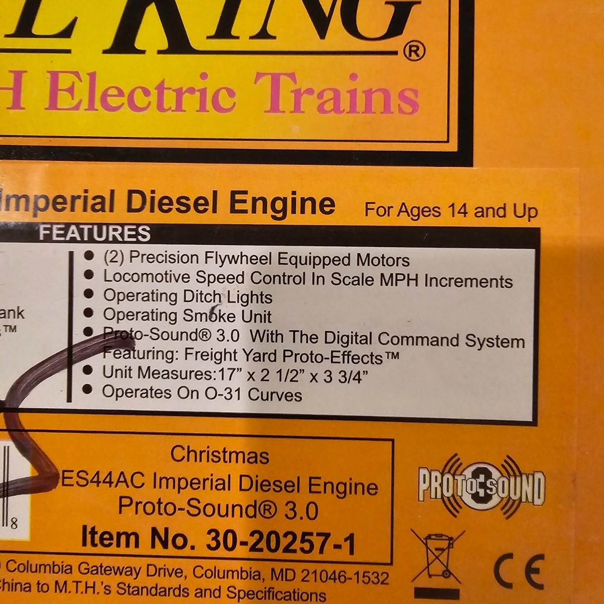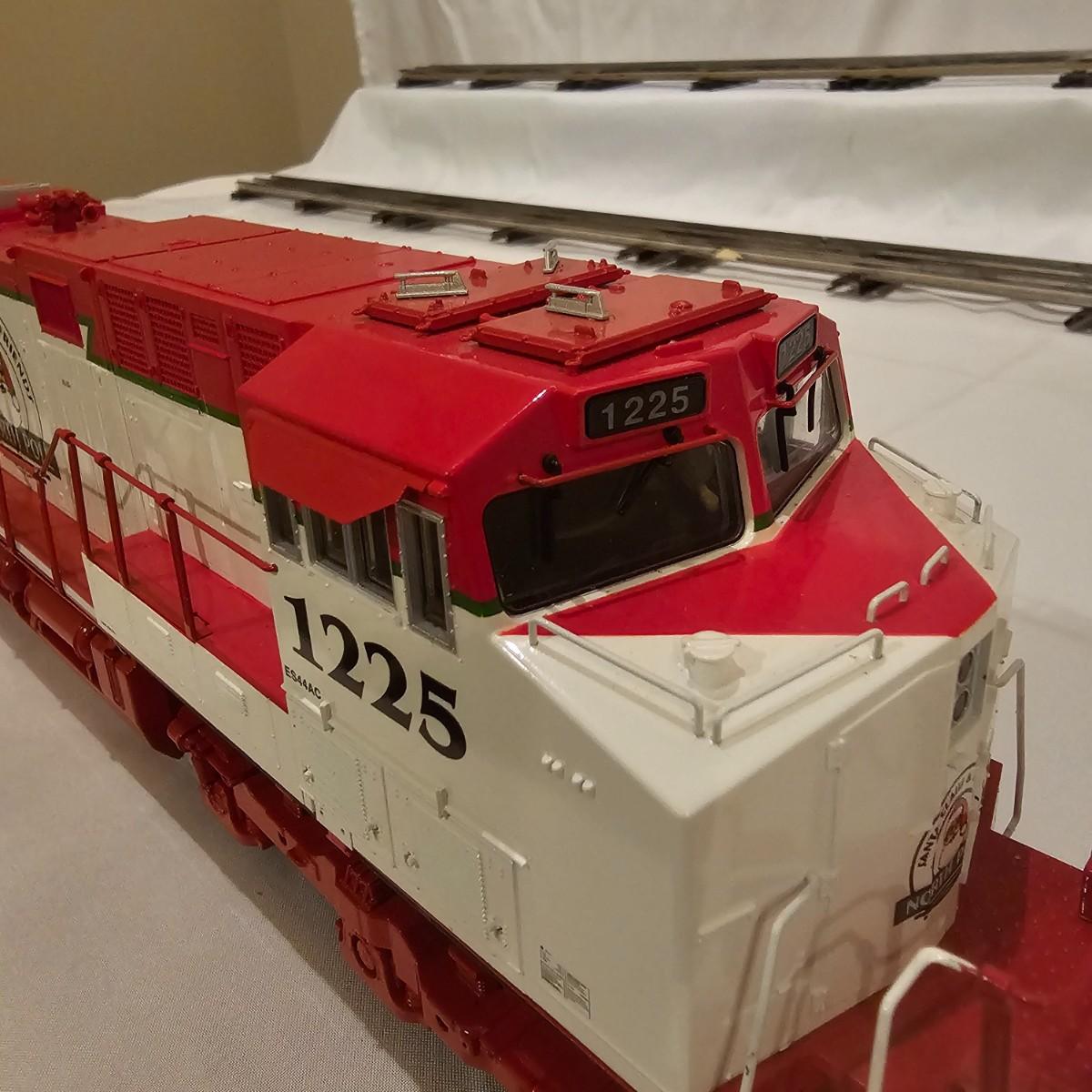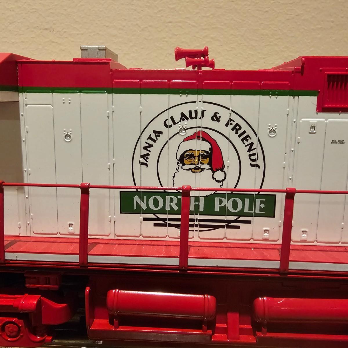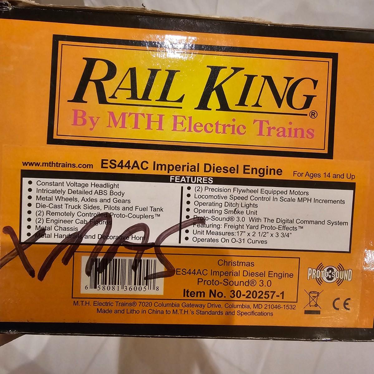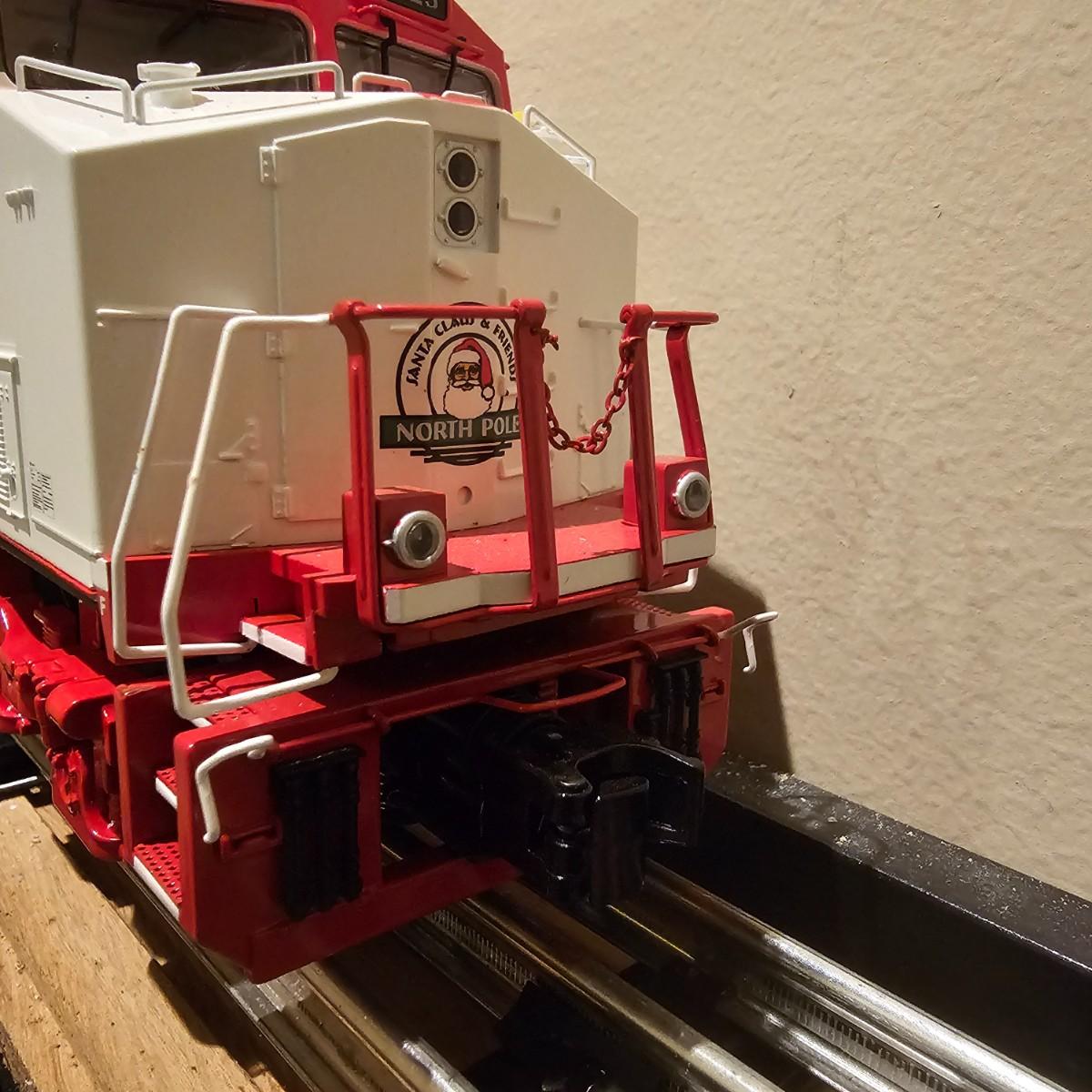 Beautiful Christmas themed Imperial diesel by Rail King/MTH. SANTA Claus symbols and red/white coloring throughout. Engine has multiple features including Proto 3 Sound, operating ditch lights and smoke, freight yard effects and more. Engine powered up on layout and ran, but not all effects tested. Measures 17" x 2.5" x 3.74"H. Comes in original box, box somewhat used. See photos for details. Tracks in photos are not included with this lot, but available elsewhere in this auction.