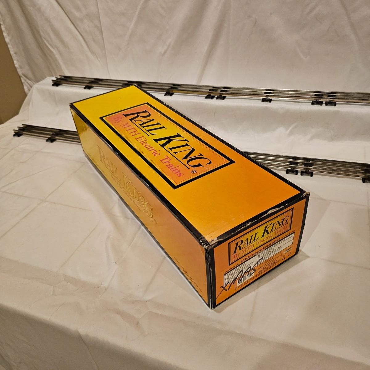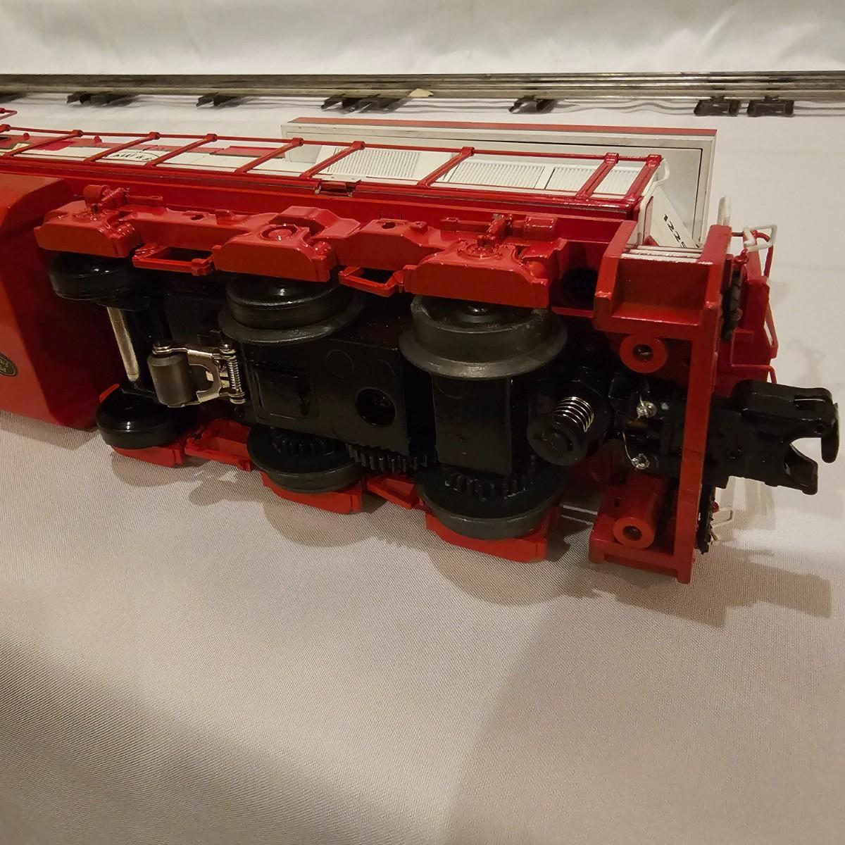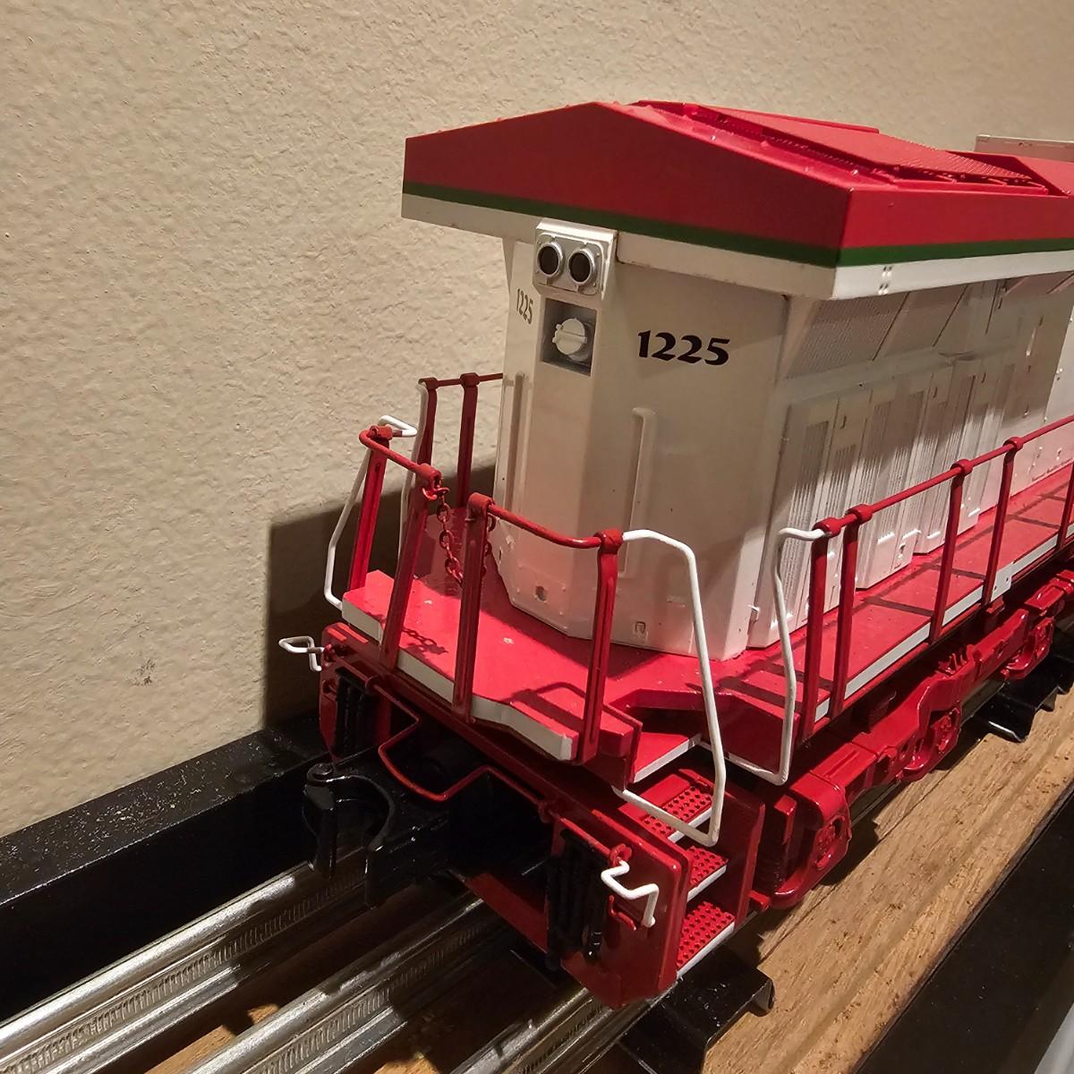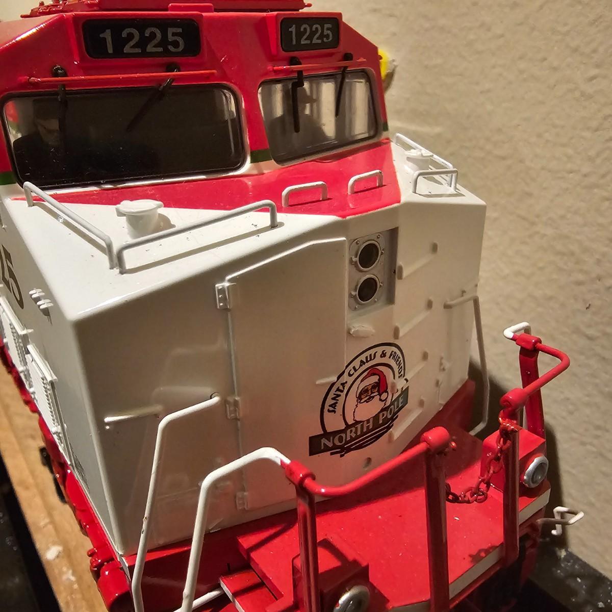 Beautiful Christmas themed Imperial diesel by Rail King/MTH. SANTA Claus symbols and red/white coloring throughout. Engine has multiple features including Proto 3 Sound, operating ditch lights and smoke, freight yard effects and more. Engine powered up on layout and ran, but not all effects tested. Measures 17" x 2.5" x 3.74"H. Comes in original box, box somewhat used. See photos for details. Tracks in photos are not included with this lot, but available elsewhere in this auction.