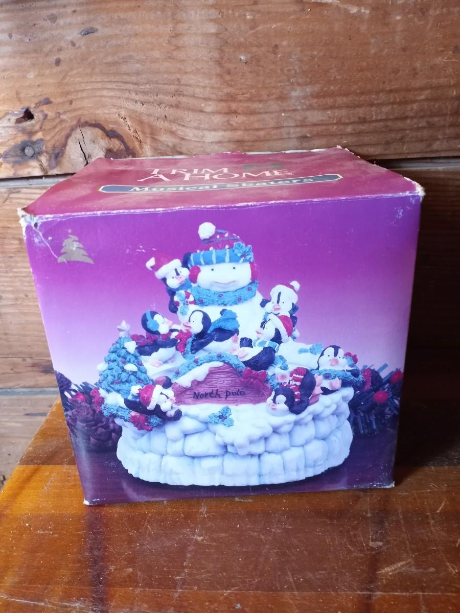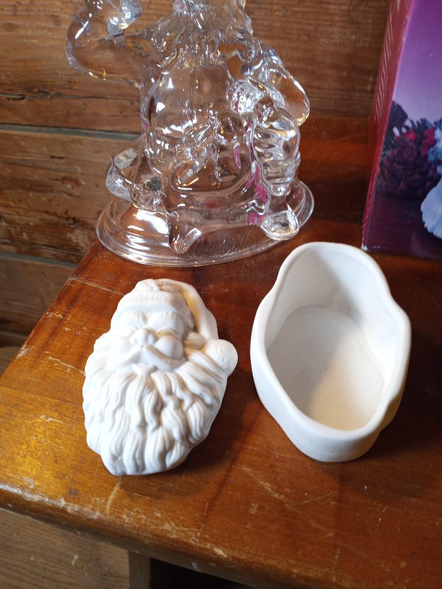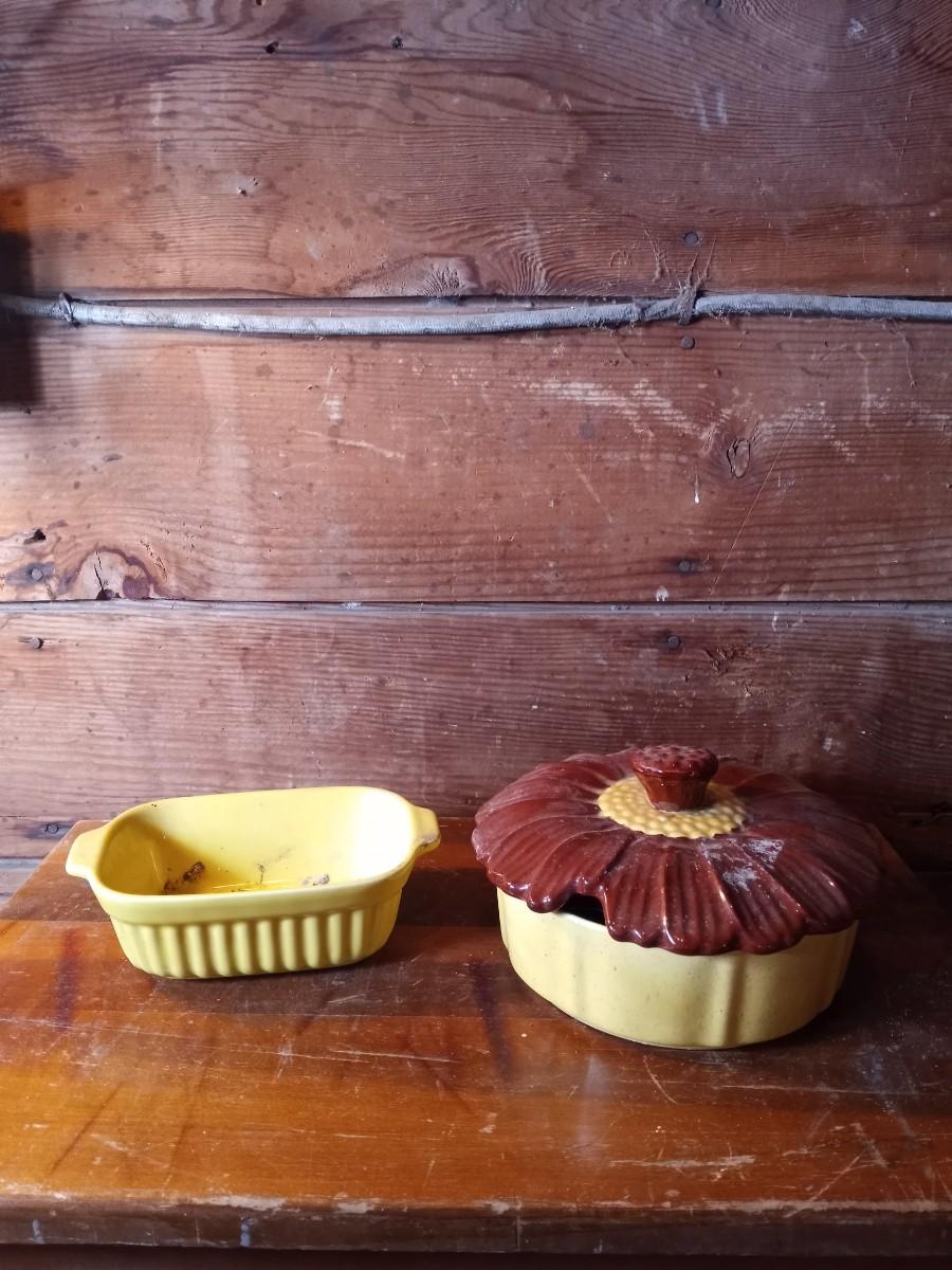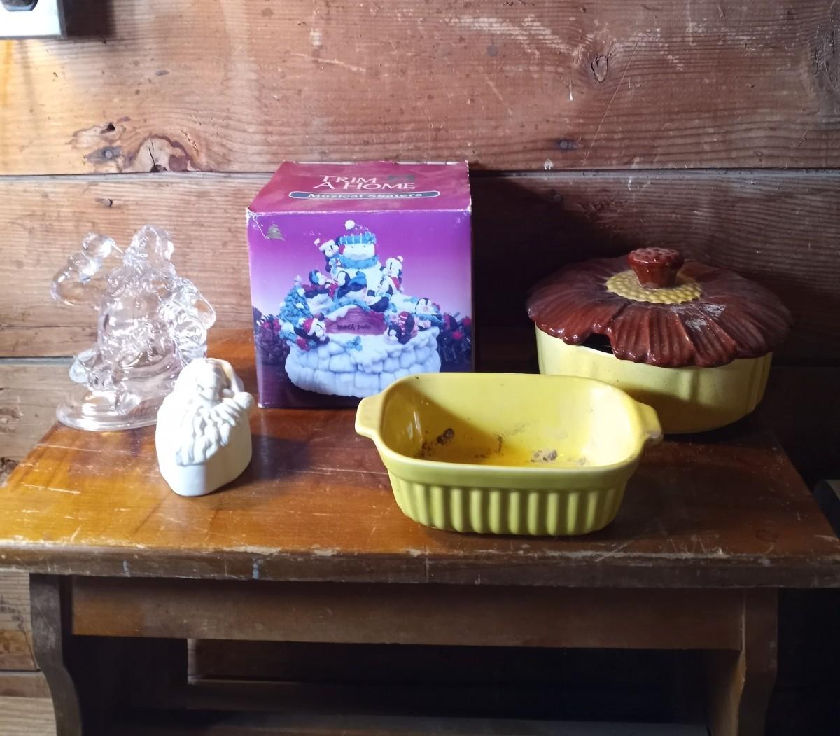 CHRISTMAS FIGURINES AND VINTAGE BAKING DISHES 7" OBLONG, 8" ROUND WITH LID