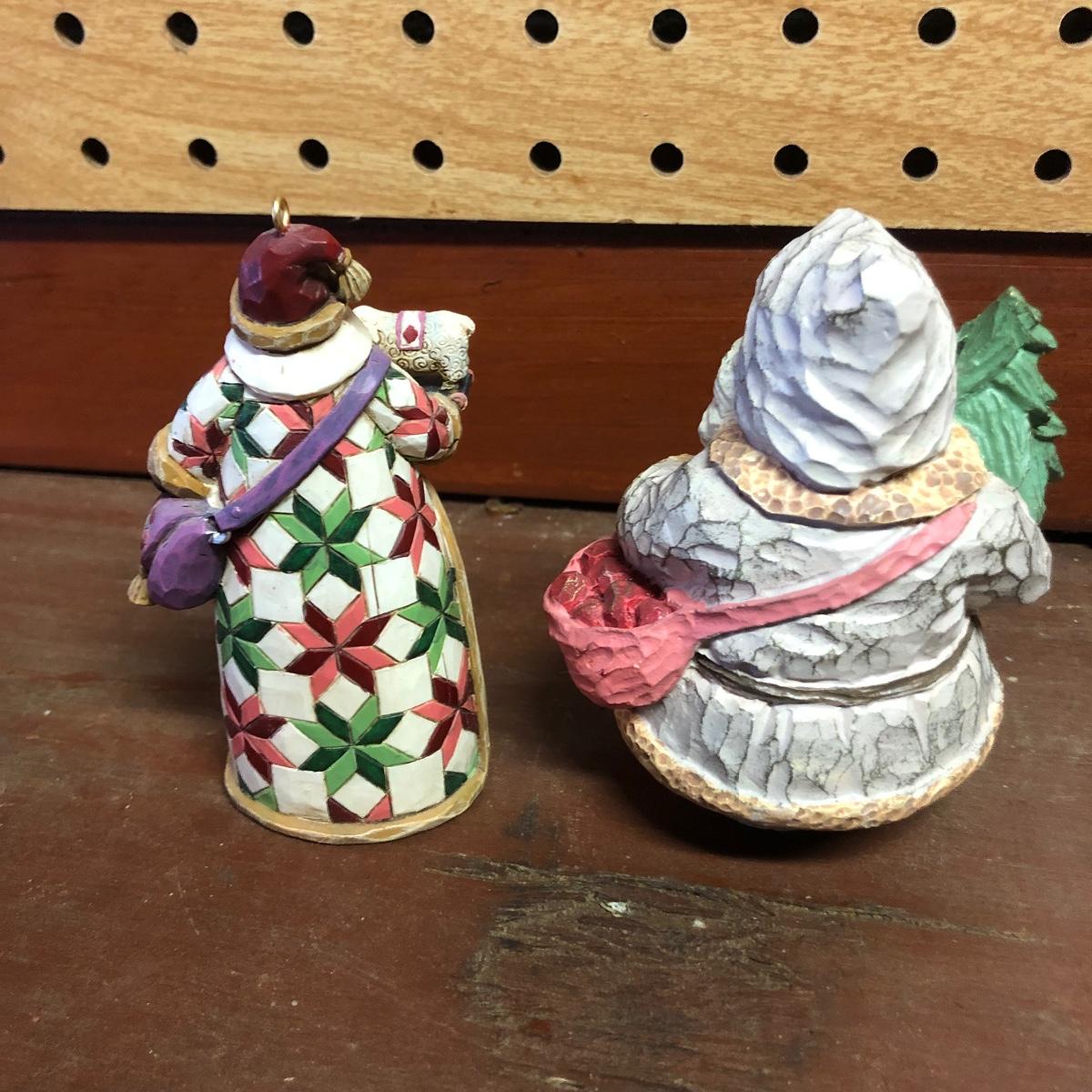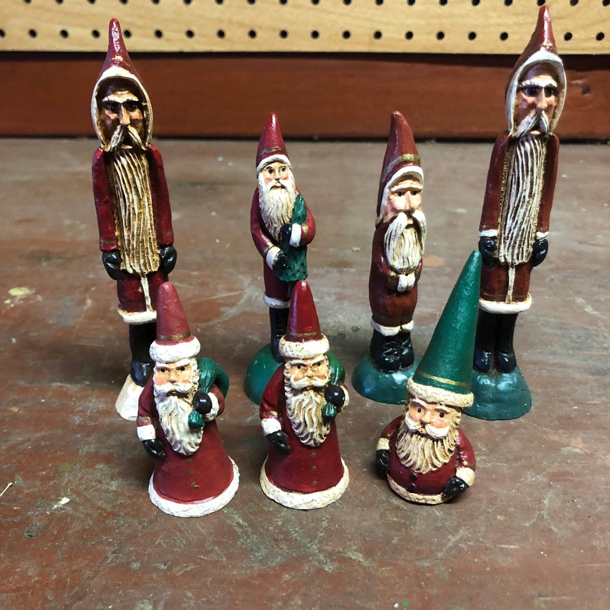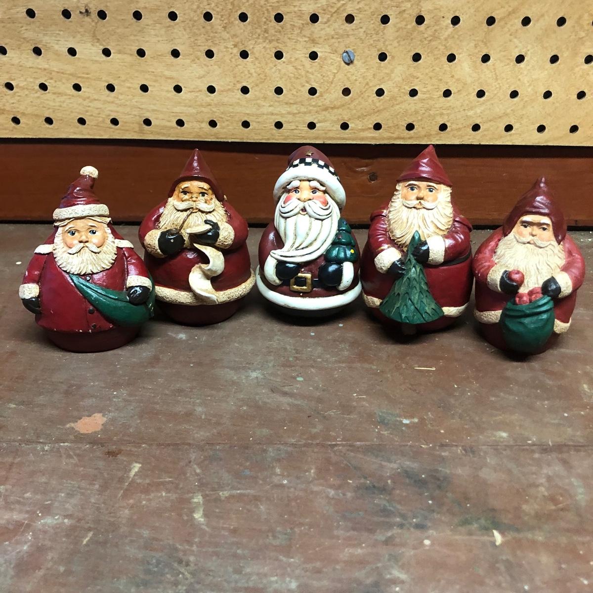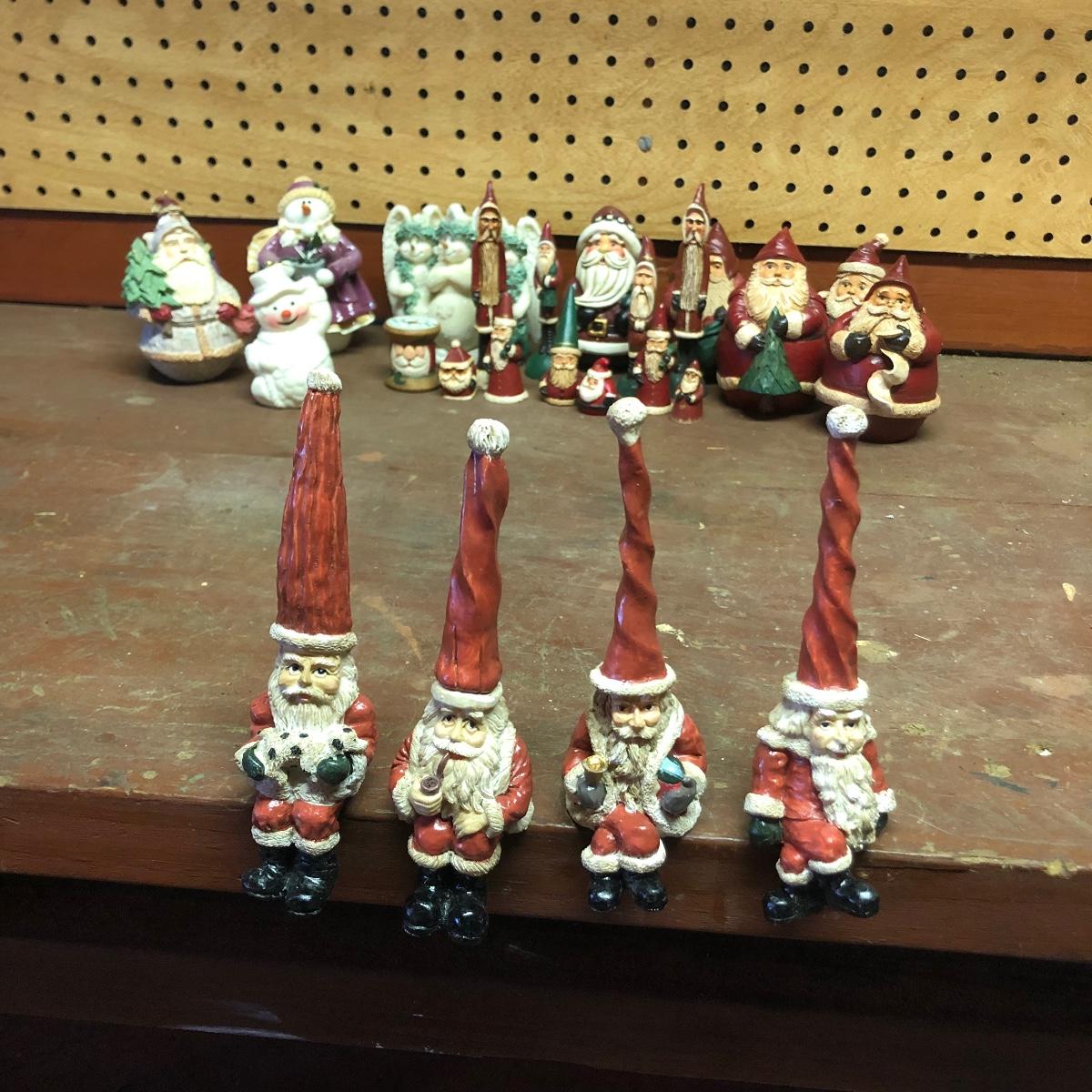 Lot includes three snowman design figurines, four seated Santa’s , five rotund Santa’s, three small wooden Santa’s, Eddie Walker Santa and more. Most figurines appear to be resin.