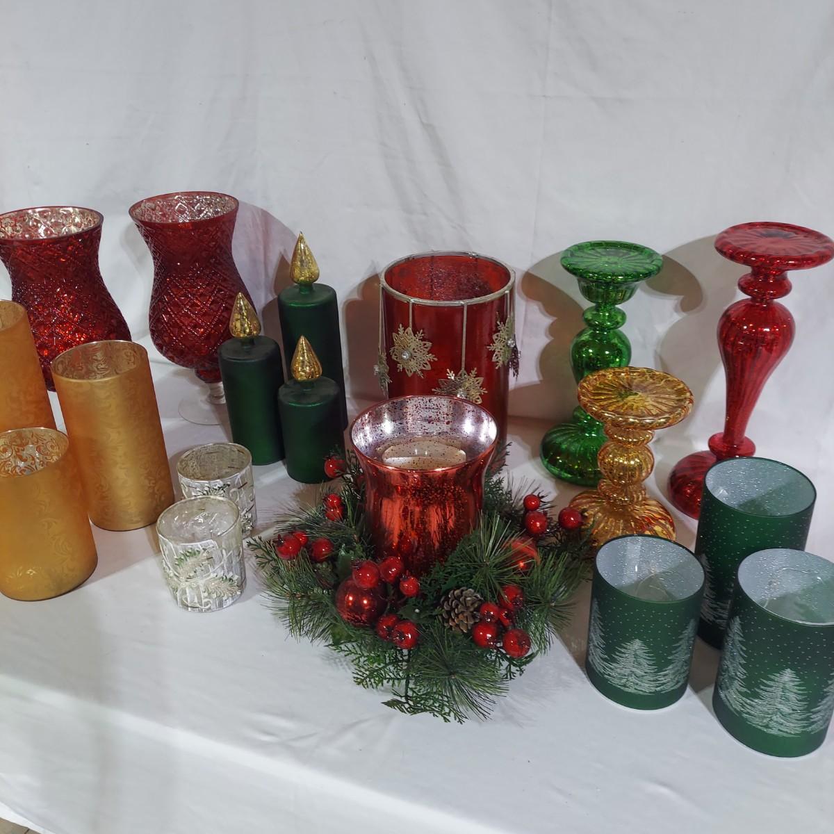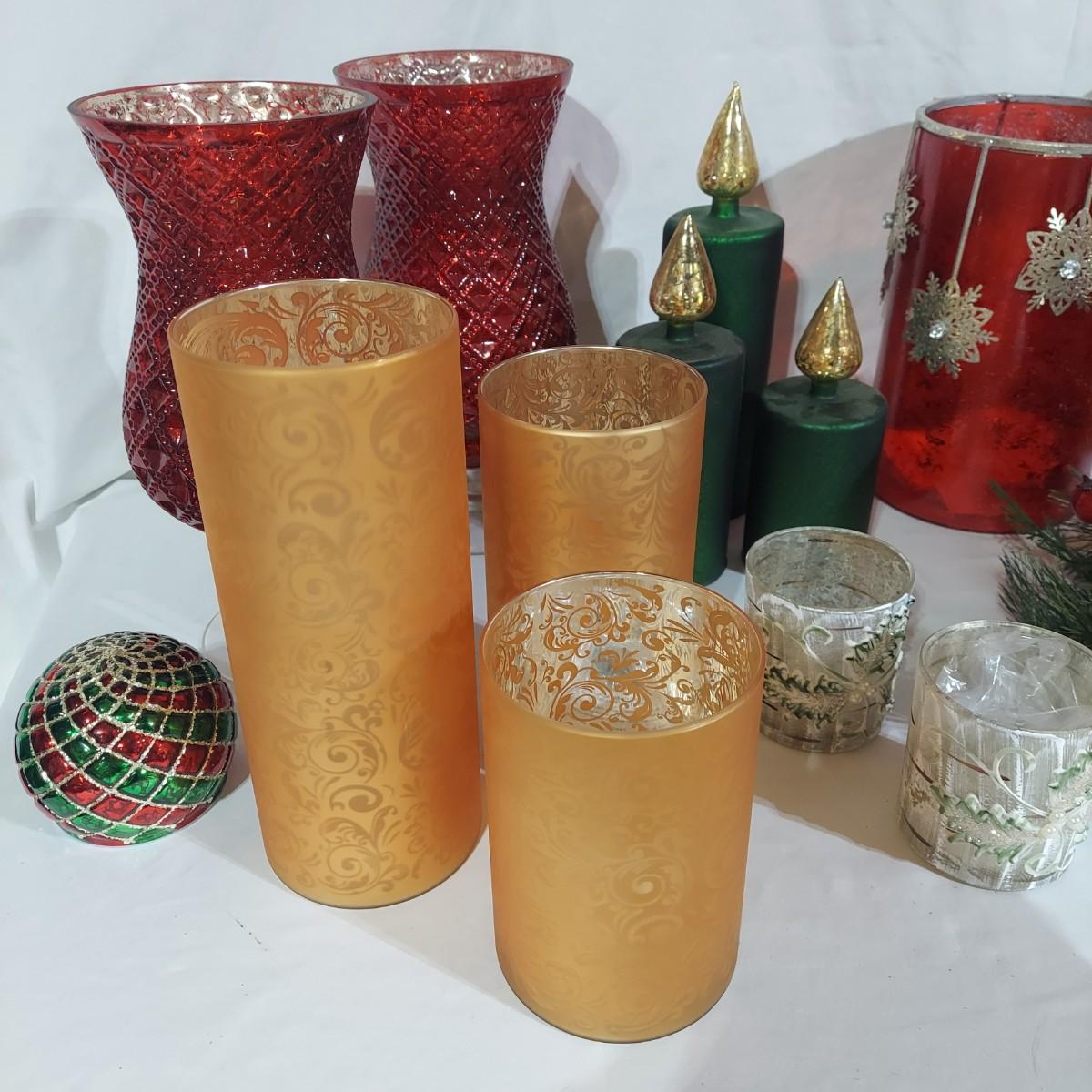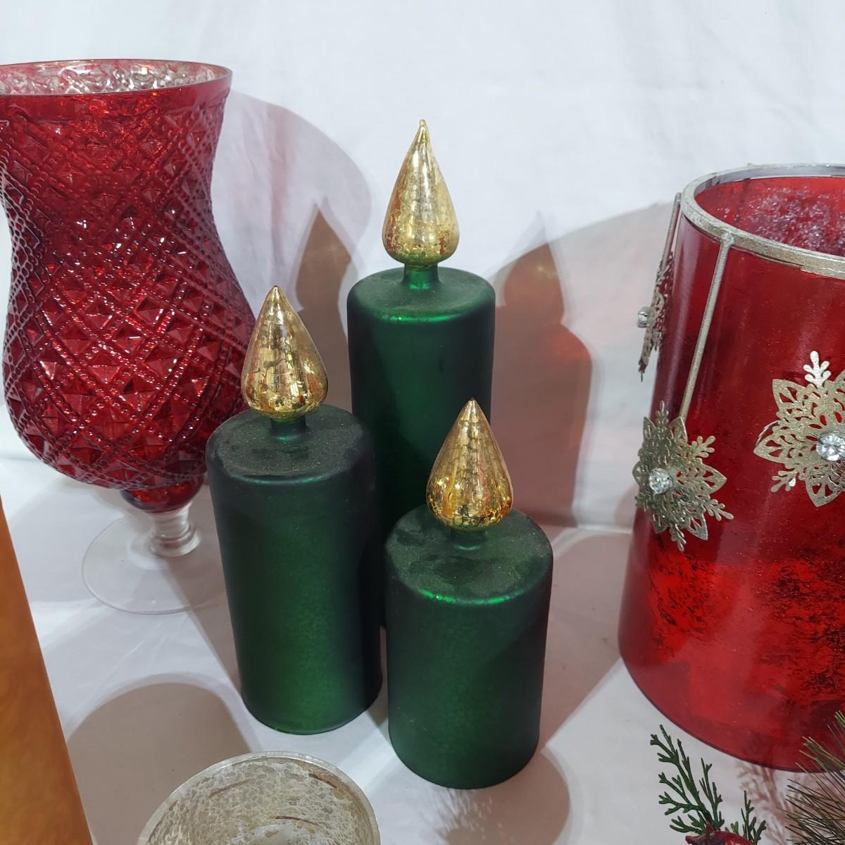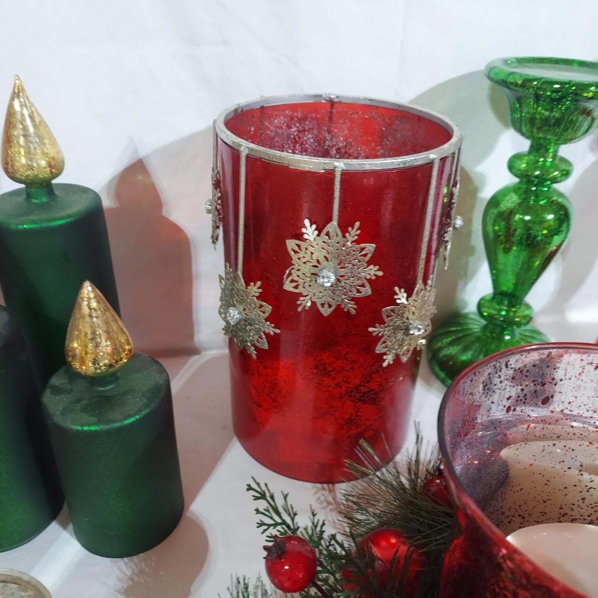 Large lot of Christmas Holiday decor. Includes several glass pedestals and glass candle holders. Plus flameless candles and led flicker power packs that give the appearance of flame inside of candle holders. The large red glass candle holder with metal snowflakes is 10"H. The faux candle sets are 7"H, 9"H and 11"H. Please see photos for details. Local Pickup Only.