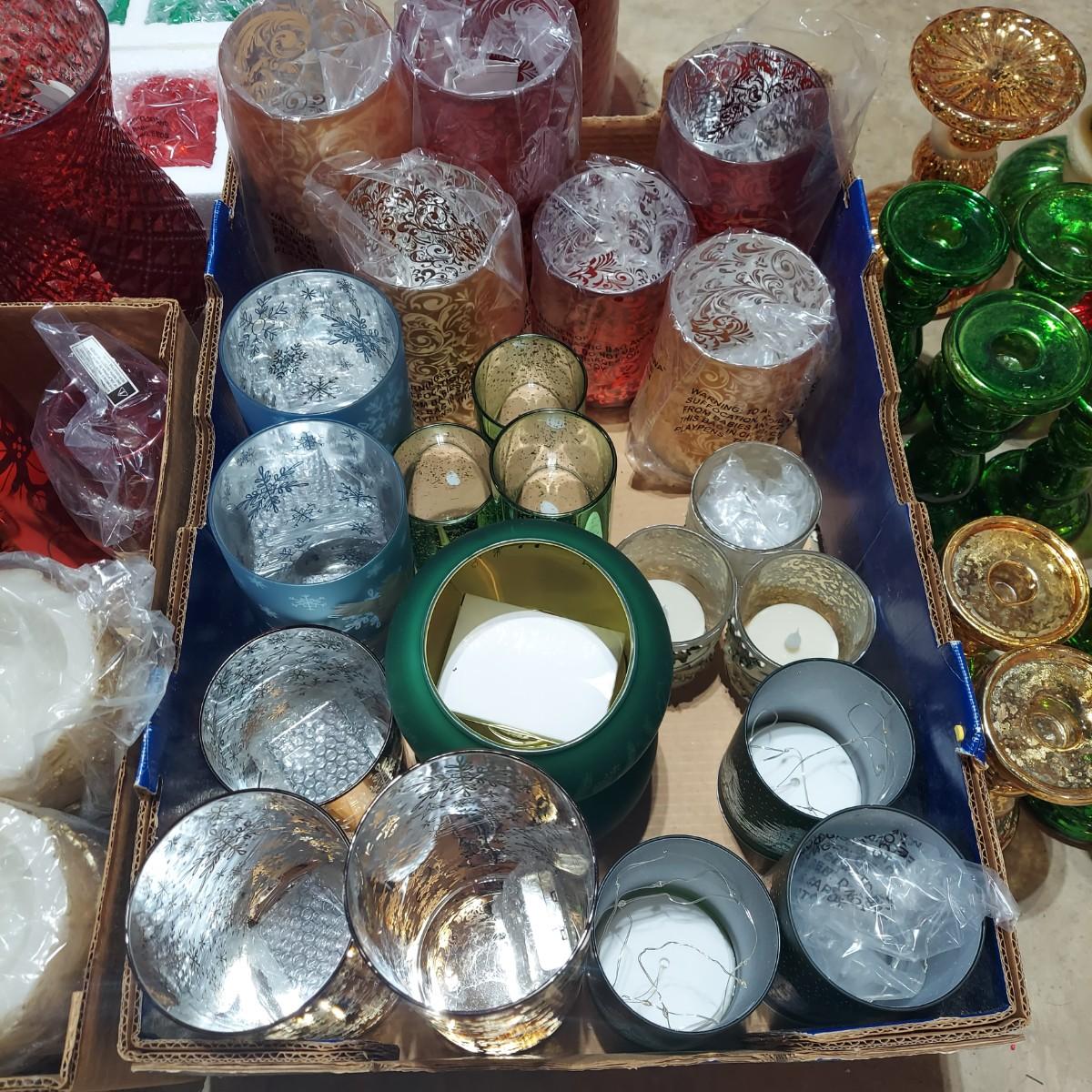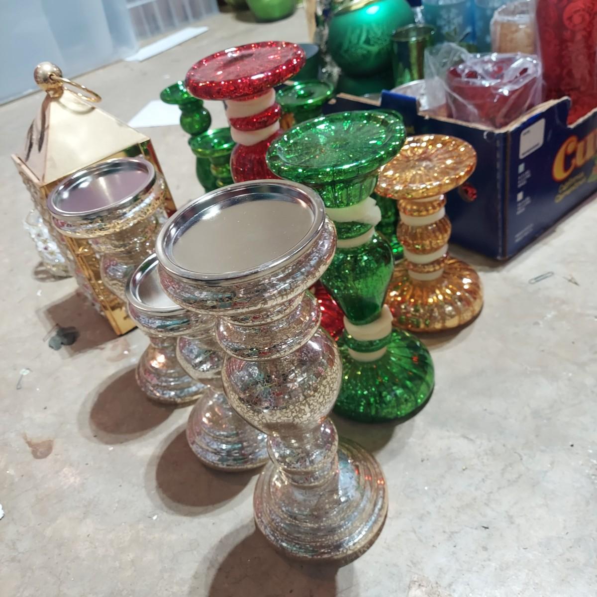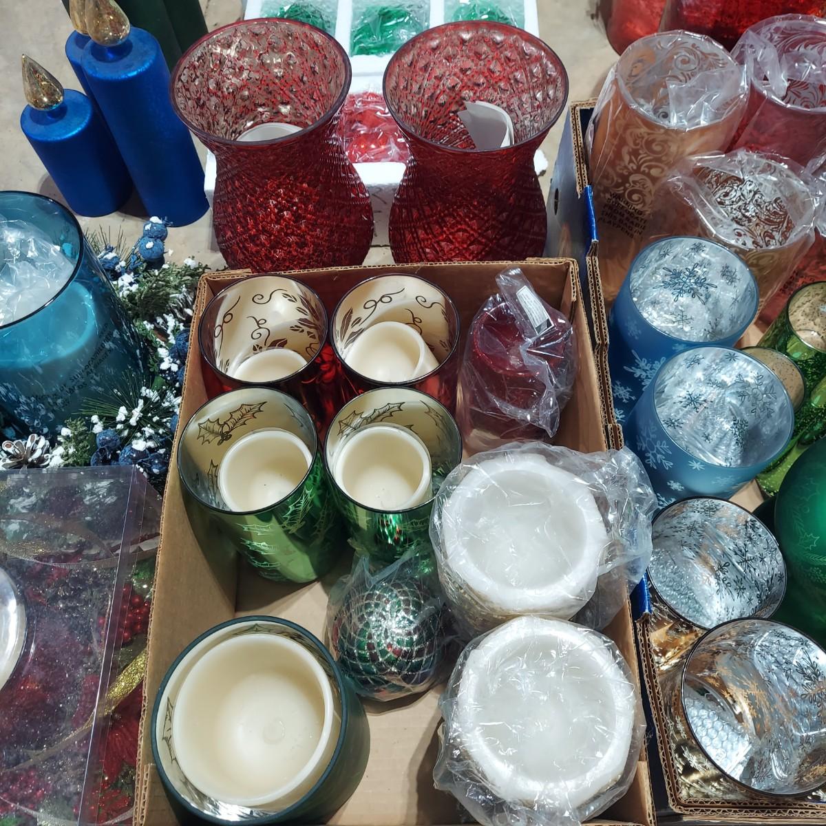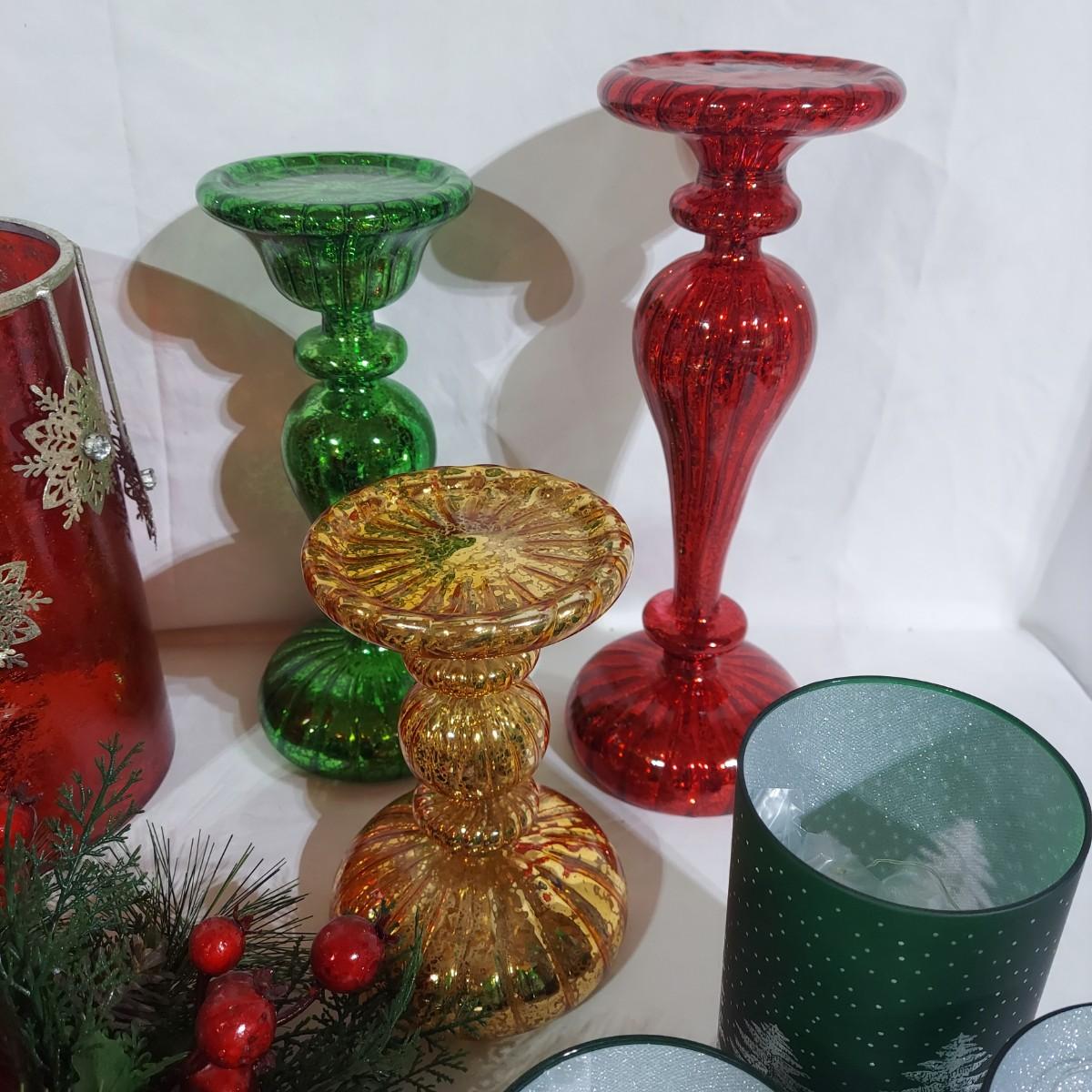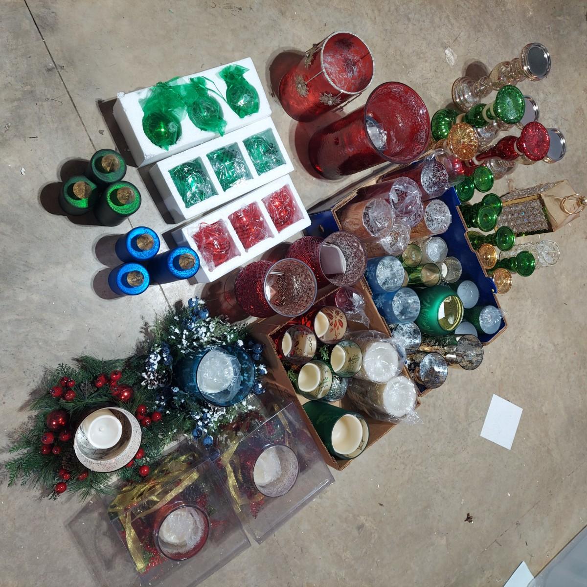 Large lot of Christmas Holiday decor. Includes several glass pedestals and glass candle holders. Plus flameless candles and led flicker power packs that give the appearance of flame inside of candle holders. The large red glass candle holder with metal snowflakes is 10"H. The faux candle sets are 7"H, 9"H and 11"H. Please see photos for details. Local Pickup Only.