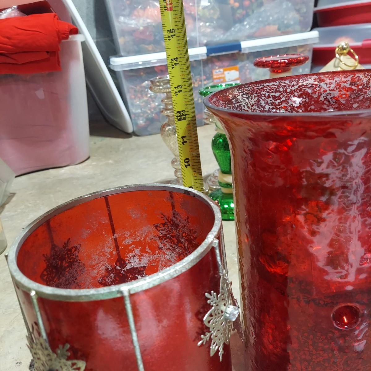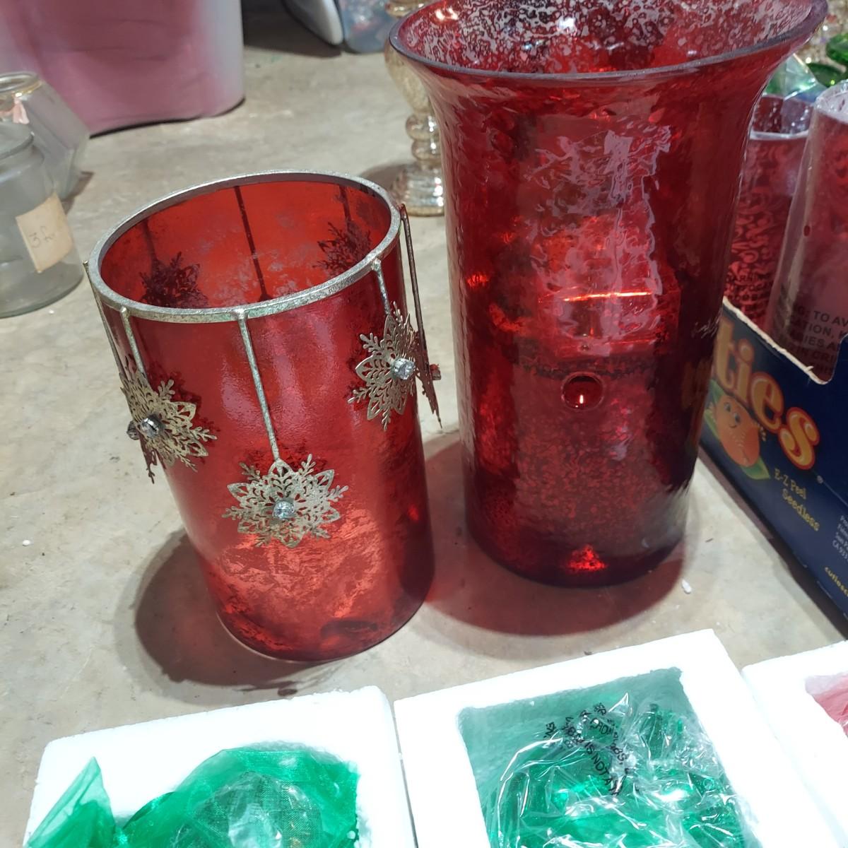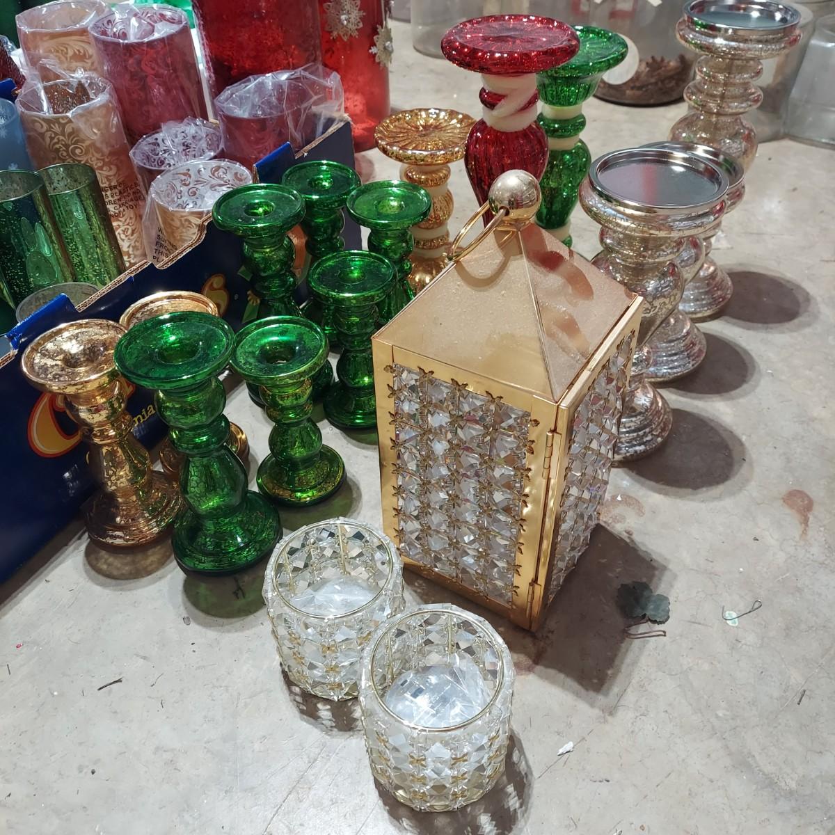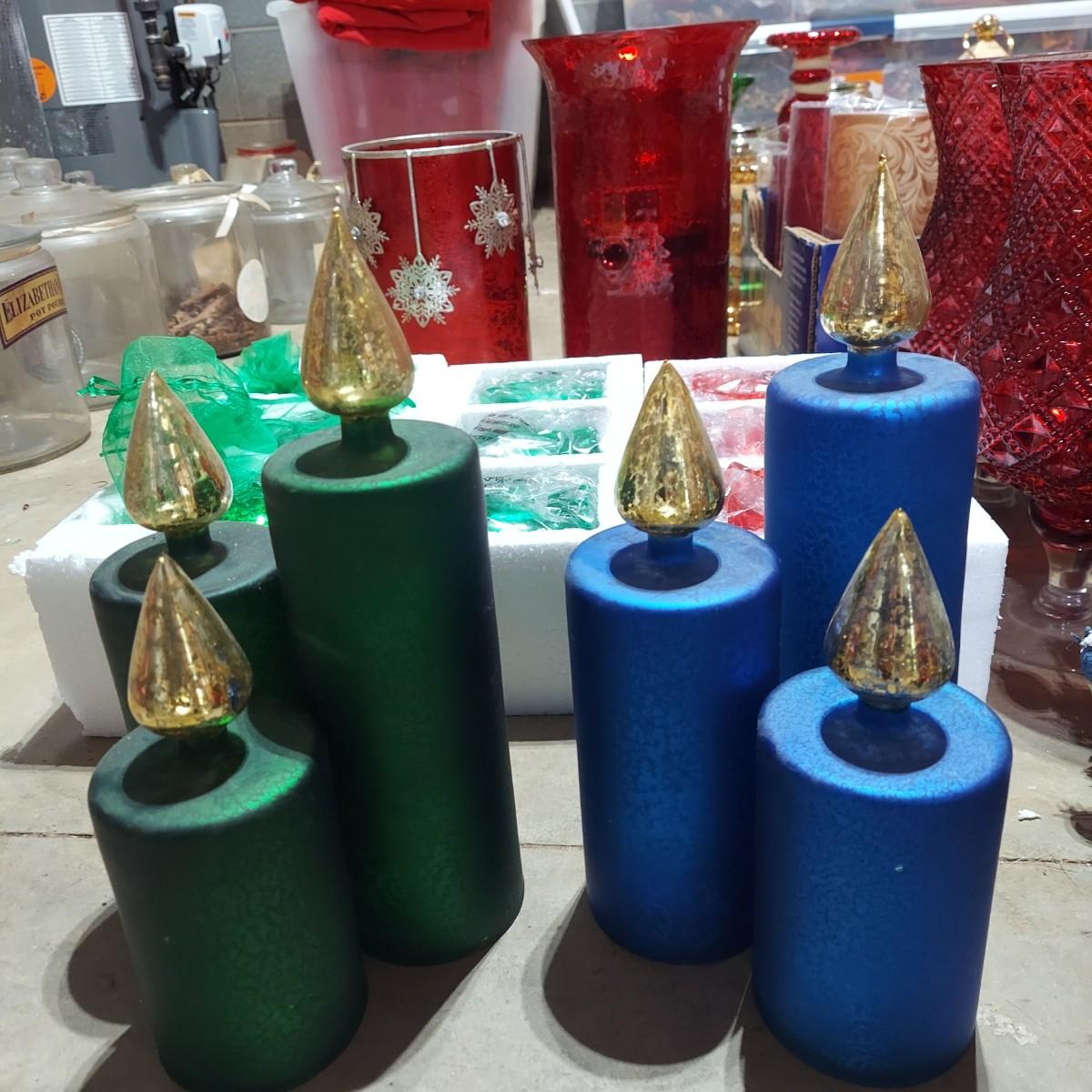 Large lot of Christmas Holiday decor. Includes several glass pedestals and glass candle holders. Plus flameless candles and led flicker power packs that give the appearance of flame inside of candle holders. The large red glass candle holder with metal snowflakes is 10"H. The faux candle sets are 7"H, 9"H and 11"H. Please see photos for details. Local Pickup Only.