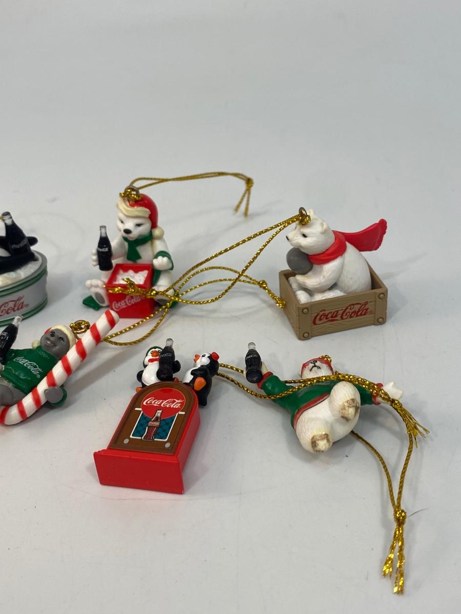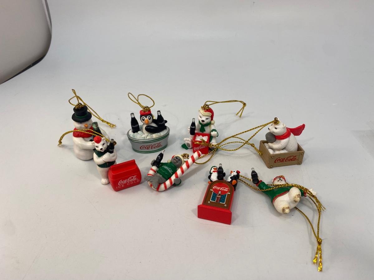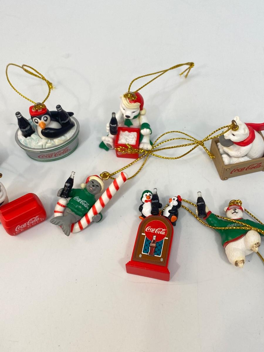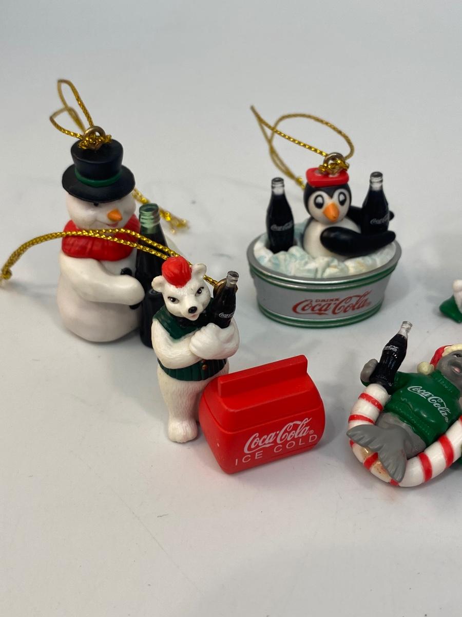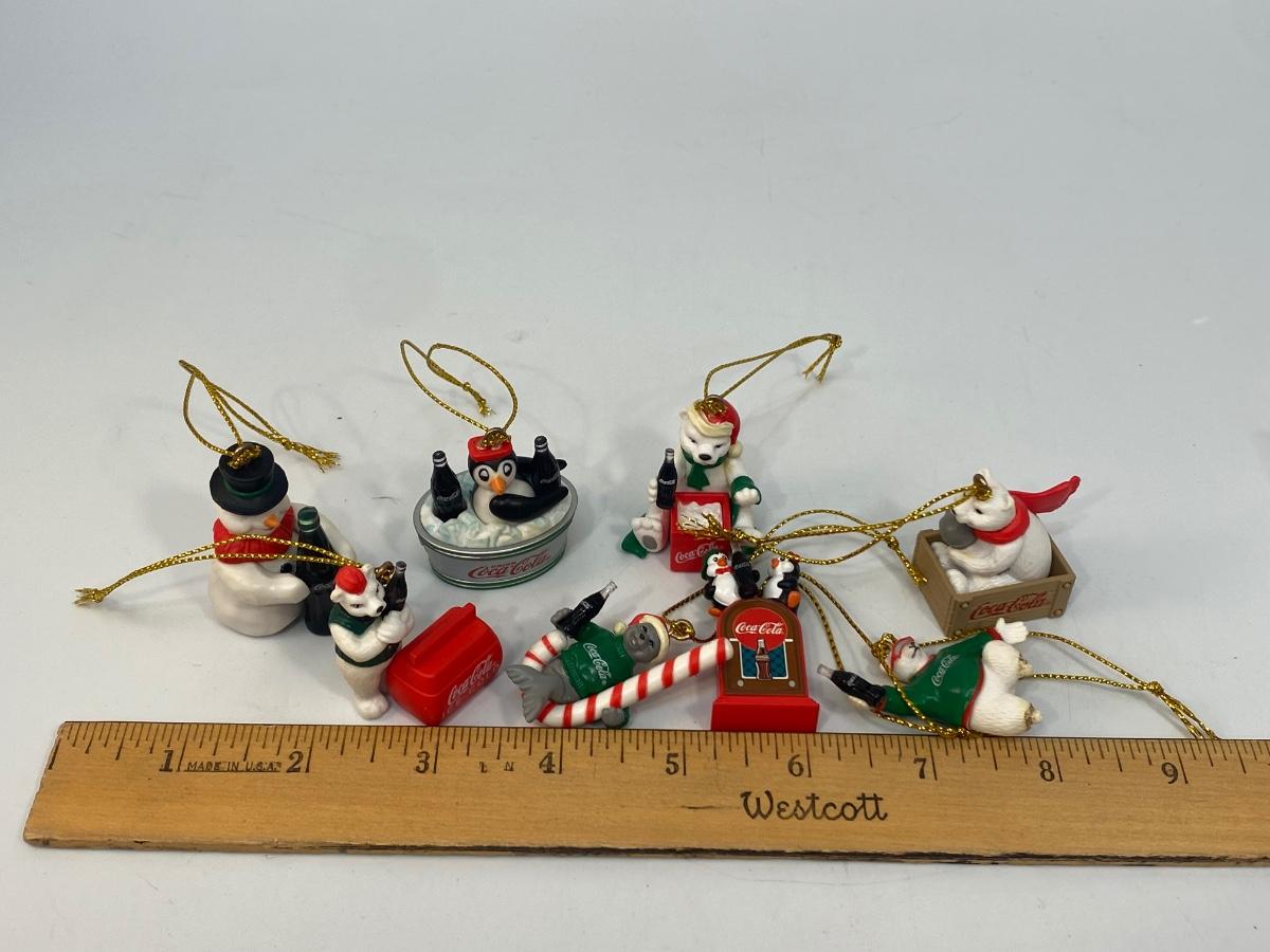 Christmas Holiday Coca Cola Themed Ornament Figurines. Lot of 8.