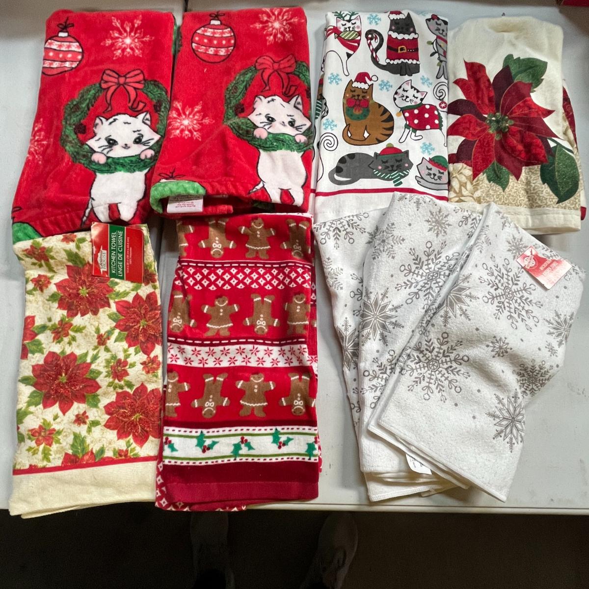 9 colorful towels, red, white, green, festive Christmas designs.
