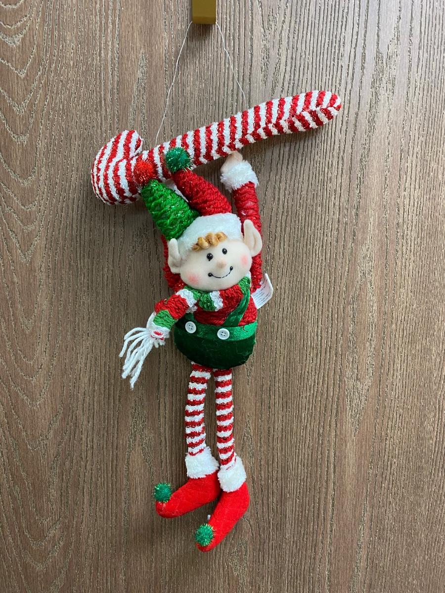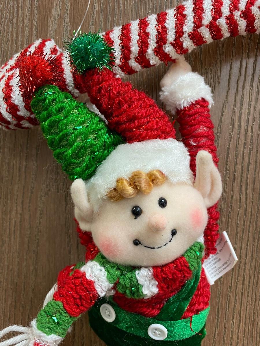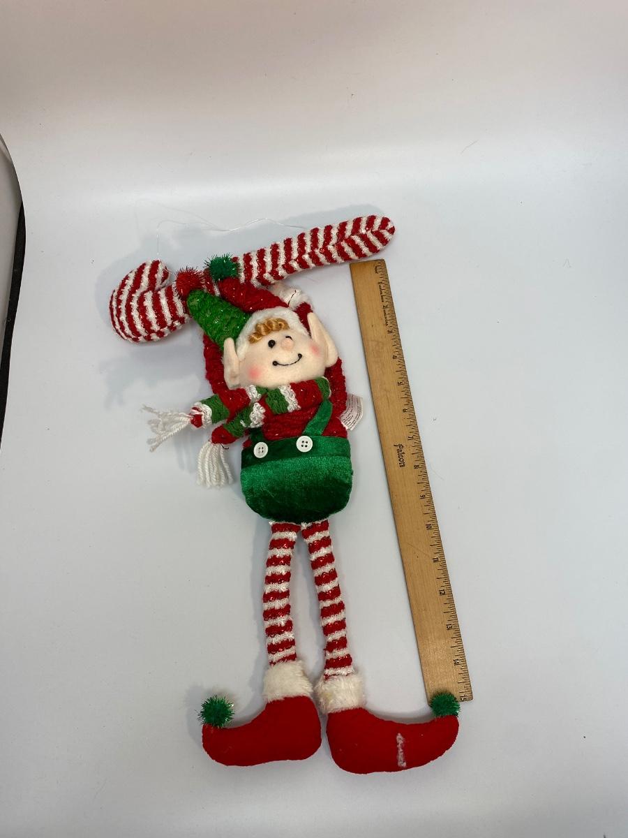Christmas Holiday Elf Dangling from Candy Cane Hanging Plush. About 15" size. Good condition.