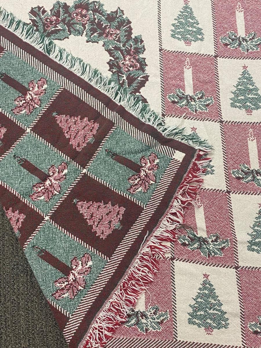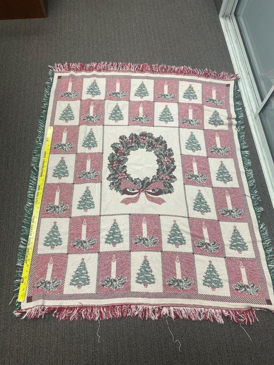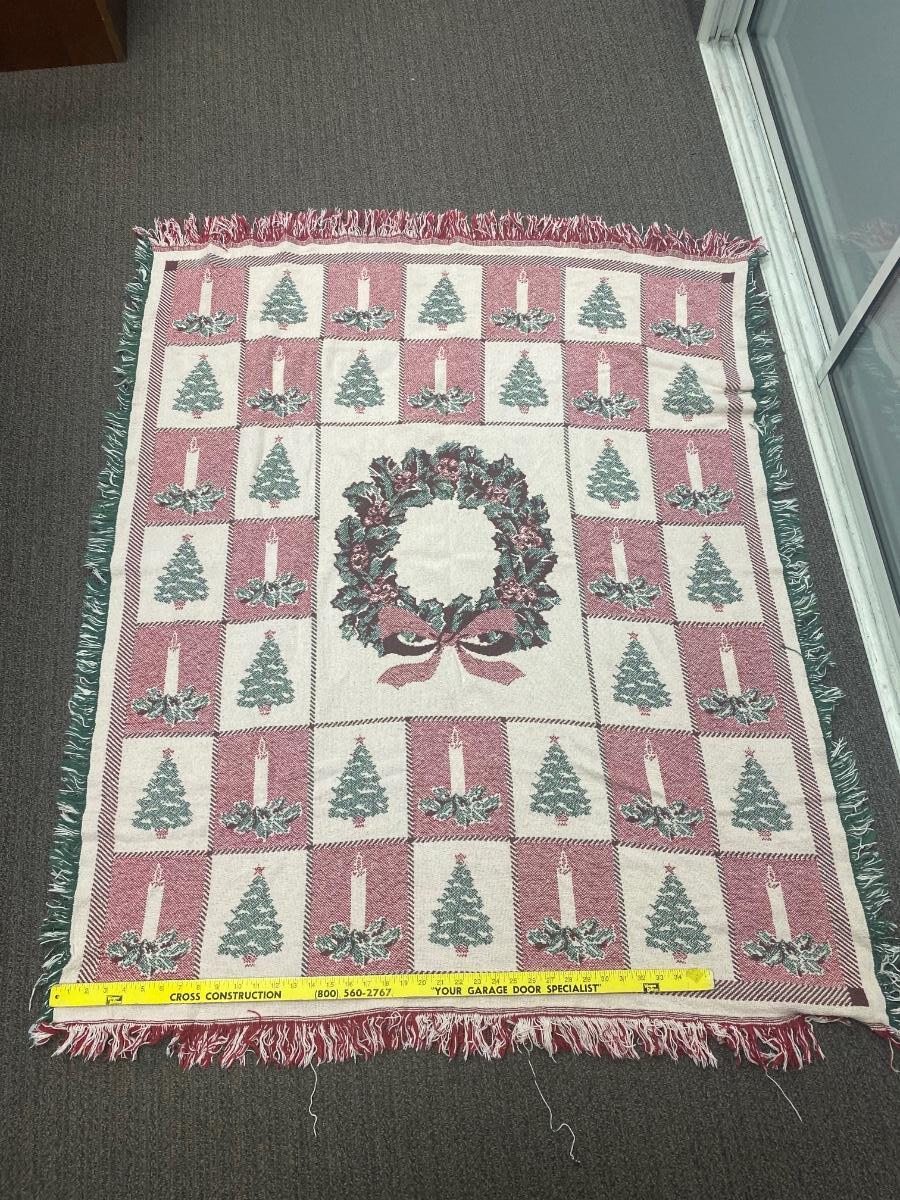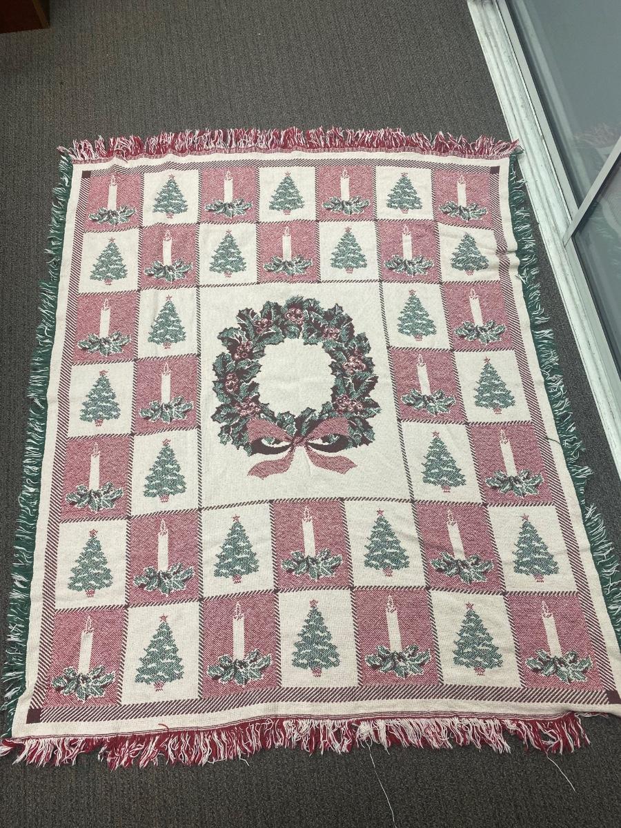 Christmas holiday throw blanket. Reversible image, fringe edge. In good condition. About 4'x5' size.