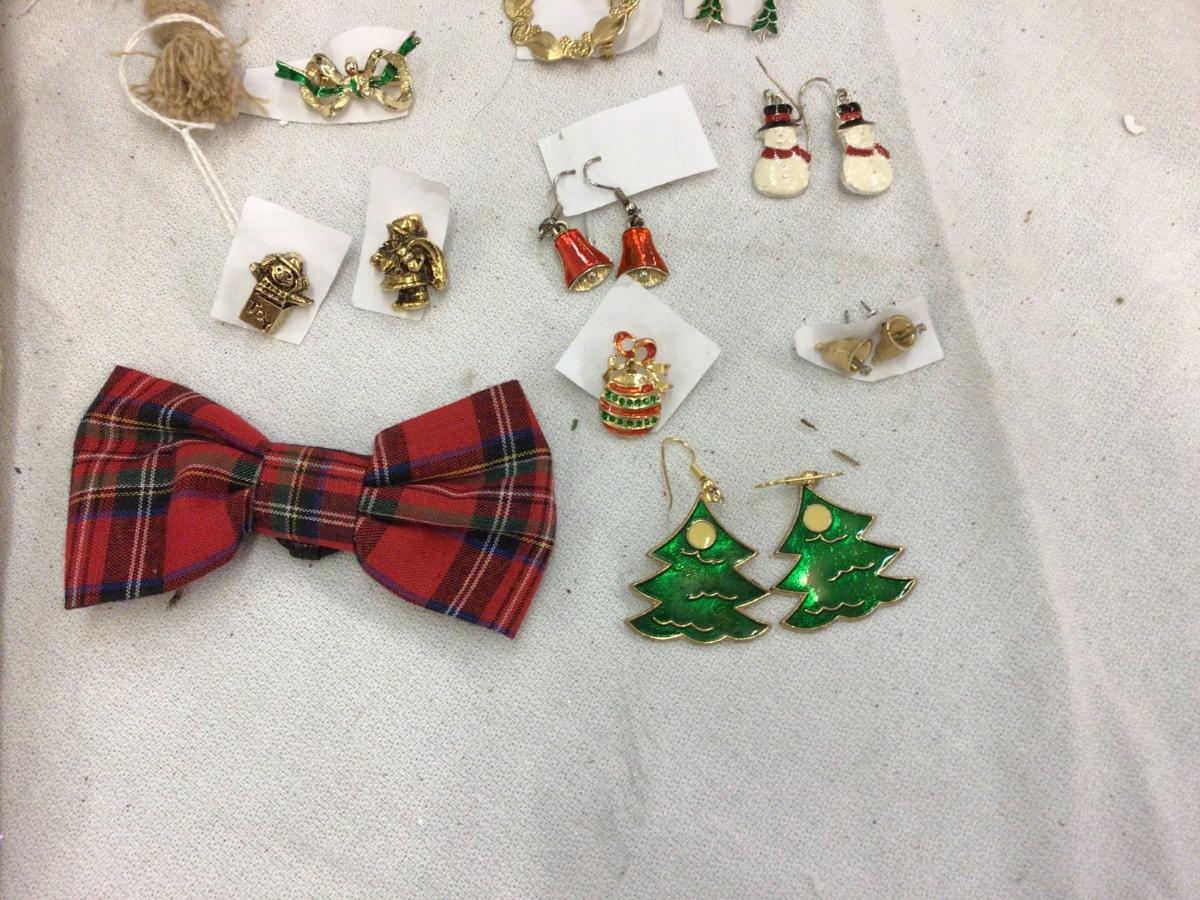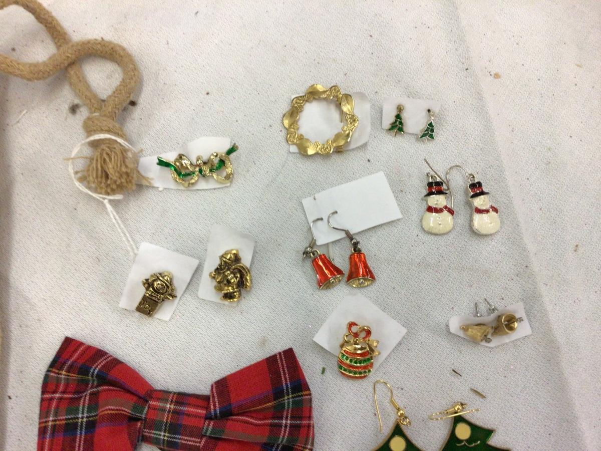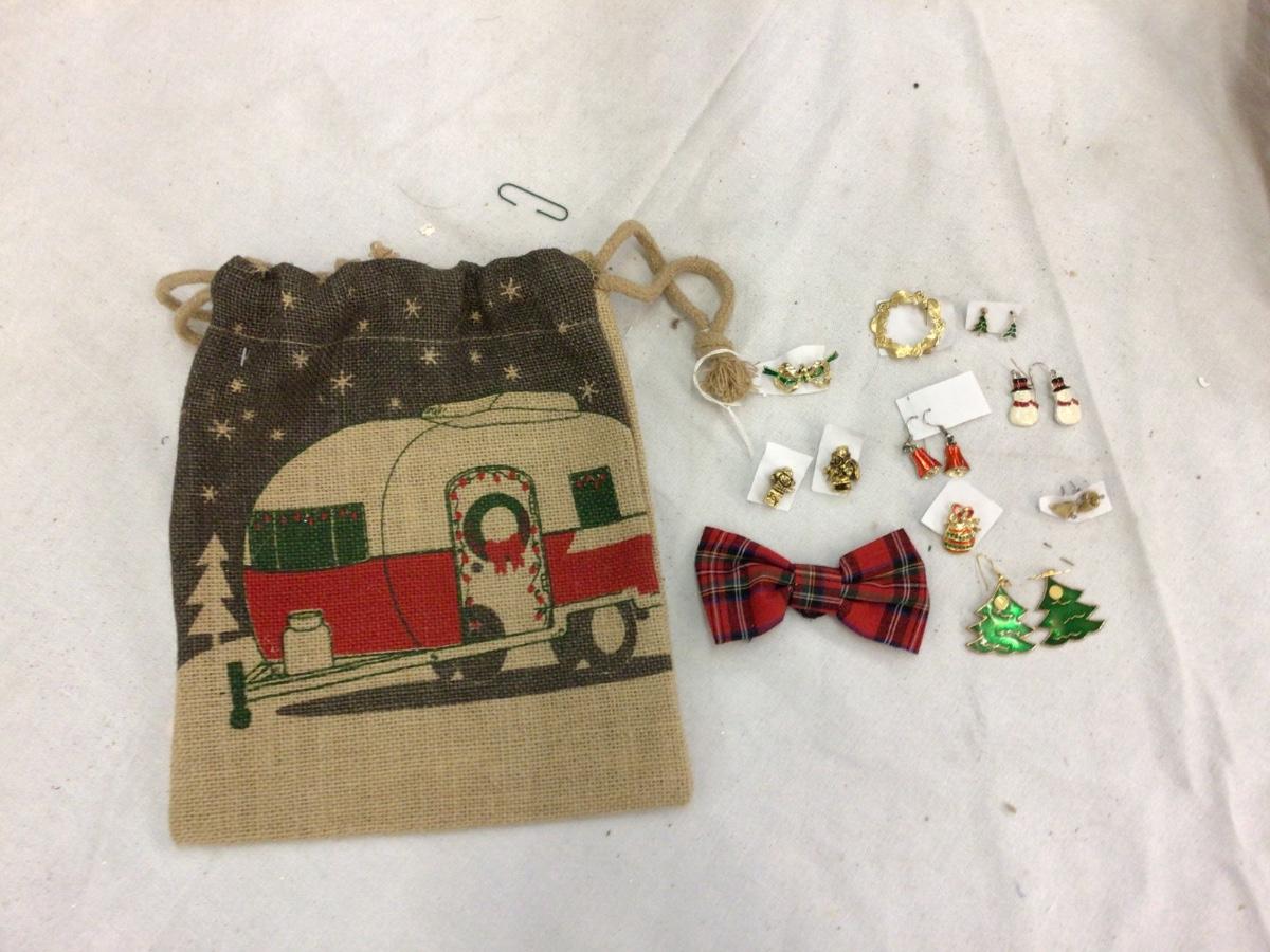 You get 5 sets of earring, 5 pins, bow tie and gunny sack all Christmas themed.