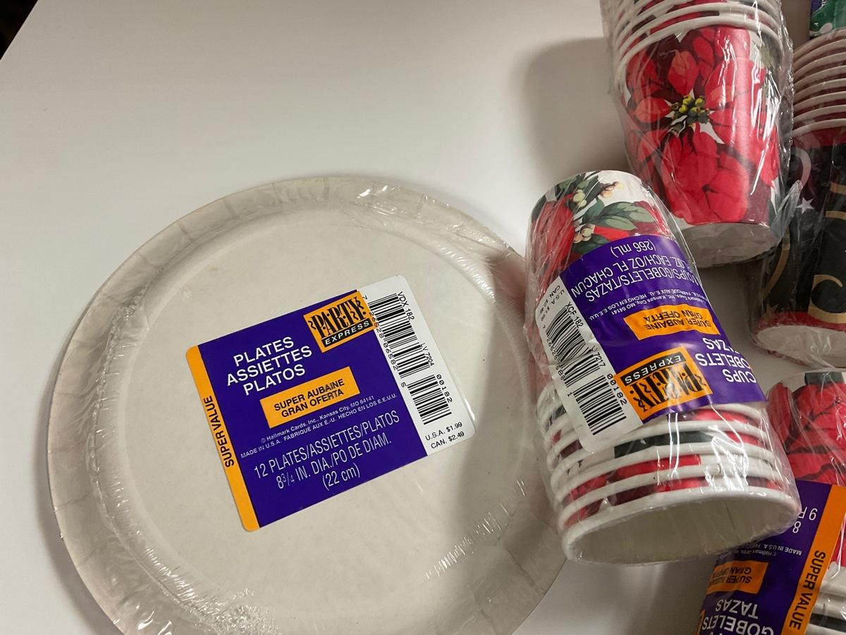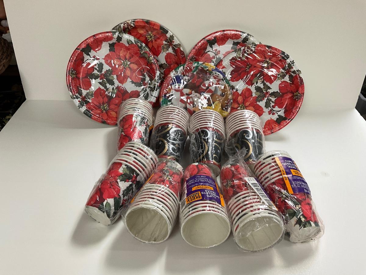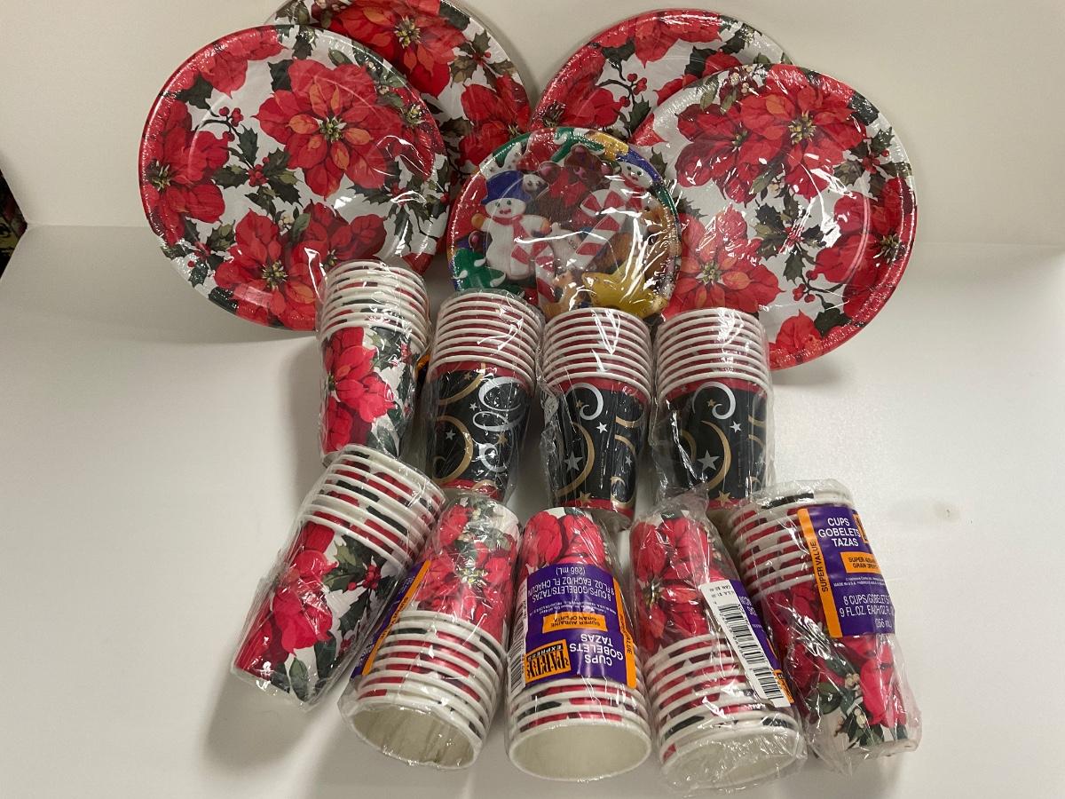 Christmas holiday paper goods lot. - paper party plates and cups, unused