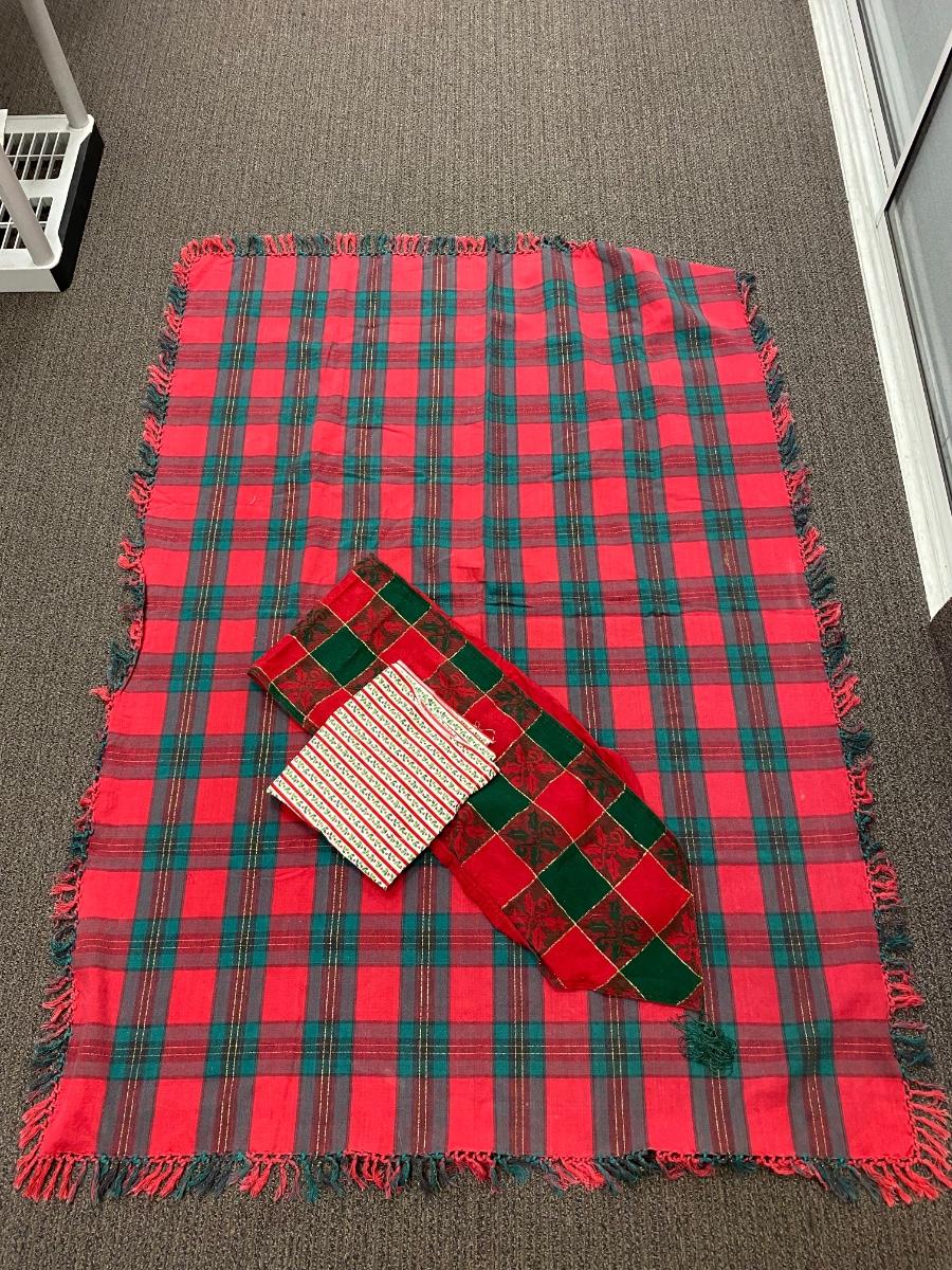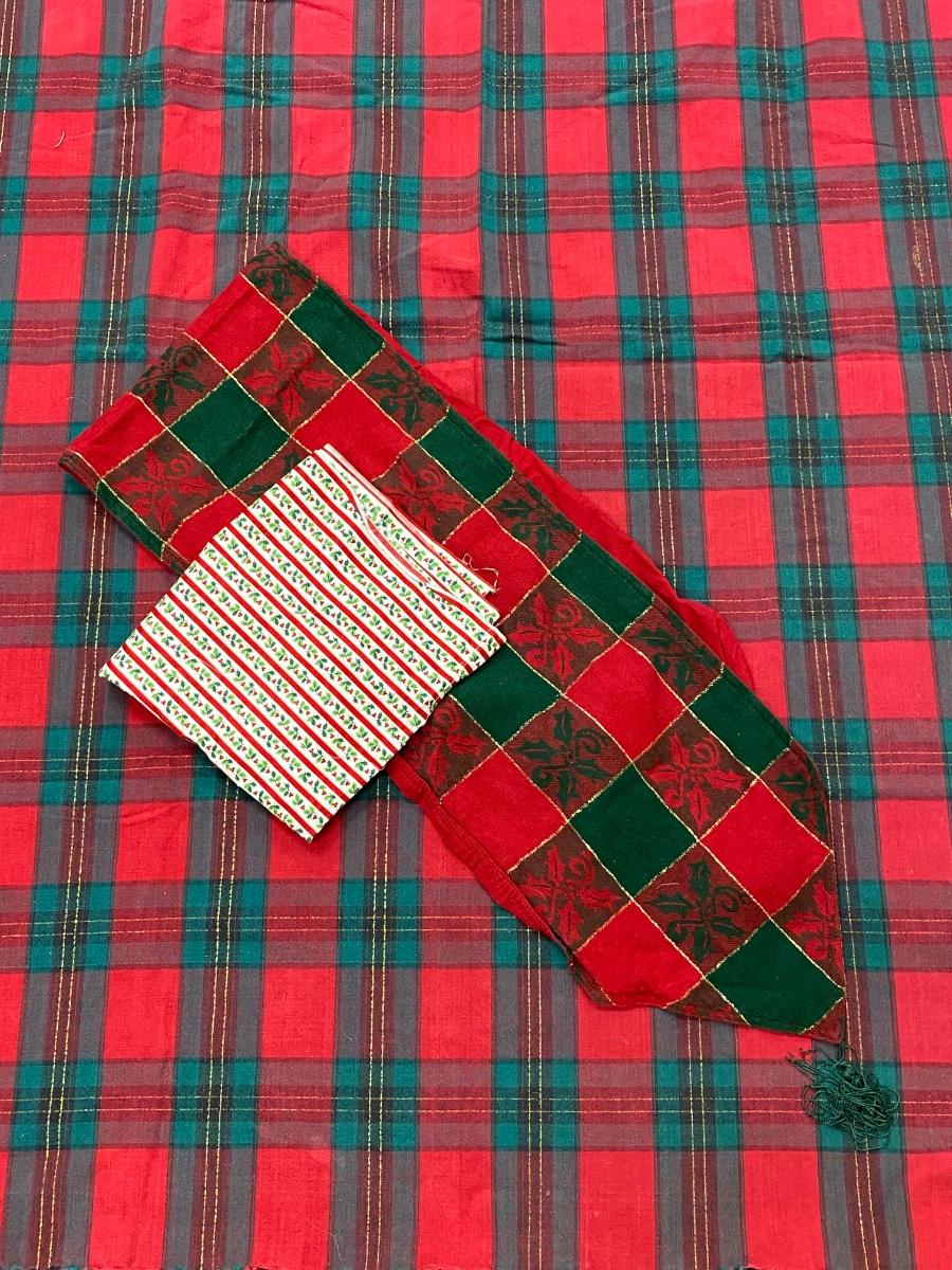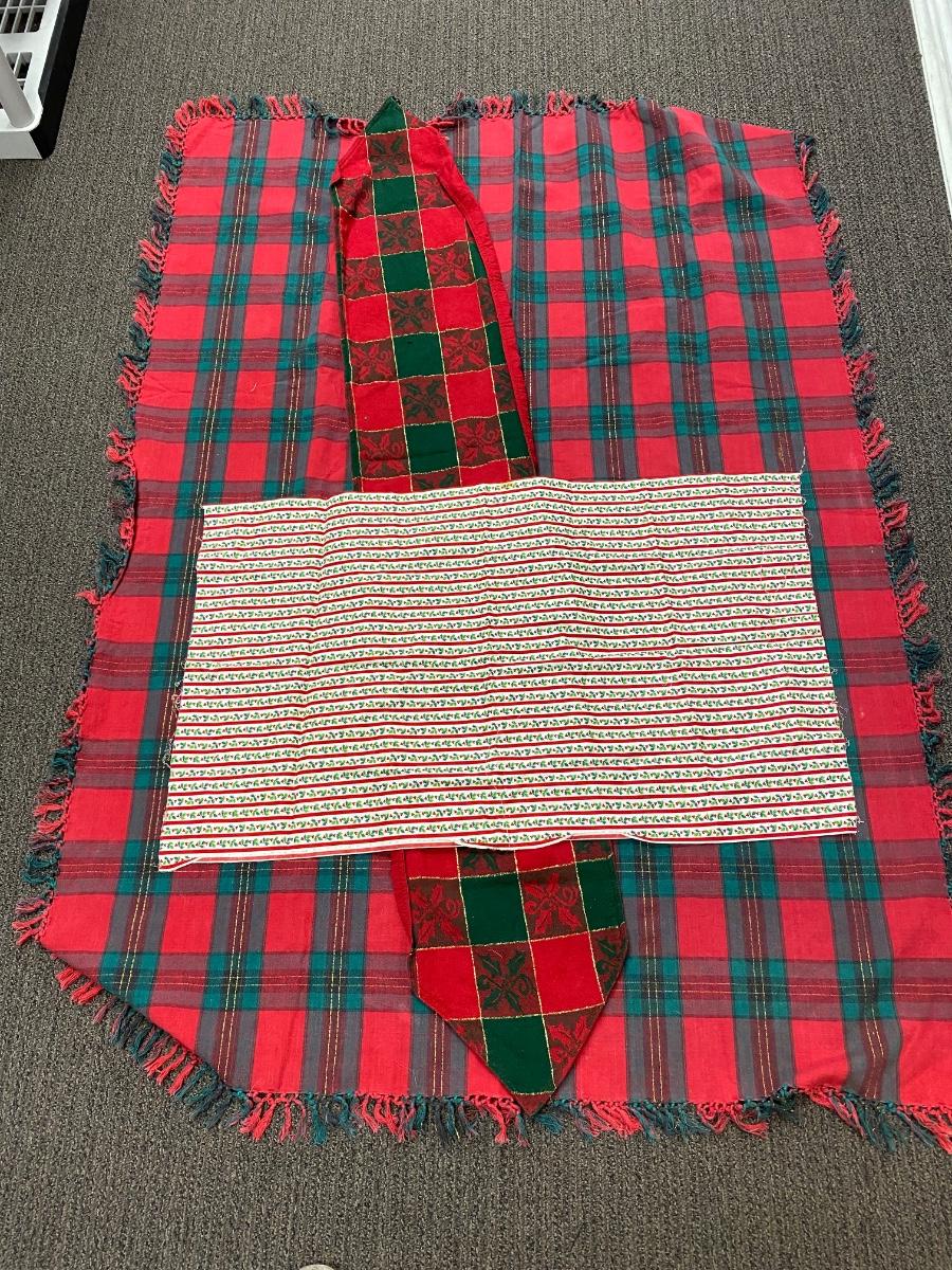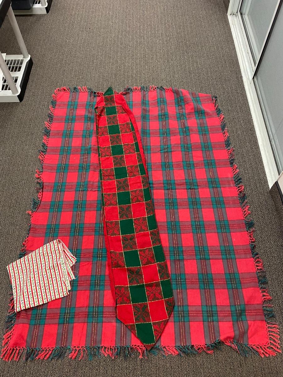 Christmas holiday theme table linens and small piece of fabric. All in good used condition, may have light fade. The table runner is missing a tassel from one end. Tablecloth is about 60"x40" size.