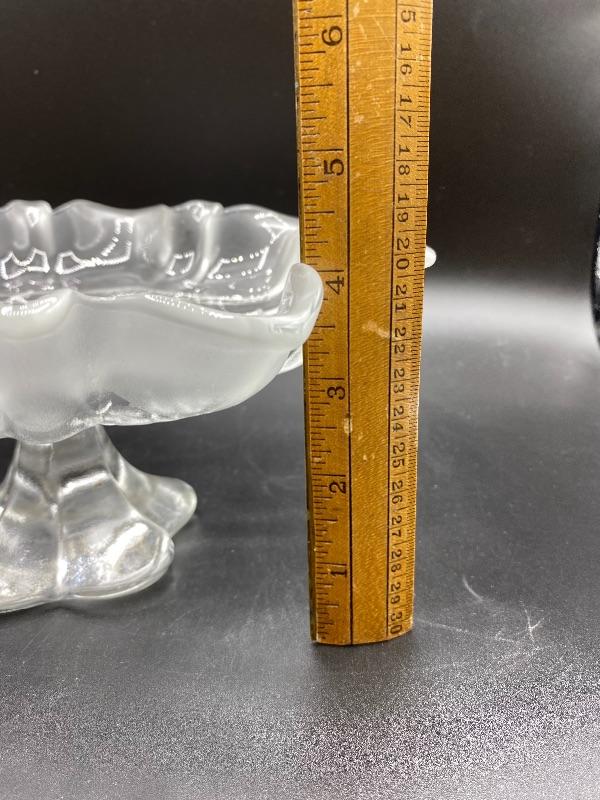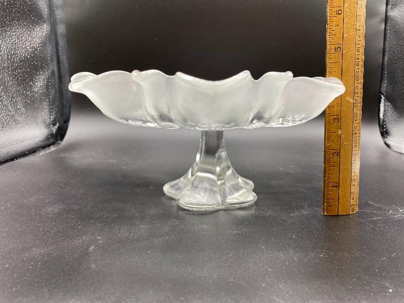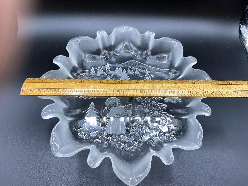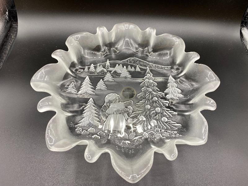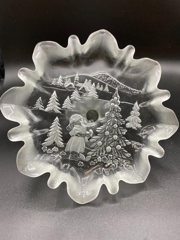 Decorative Christams holiday footed dish. Shows a child decorating a tree. Frosted edge and design. Good condition. About 10" wide and 4" tall.