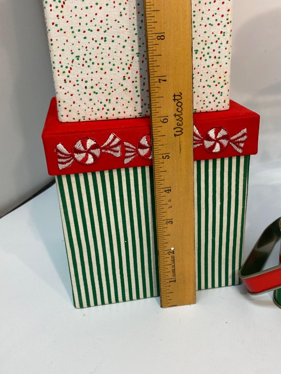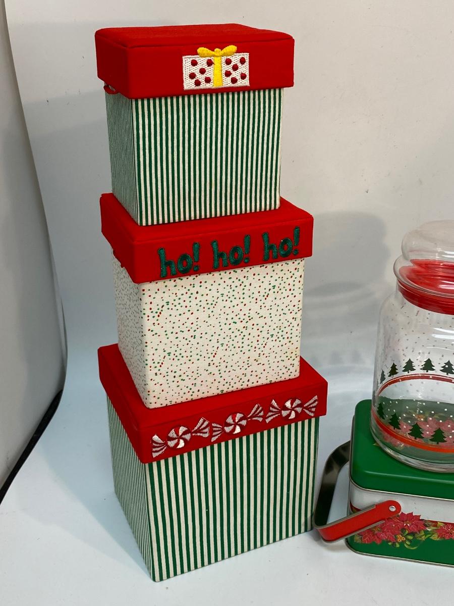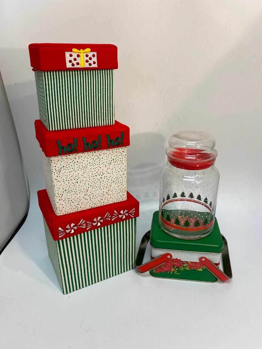 Christmas Holiday Seasonal Box Set Tin & Glass Canister Jar. Good condition. Fabric covered boxes fit inside of each other.