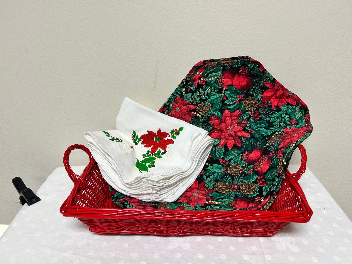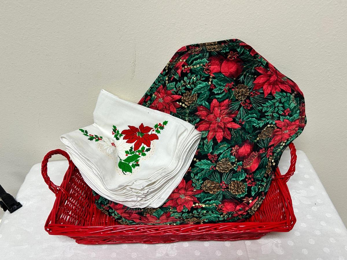 Christmas Holiday Table Linens Napkins Placemats and Red Basket