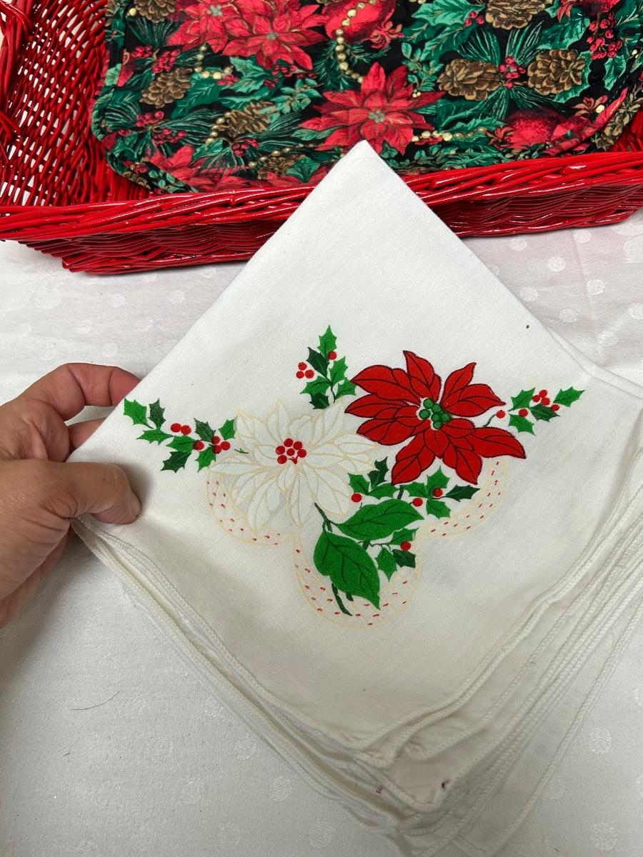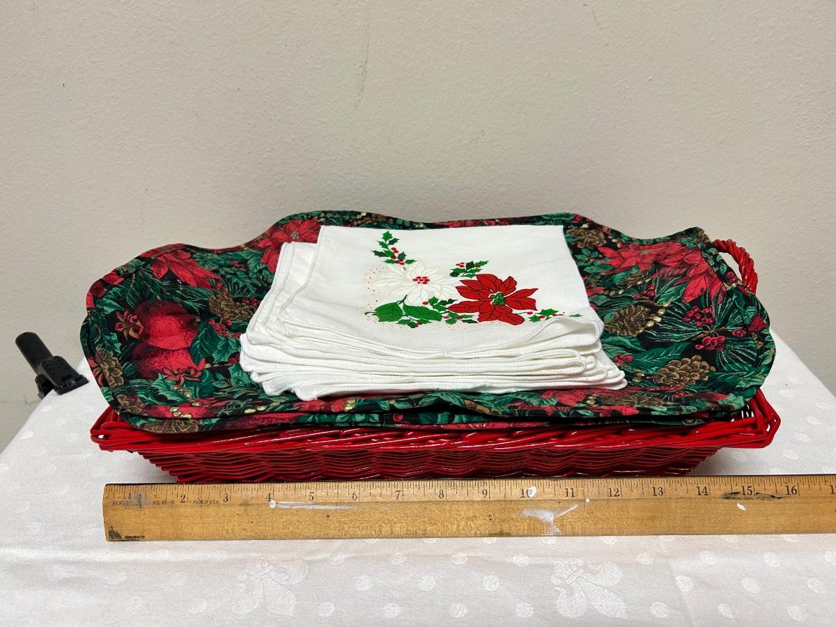 Christmas Holiday Table Linens Napkins Placemats and Red Basket. Some faint spots on napkins and three placemats.
