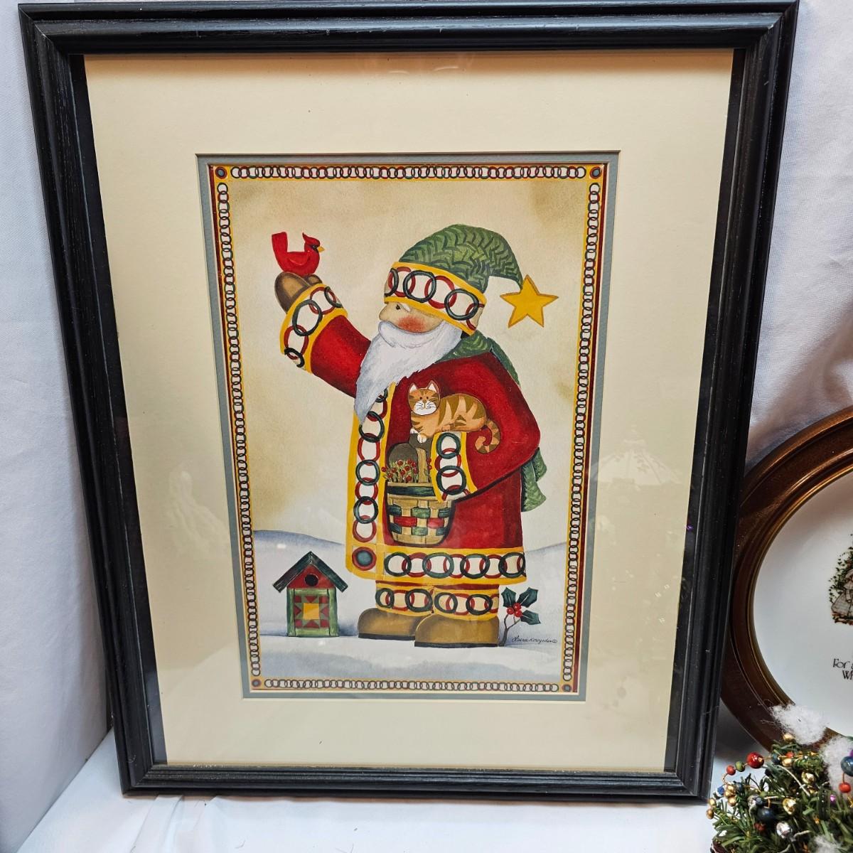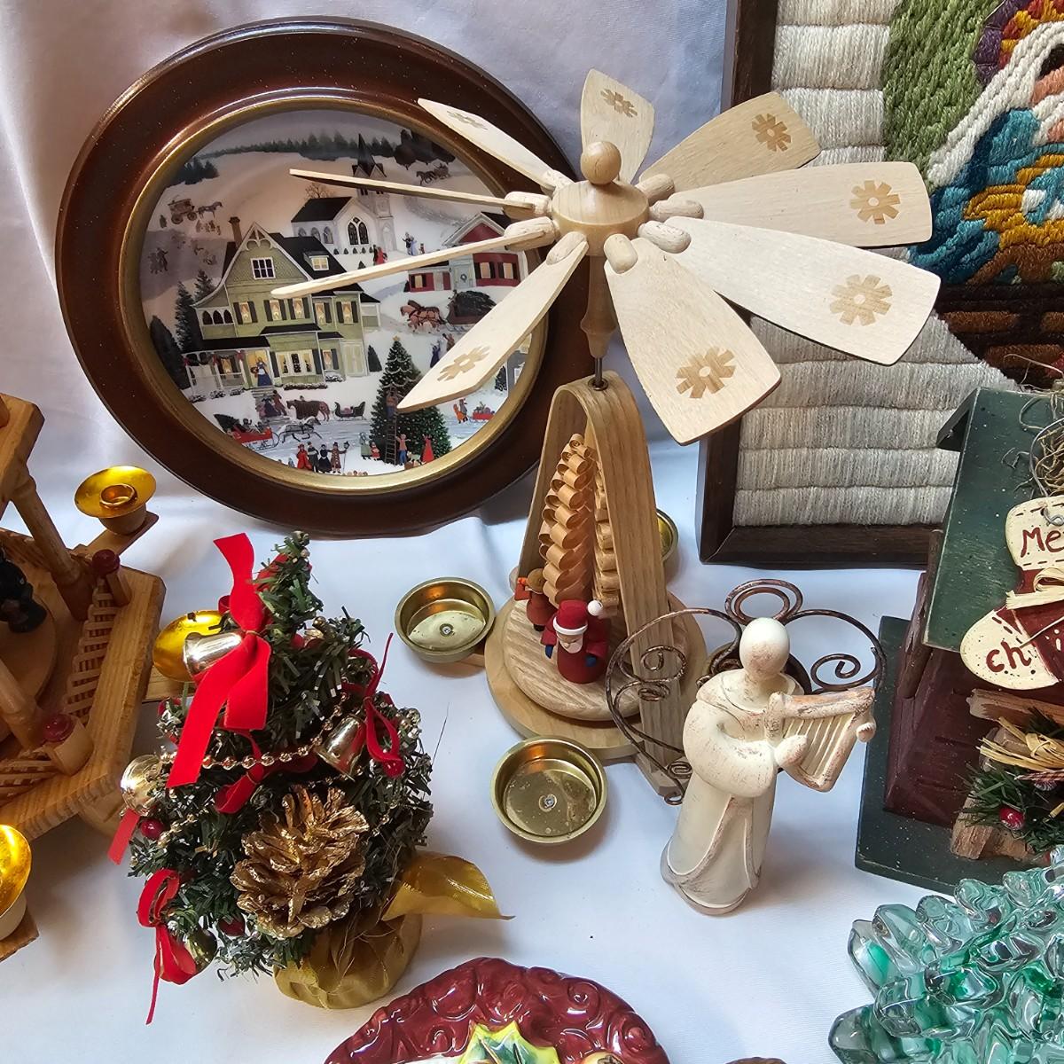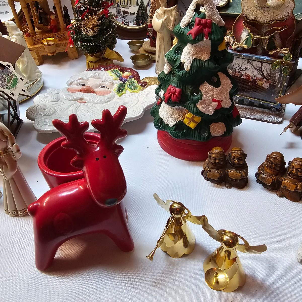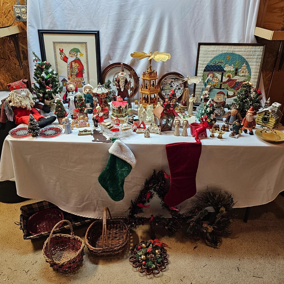 An abundance of all things Christmas to decorate your home. Angels, trees, reindeer, children, plates, bowls, pictures and more. Tall wooden pyramid is 12" x 17"H. Santa picture is 18" x 22", and the tapestry is 19" x 19". Also baskets and woven reed decor items. See photos for details. Local pickup only.