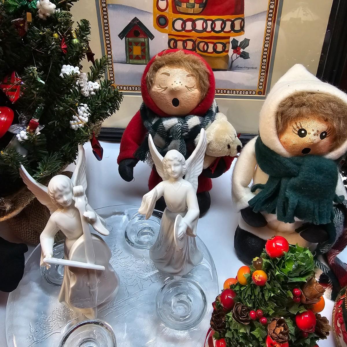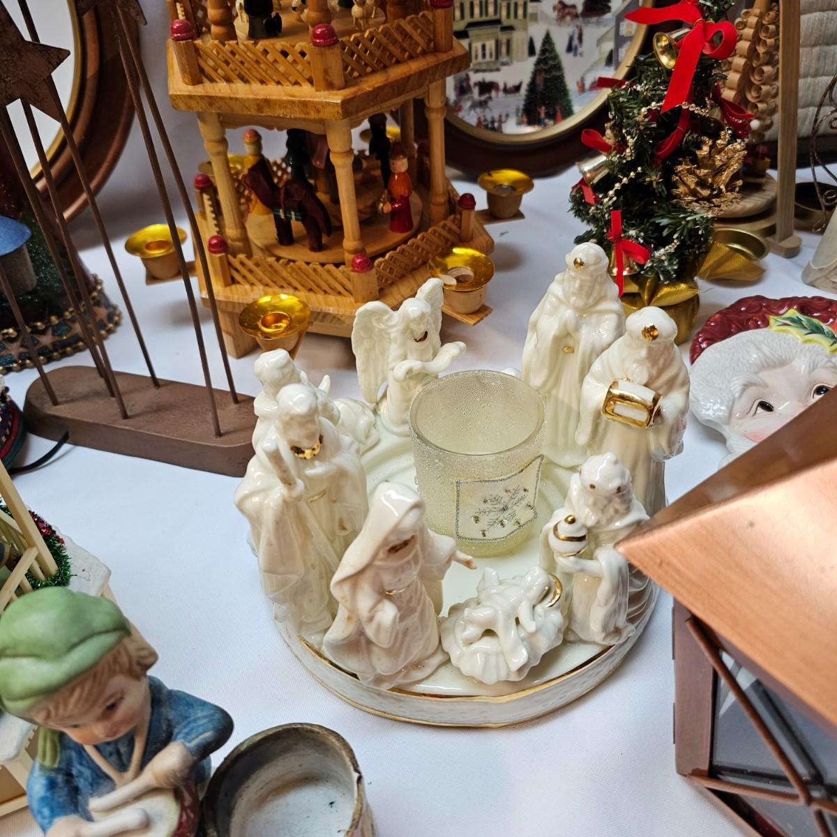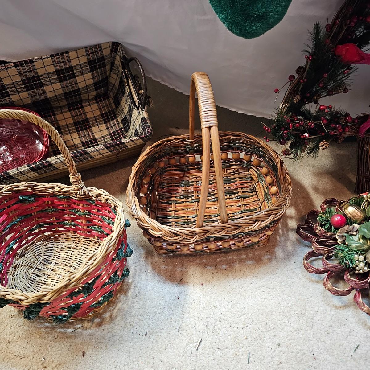 An abundance of all things Christmas to decorate your home. Angels, trees, reindeer, children, plates, bowls, pictures and more. Tall wooden pyramid is 12" x 17"H. Santa picture is 18" x 22", and the tapestry is 19" x 19". Also baskets and woven reed decor items. See photos for details. Local pickup only.