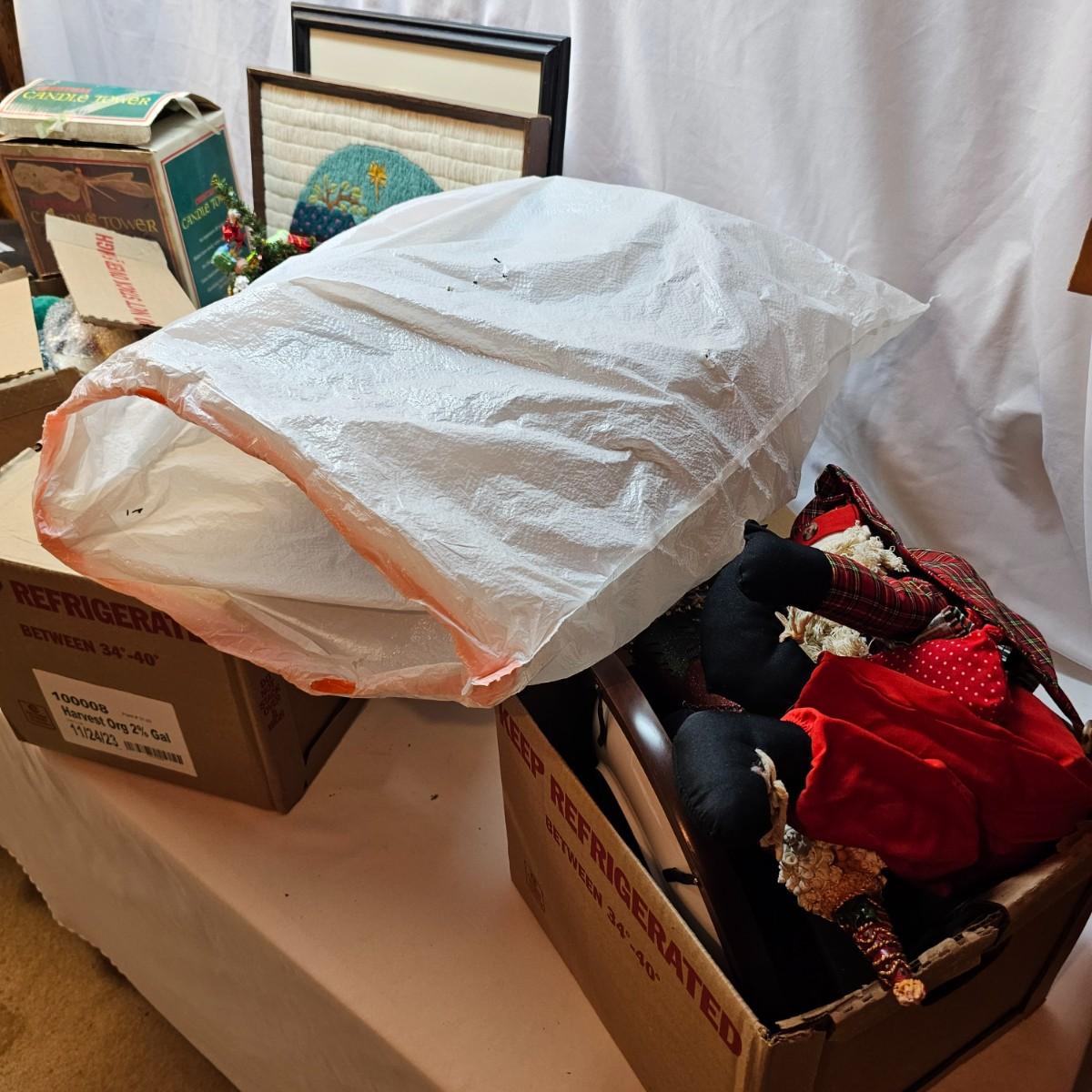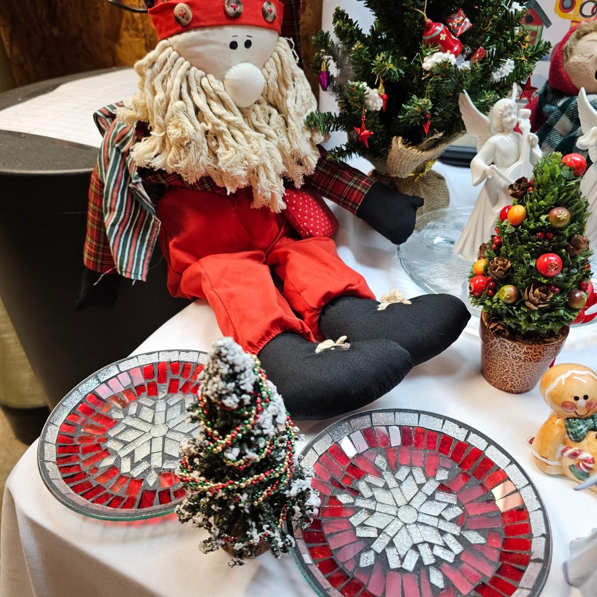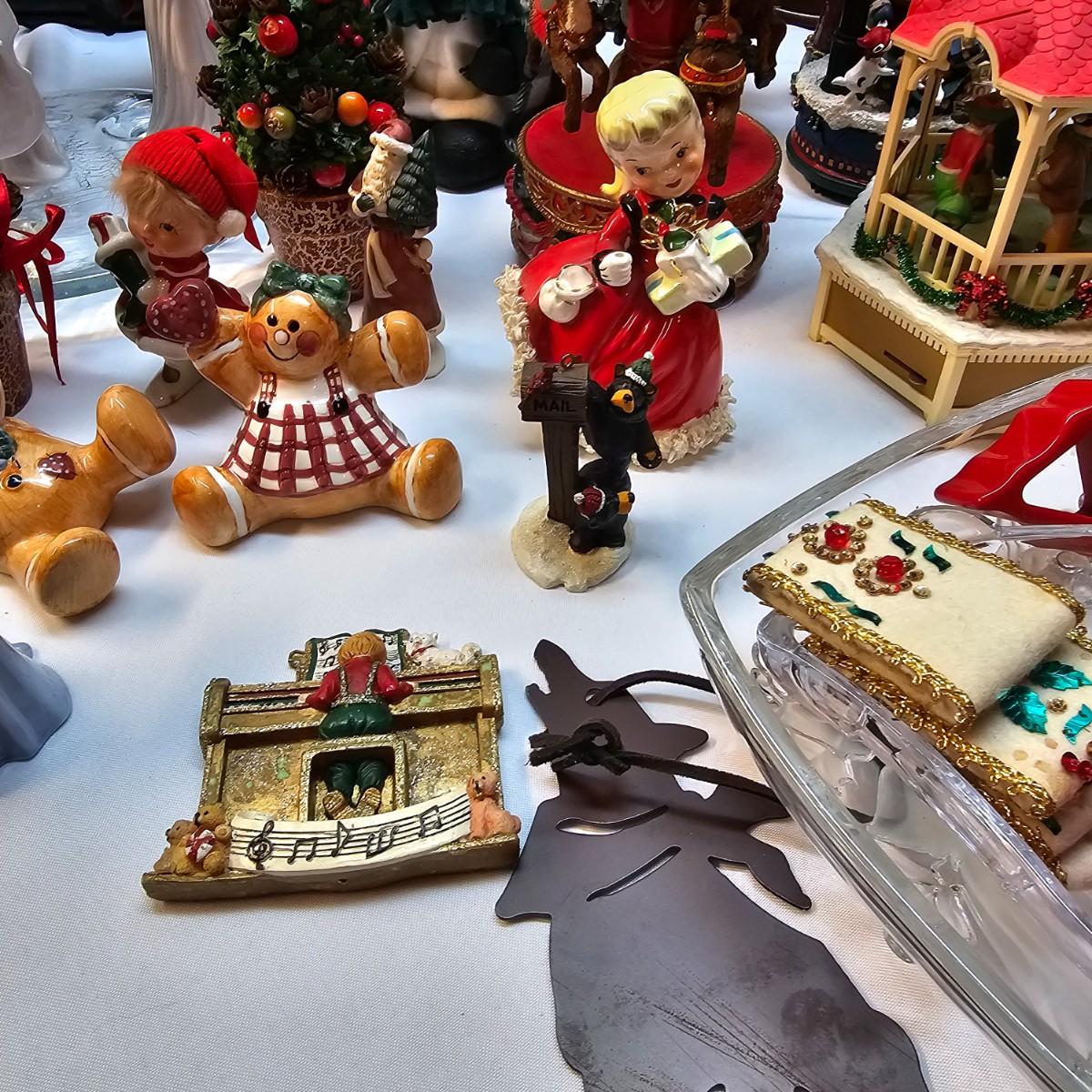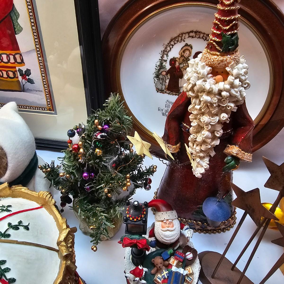 An abundance of all things Christmas to decorate your home. Angels, trees, reindeer, children, plates, bowls, pictures and more. Tall wooden pyramid is 12" x 17"H. Santa picture is 18" x 22", and the tapestry is 19" x 19". Also baskets and woven reed decor items. See photos for details. Local pickup only.