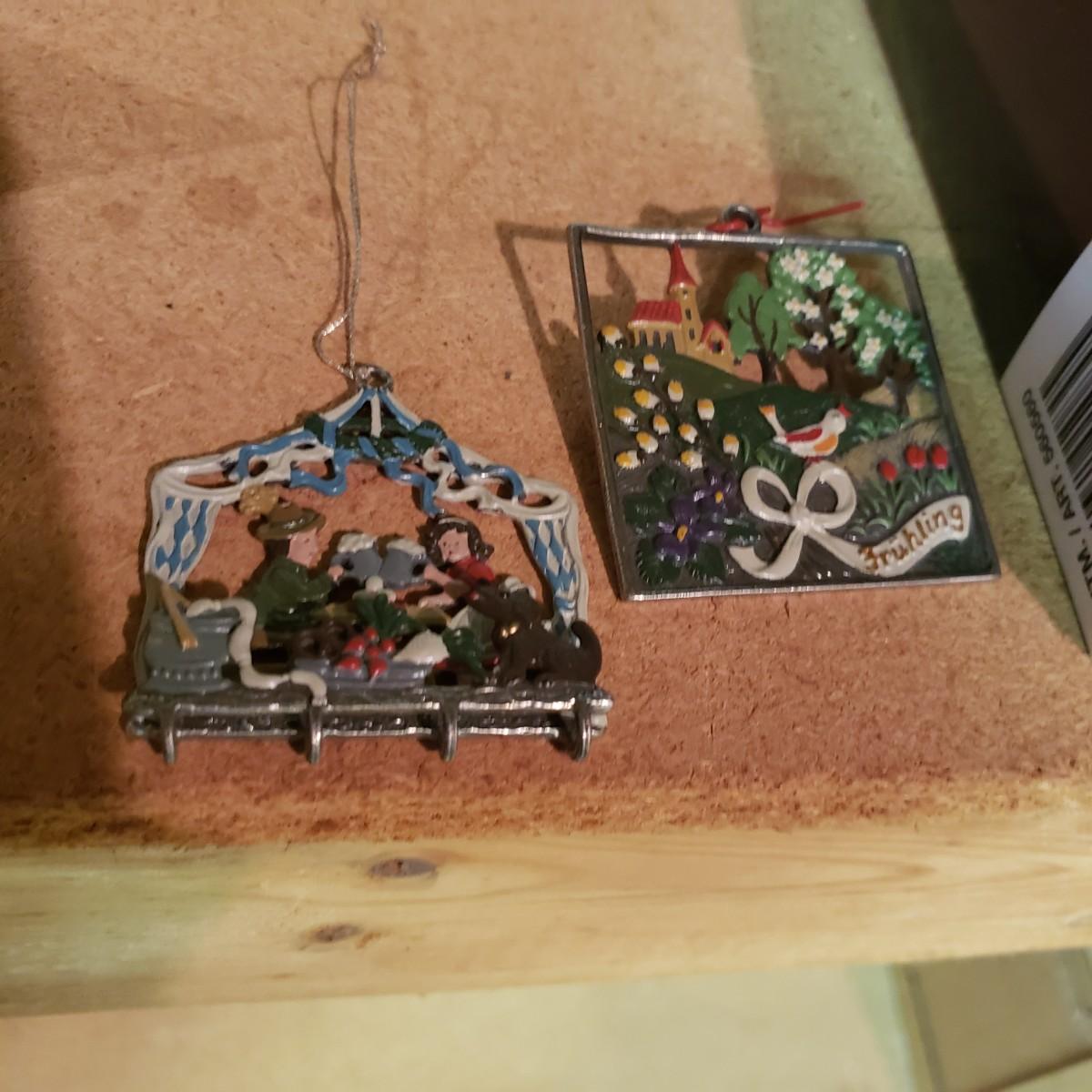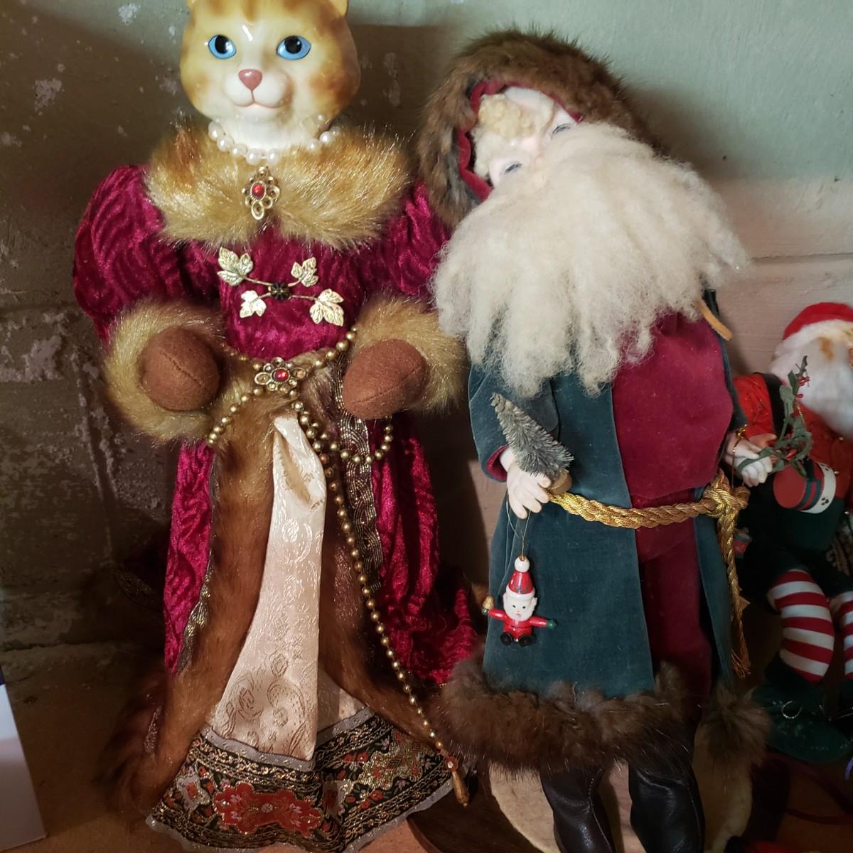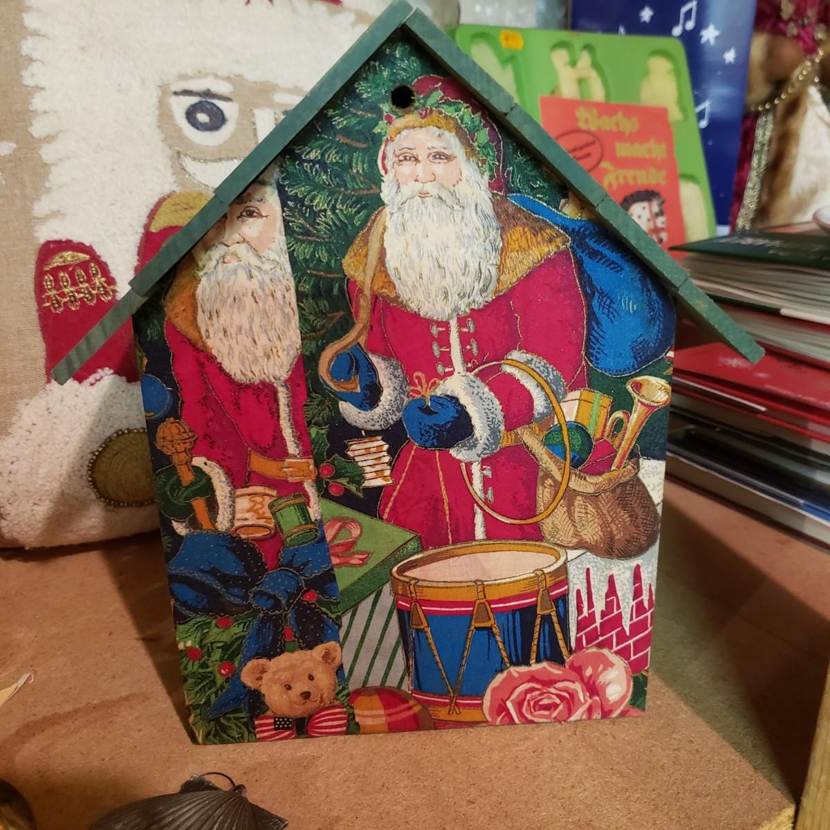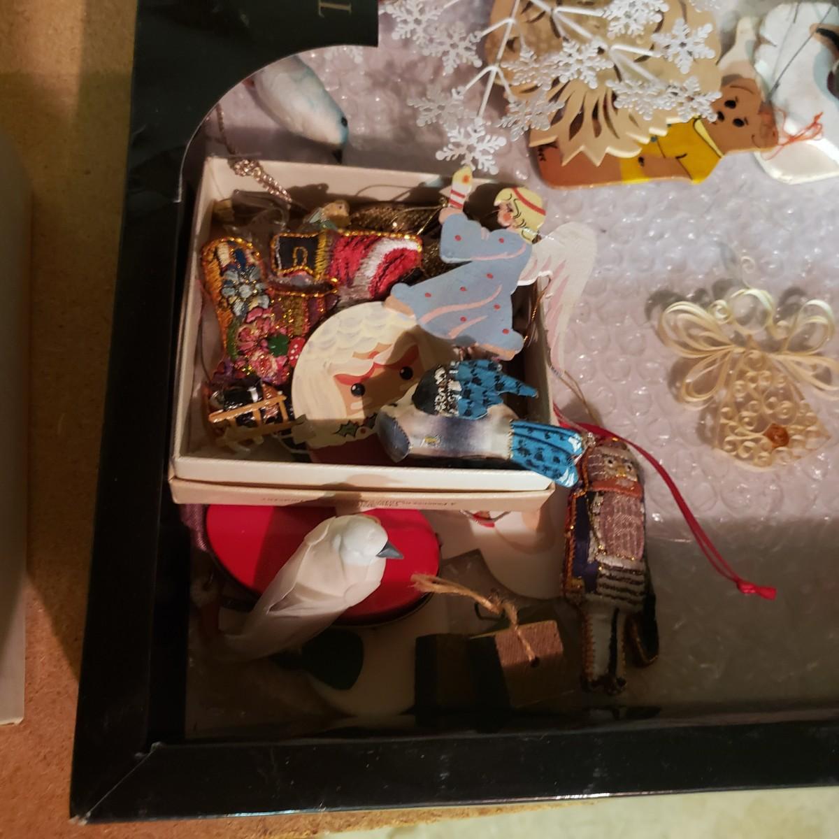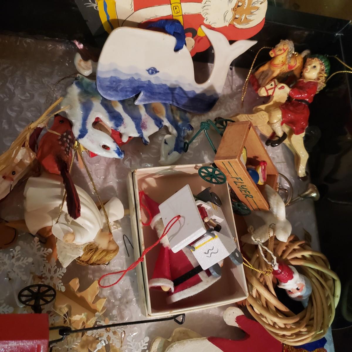 It's never too early for Christmas! There are unique ornaments, a brass snowflake (8") and reindeer (3" x 2") and a jingle bell wreath to ring off the celebration. The standing Santa Cat and the other two vintage old style Santas measure approximately 5" x 13"H. There are two wax ornaments from Germany still in the original boxes. The birdhouse has brilliant colors and such details. The stack of children's Christmas books are in great shape. This lot only pertains to the items on the one shelf, nothing below on the bottom shelf. Please see photos for inventory.
