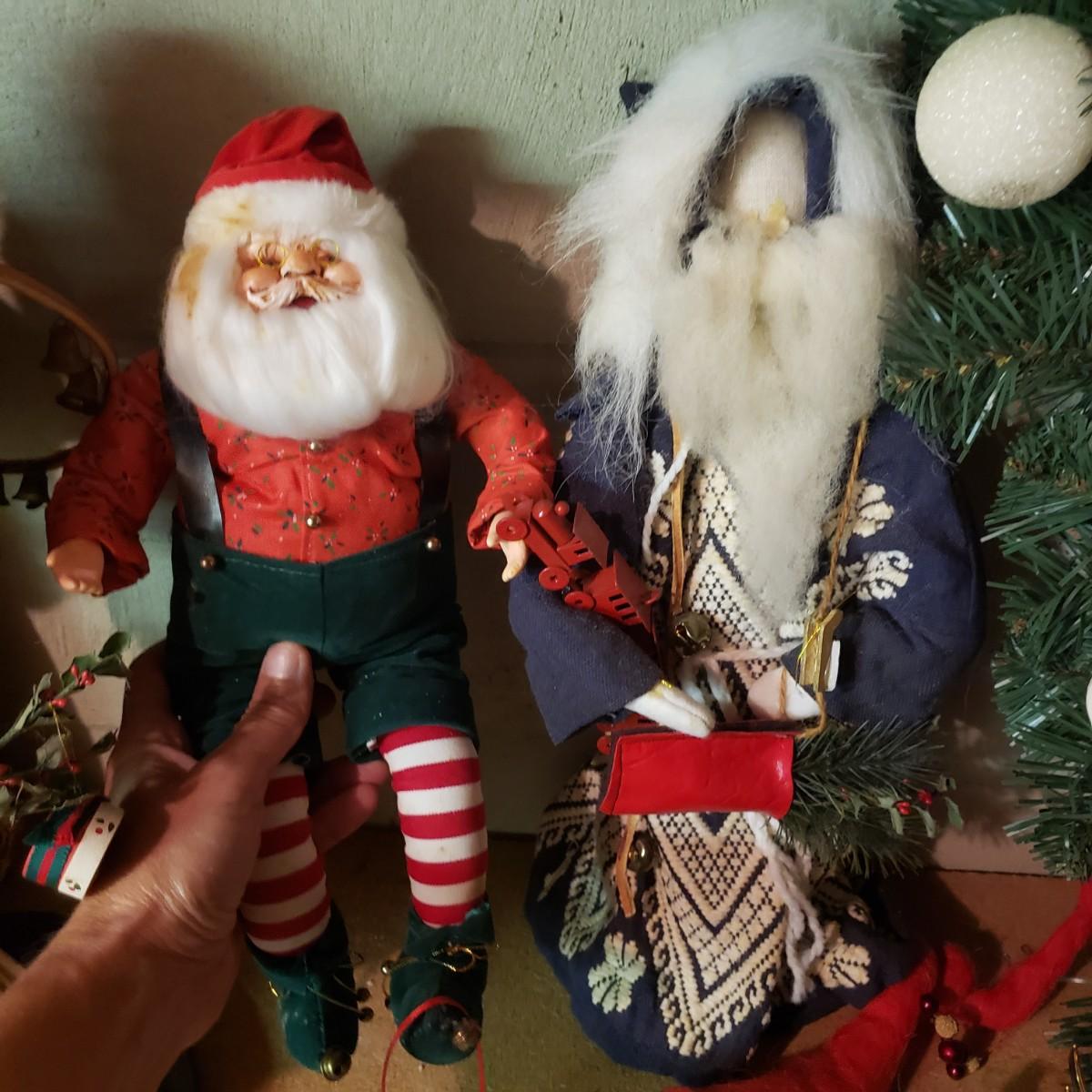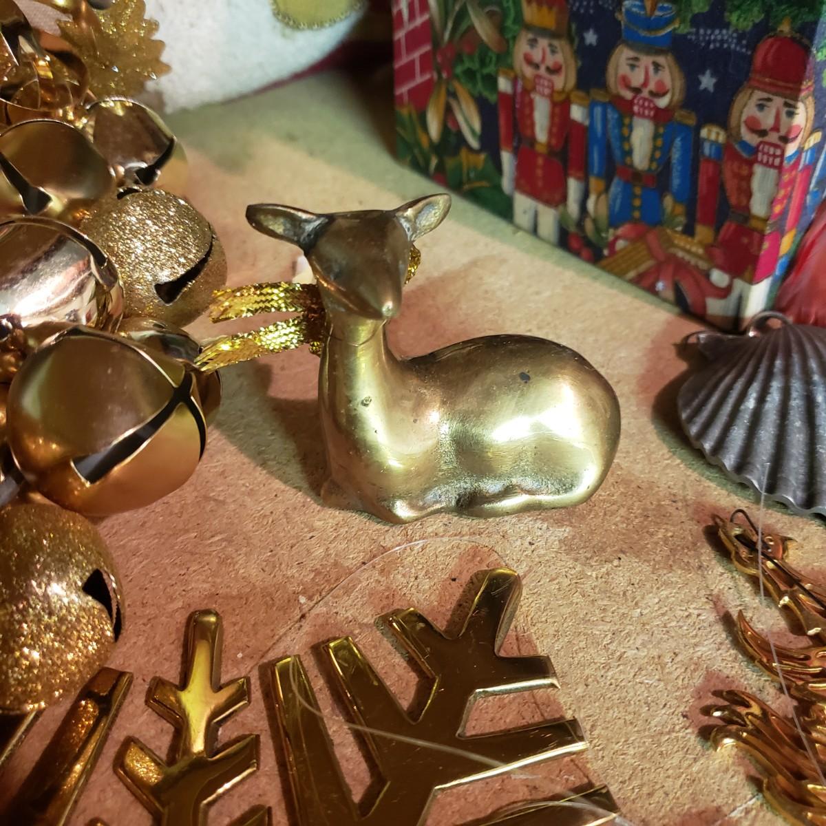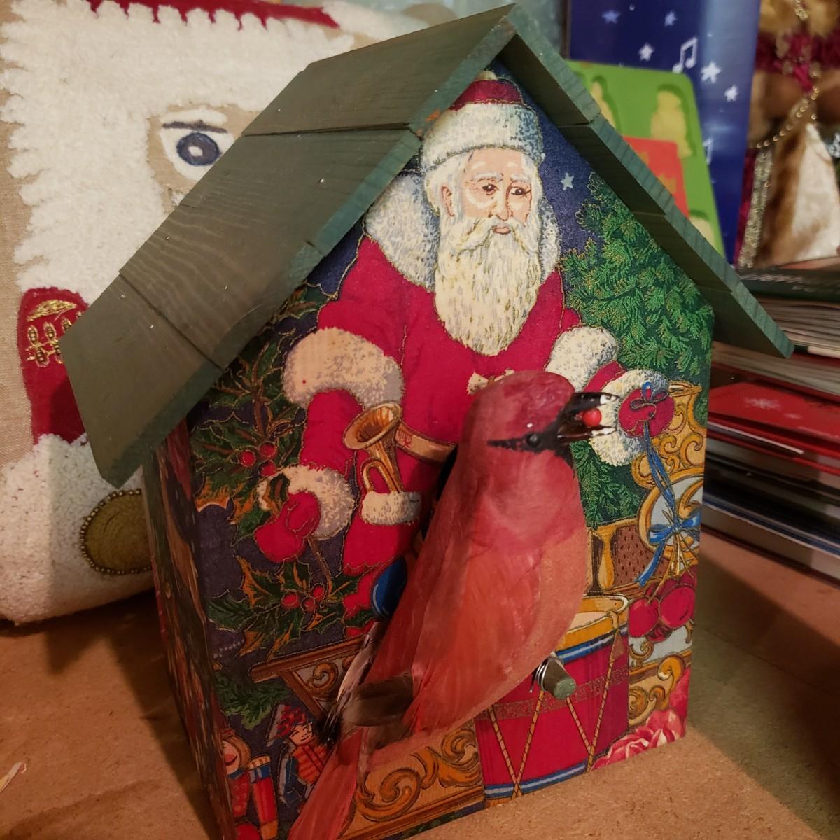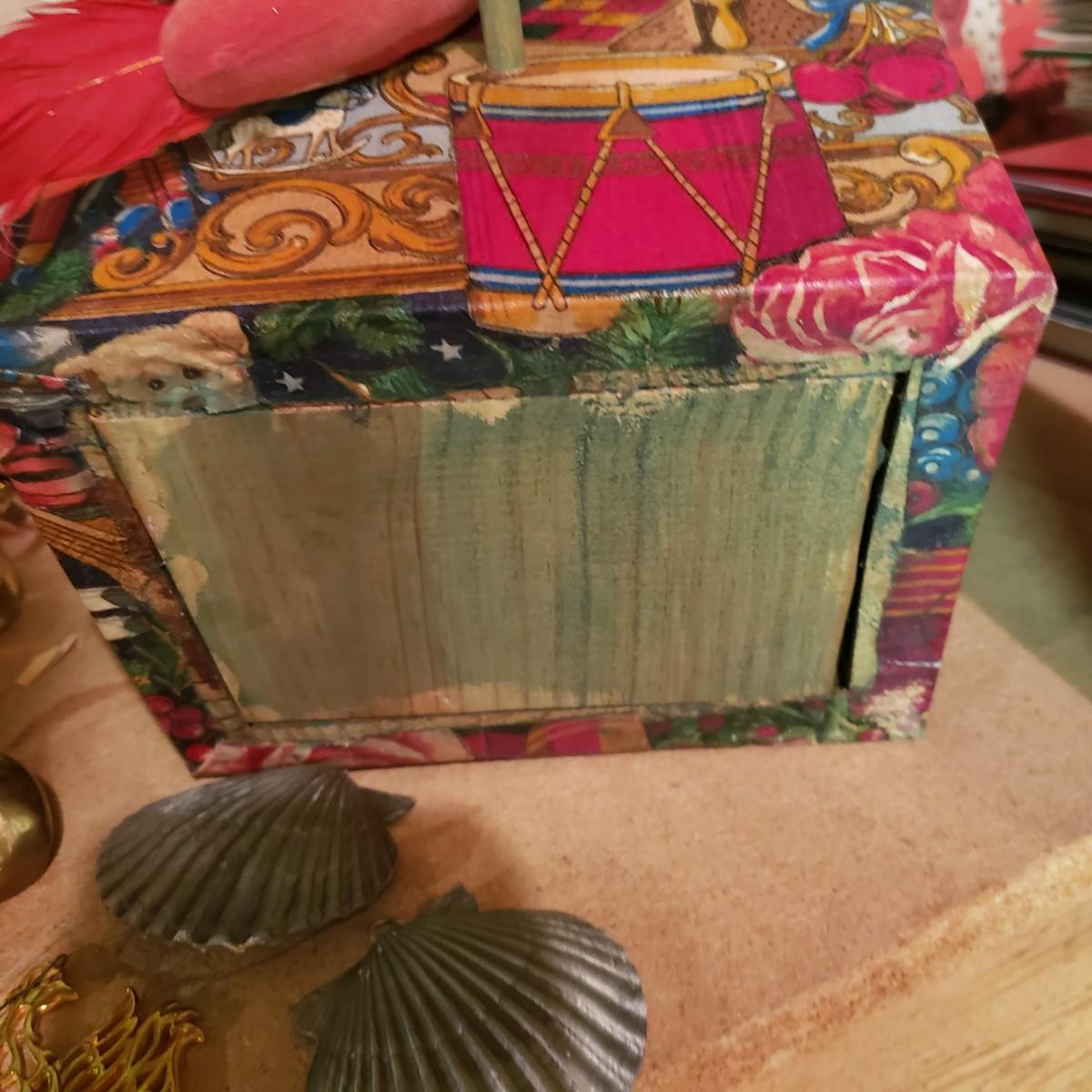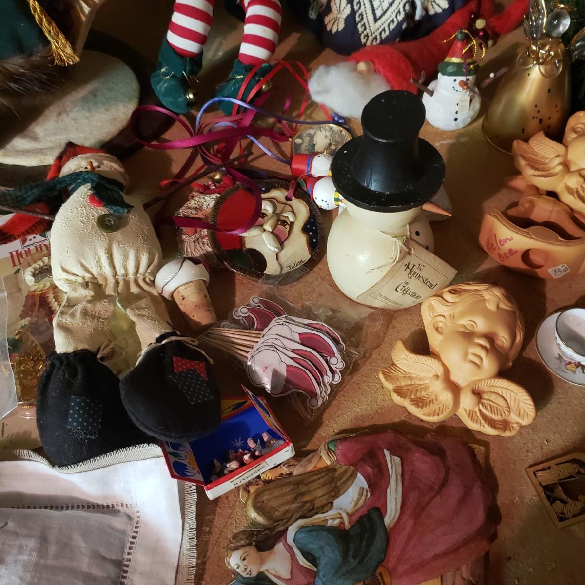 It's never too early for Christmas! There are unique ornaments, a brass snowflake (8") and reindeer (3" x 2") and a jingle bell wreath to ring off the celebration. The standing Santa Cat and the other two vintage old style Santas measure approximately 5" x 13"H. There are two wax ornaments from Germany still in the original boxes. The birdhouse has brilliant colors and such details. The stack of children's Christmas books are in great shape. This lot only pertains to the items on the one shelf, nothing below on the bottom shelf. Please see photos for inventory.