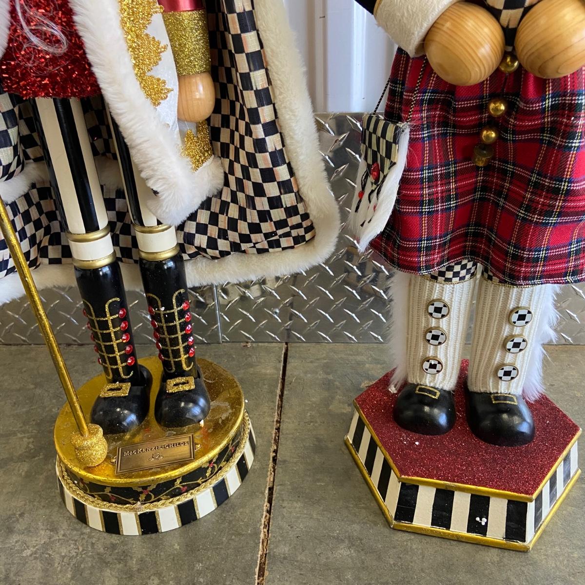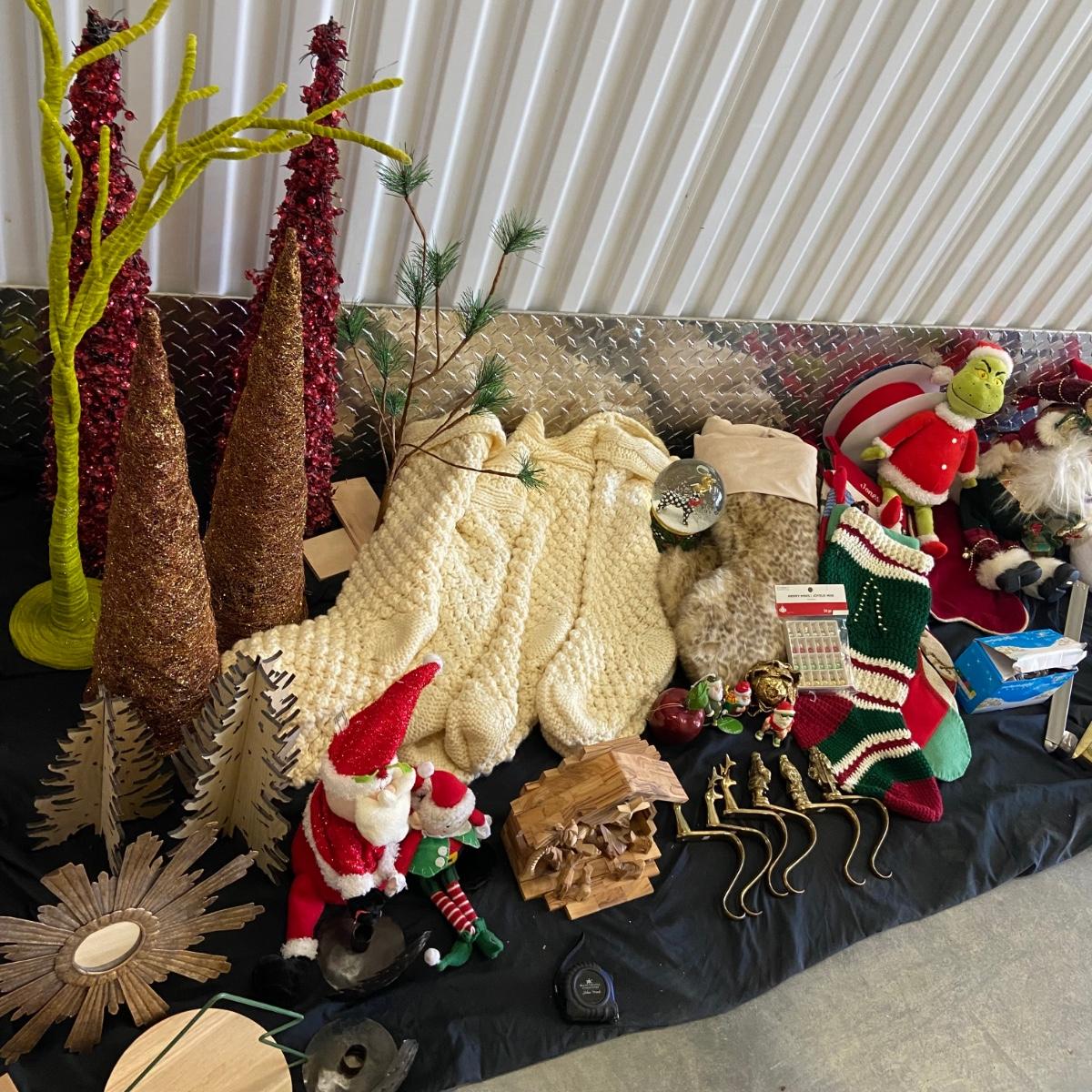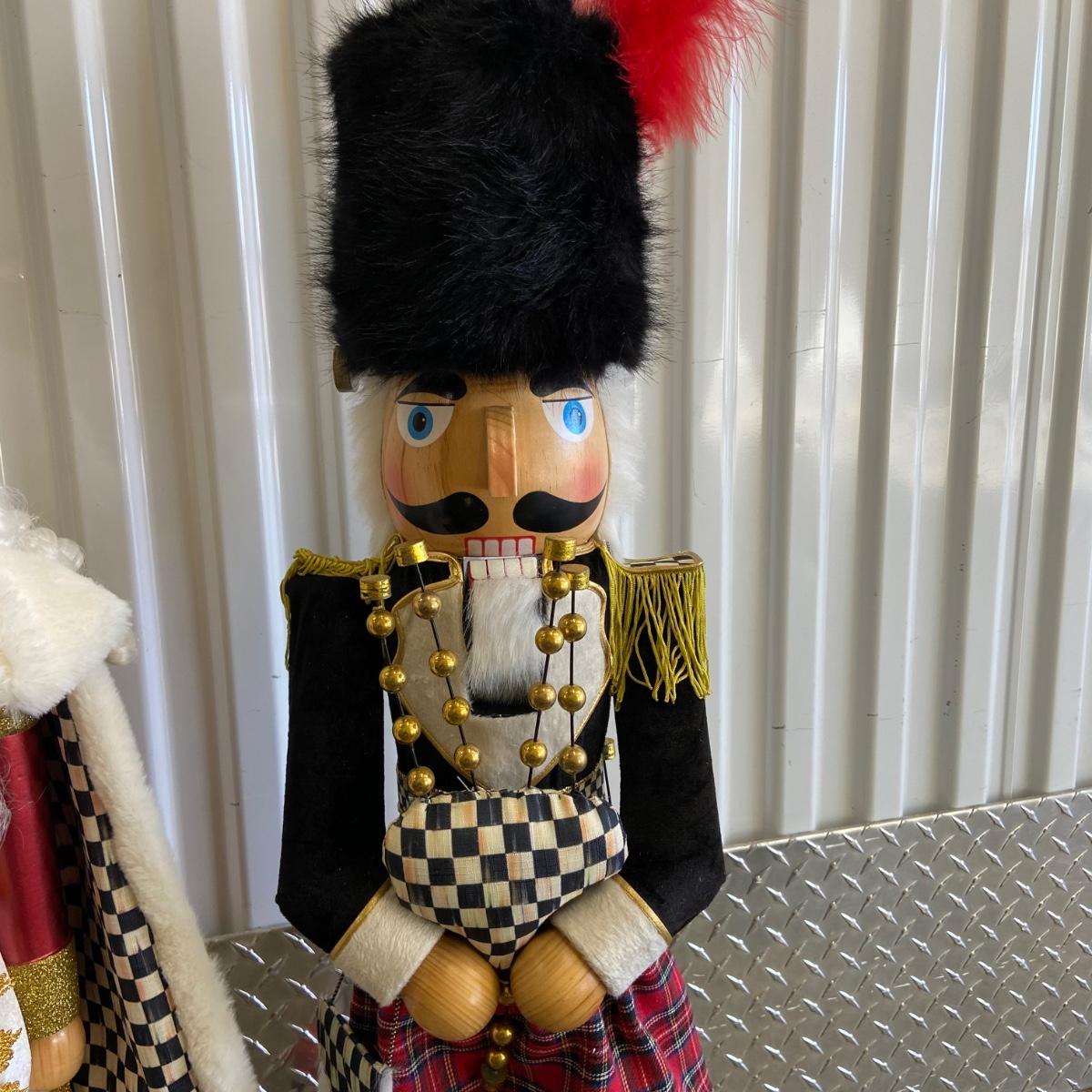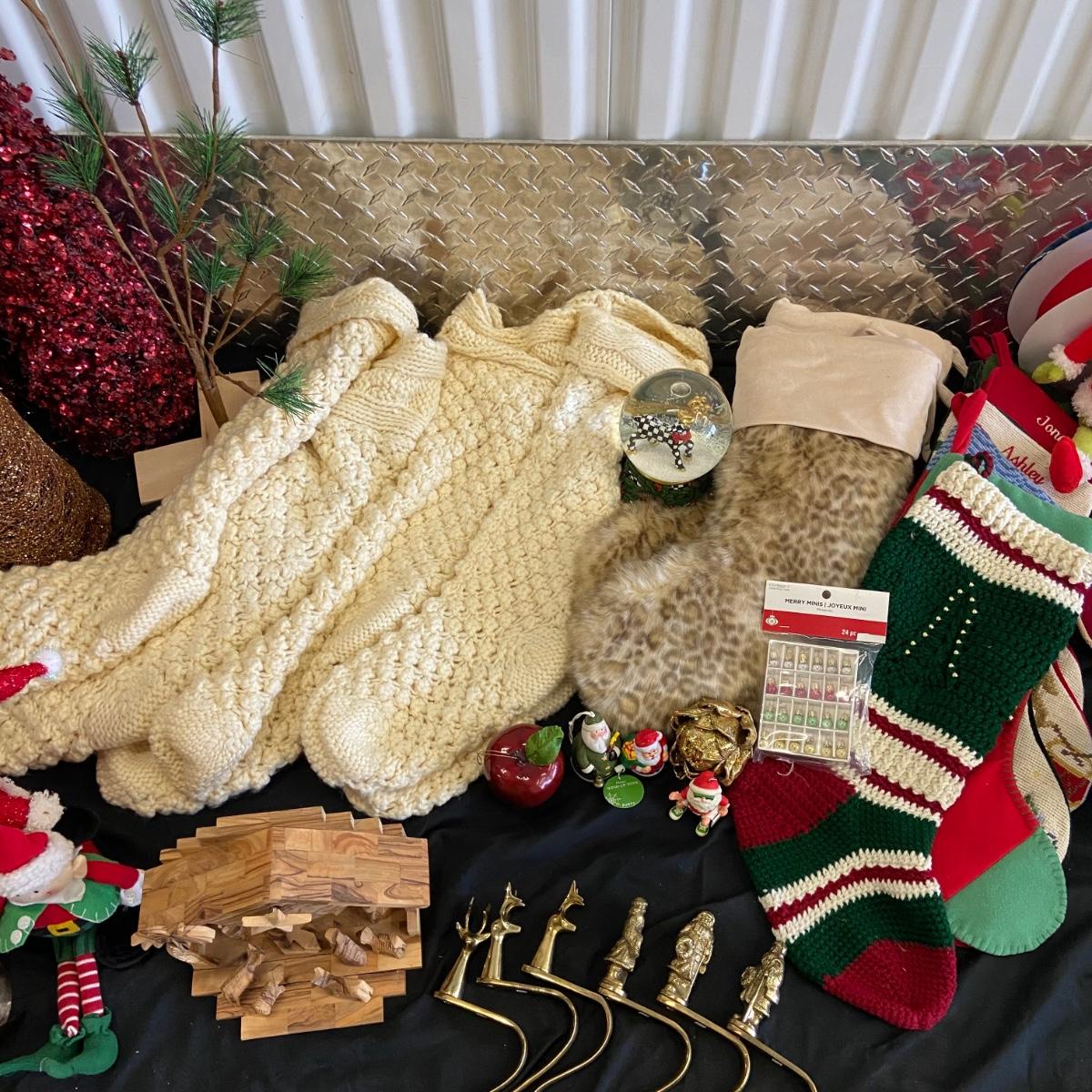 This is a massive Christmas lot!! Some of the highlights of this haul are two massive and stunning “Mackenzie Childs” wooden nut crackers both of which are 36” tall and are heavy! Another highlight is a wooden hand-carved nativity scene and this measure 8” x 5.5” x 7”H. The "floor" of the set has come unglued, see pictures. This lot also has six brass stocking holders made by Jefferson in India, three with Santa and three with reindeers on them. Some other items in this lot are a variety of stockings that total 17 (see pictures for styles), a variety of decorative trees, a variety of different stuffed Santa’s, elves and friends; a snow-globe, a metal star tree topper, tree base, LED lights, ornaments and more. See pictures for details. Local pick up only.