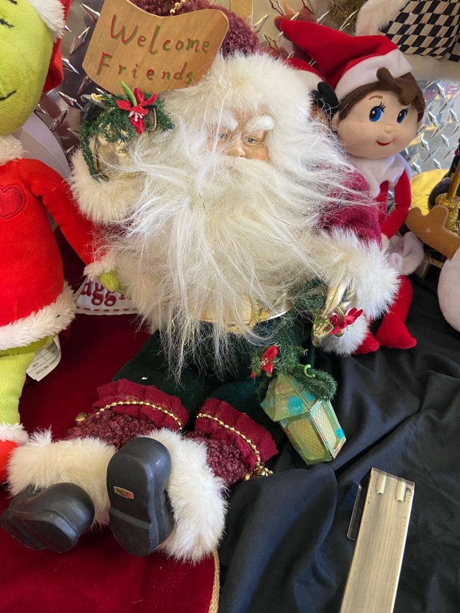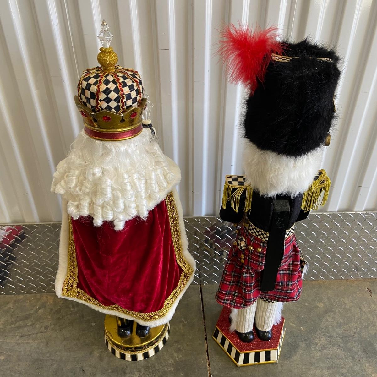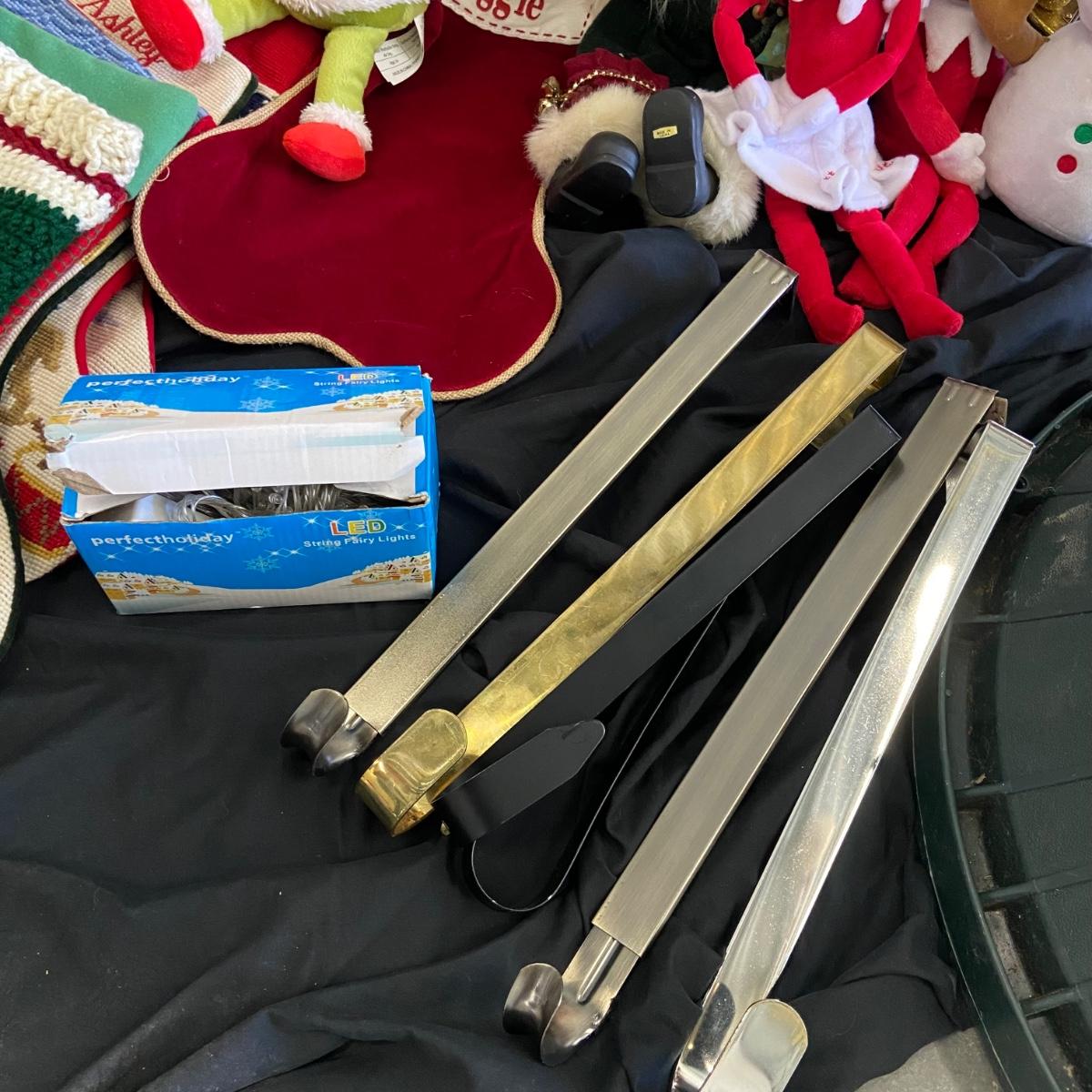 This is a massive Christmas lot!! Some of the highlights of this haul are two massive and stunning “Mackenzie Childs” wooden nut crackers both of which are 36” tall and are heavy! Another highlight is a wooden hand-carved nativity scene and this measure 8” x 5.5” x 7”H. The "floor" of the set has come unglued, see pictures. This lot also has six brass stocking holders made by Jefferson in India, three with Santa and three with reindeers on them. Some other items in this lot are a variety of stockings that total 17 (see pictures for styles), a variety of decorative trees, a variety of different stuffed Santa’s, elves and friends; a snow-globe, a metal star tree topper, tree base, LED lights, ornaments and more. See pictures for details. Local pick up only.