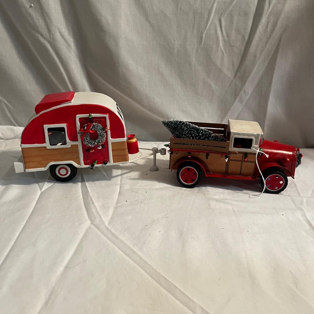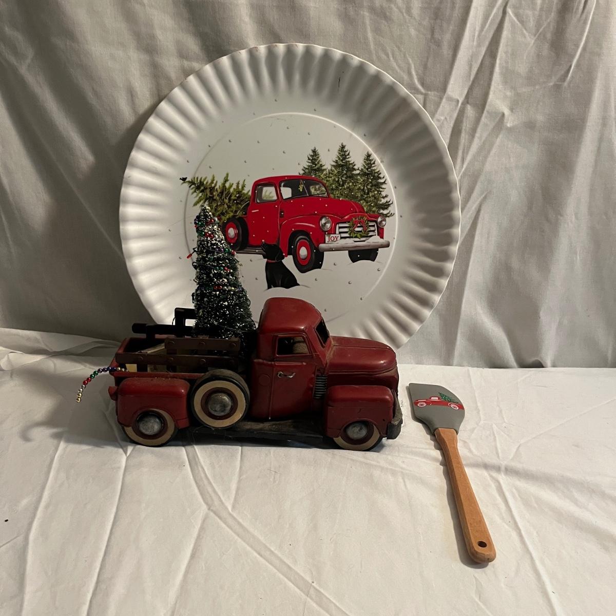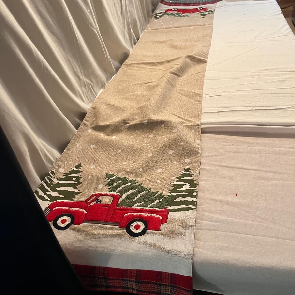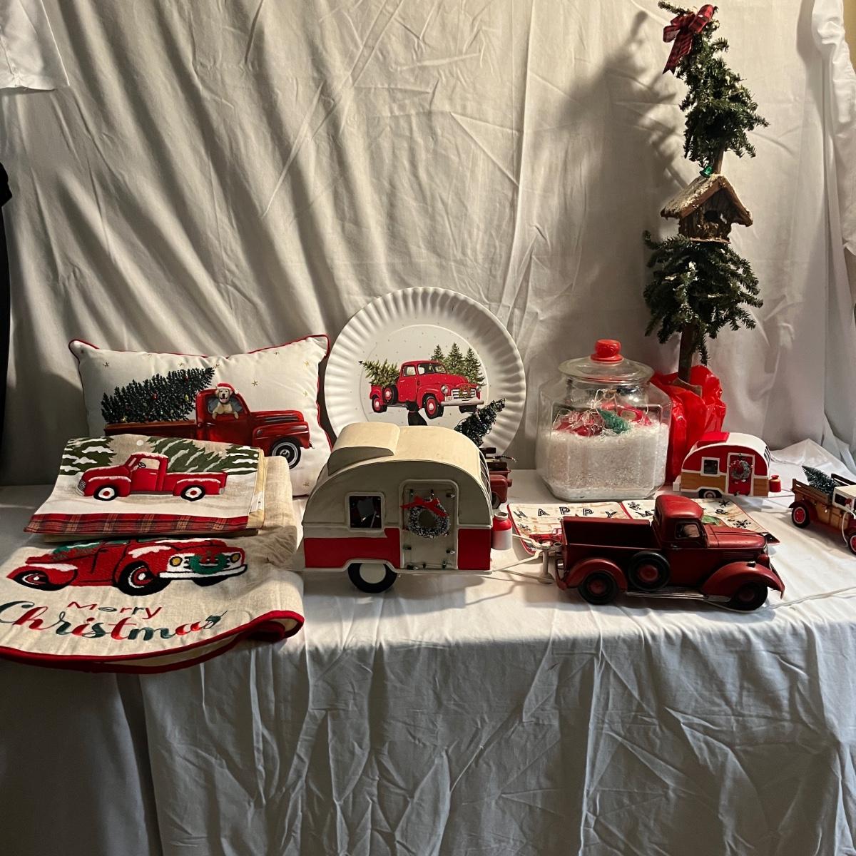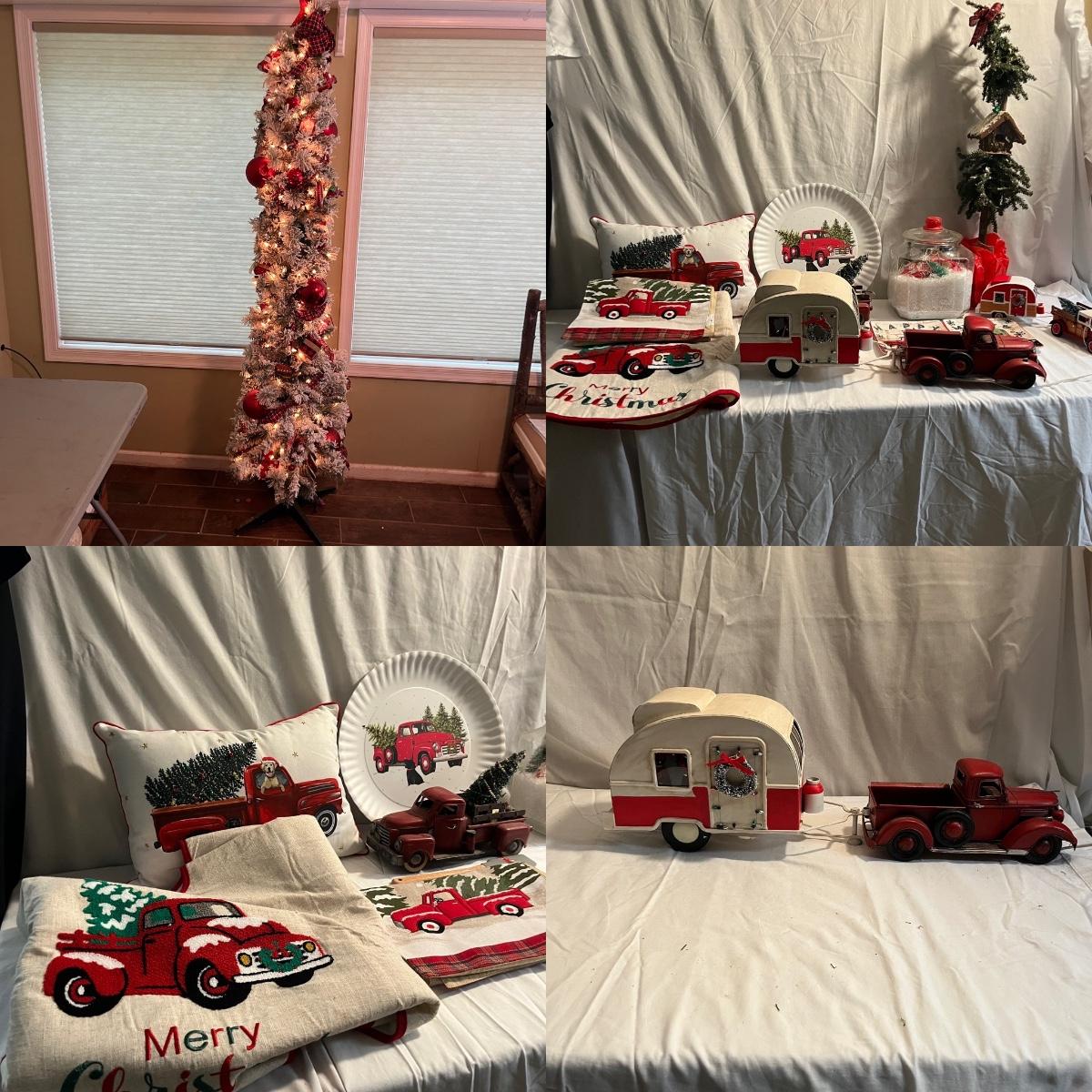 This large Christmas lot contains a lighted tree, table runner, metal trucks and campers, plates, tree skirt, plastic plate and more. Tree measures 24”D x 86”H. Tree lit up when plugged in. The tree separates at the top, making the top piece 27” and the bottom piece(s) 59”. It is likely to separate further, but we were unable because of its garland and lights.