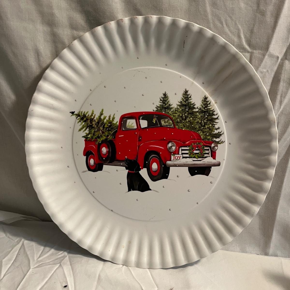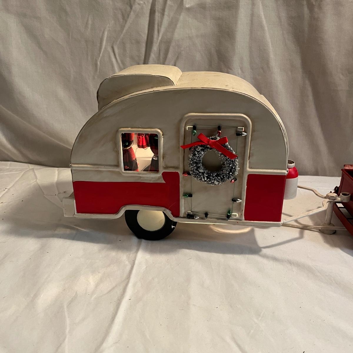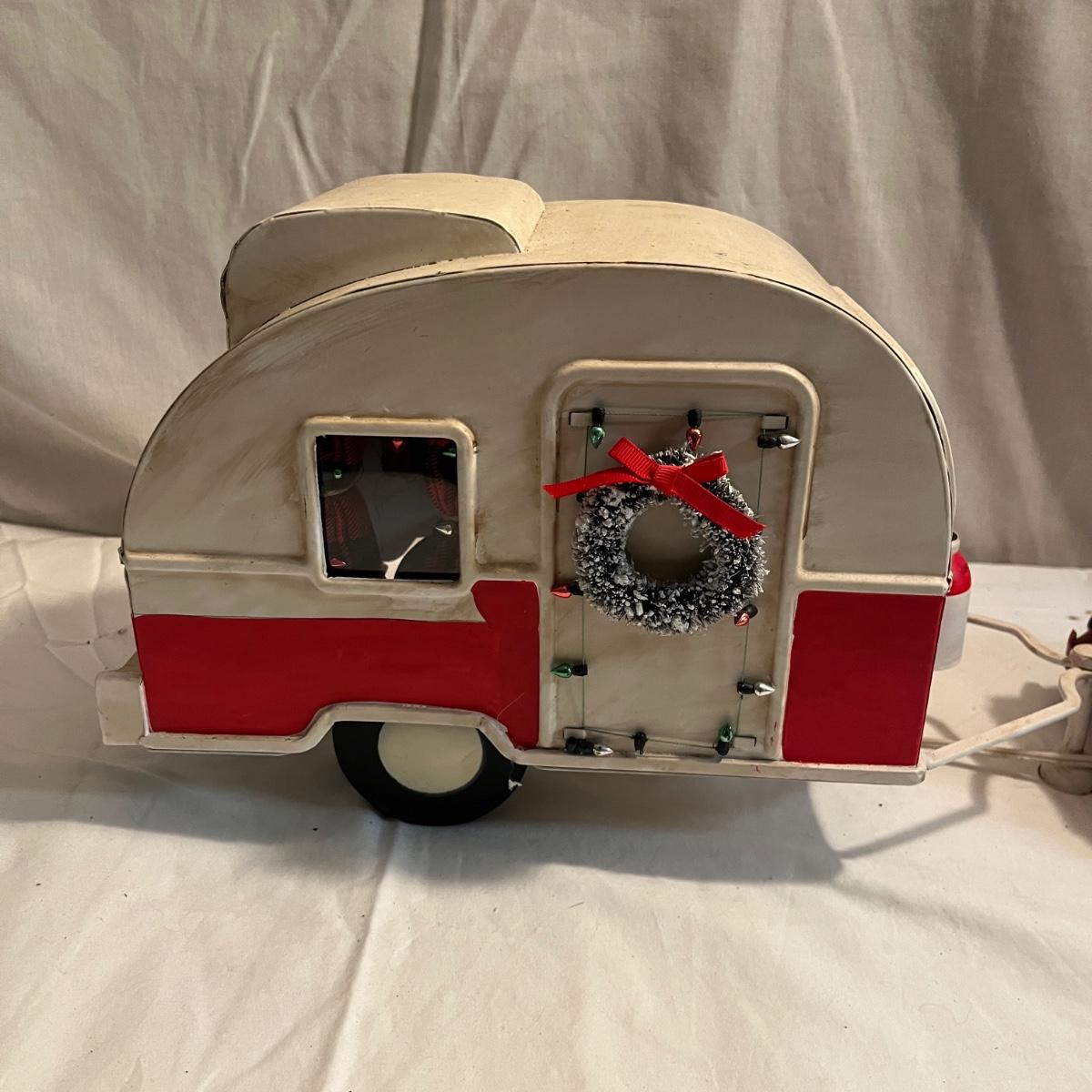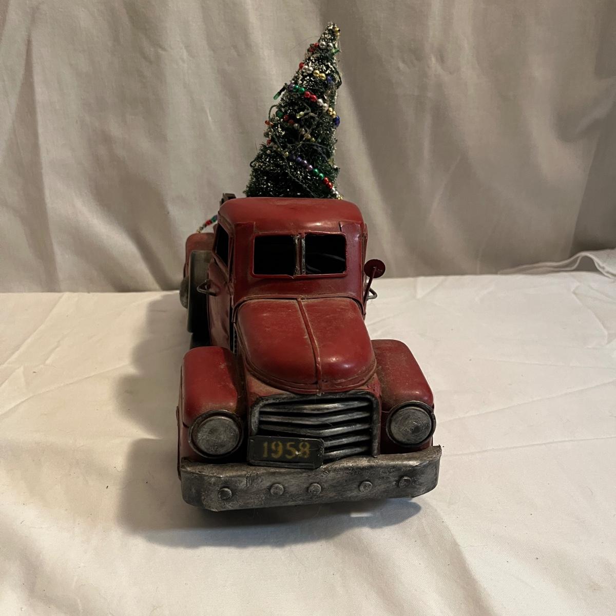 This large Christmas lot contains a lighted tree, table runner, metal trucks and campers, plates, tree skirt, plastic plate and more. Tree measures 24”D x 86”H. Tree lit up when plugged in. The tree separates at the top, making the top piece 27” and the bottom piece(s) 59”. It is likely to separate further, but we were unable because of its garland and lights.