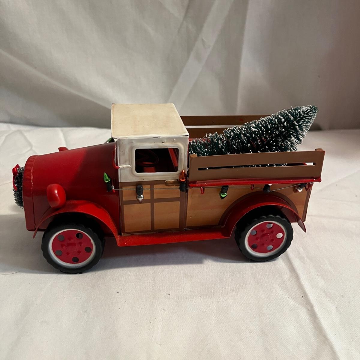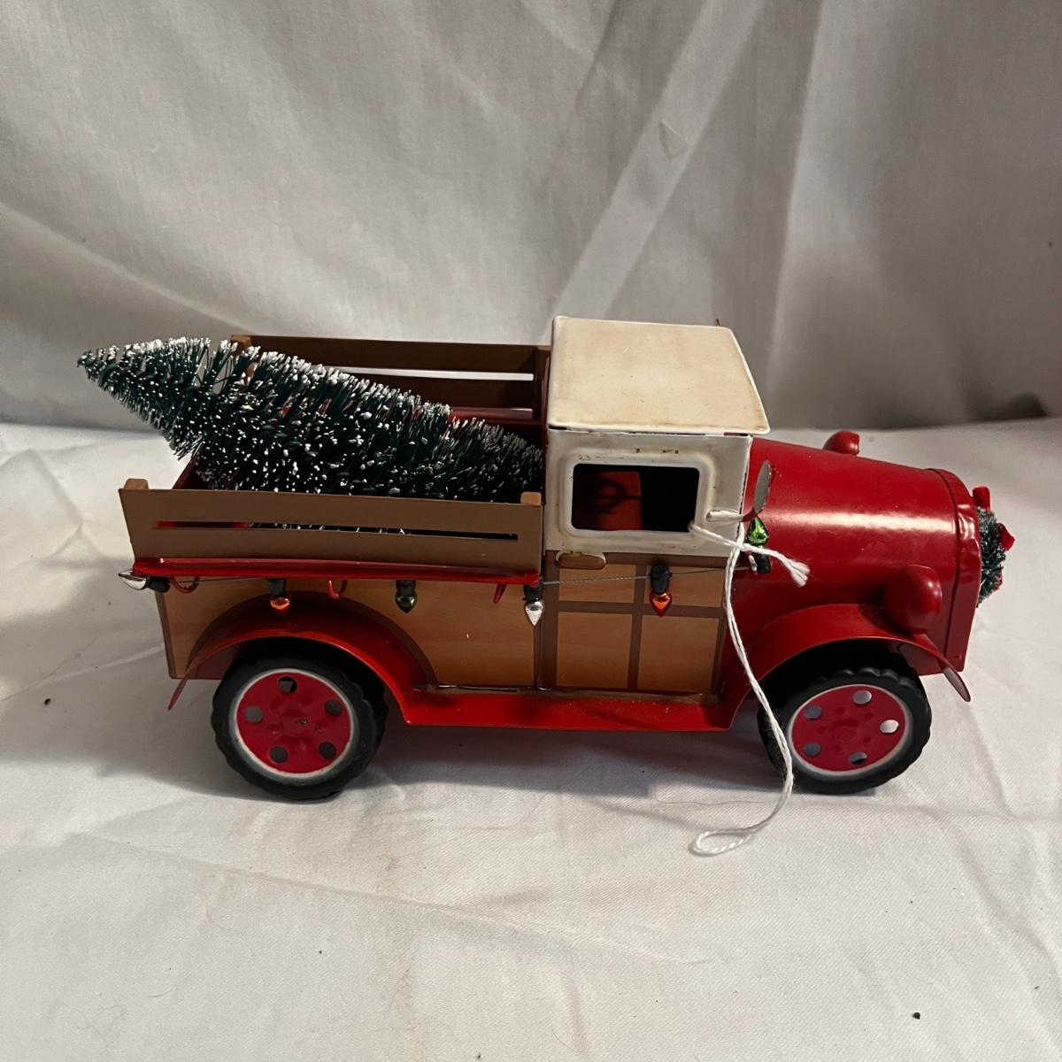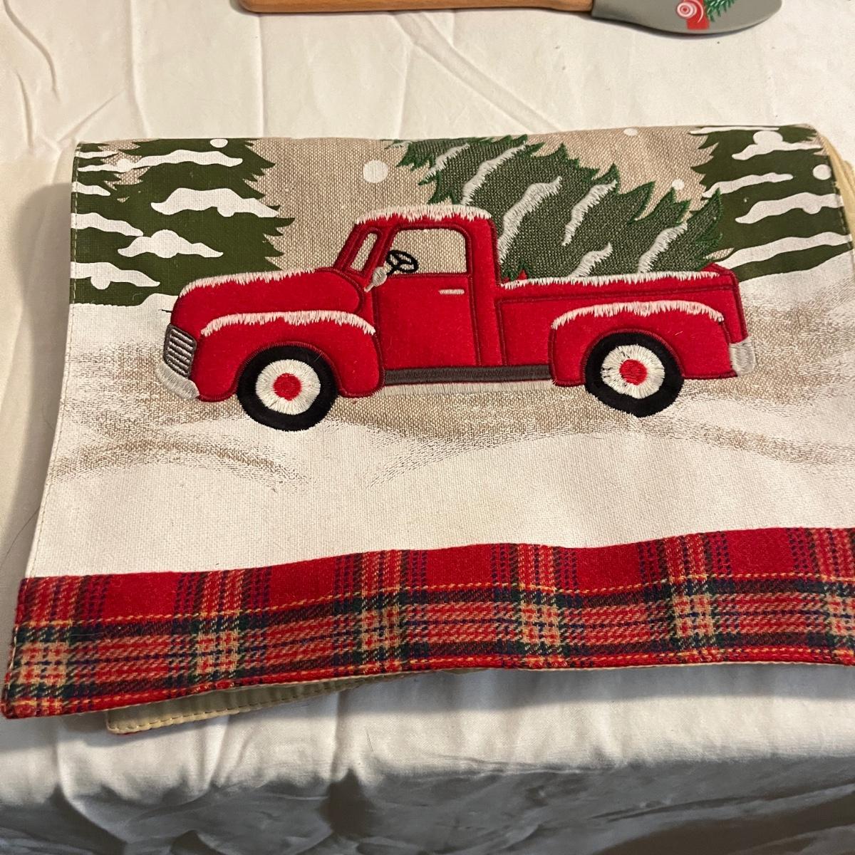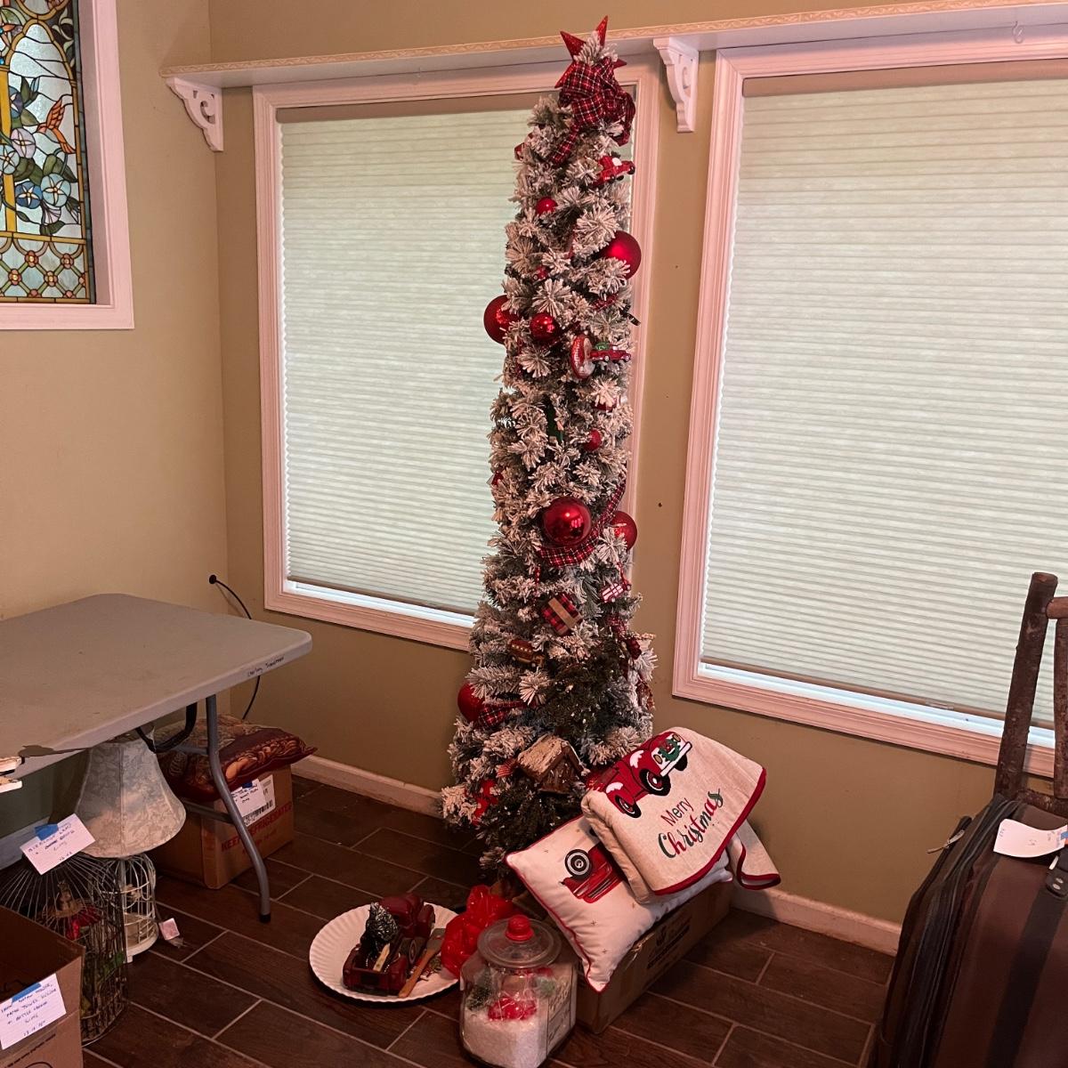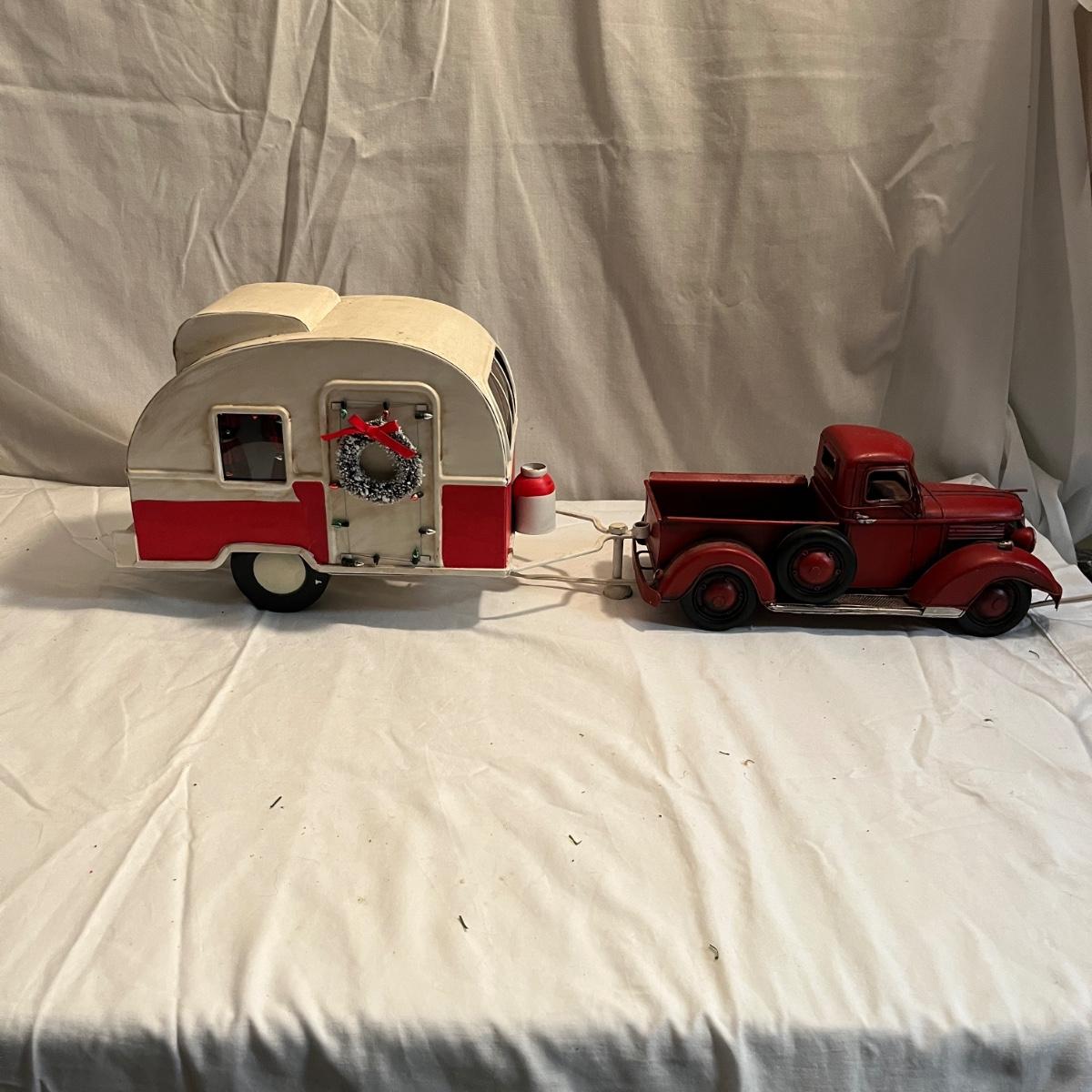 This large Christmas lot contains a lighted tree, table runner, metal trucks and campers, plates, tree skirt, plastic plate and more. Tree measures 24”D x 86”H. Tree lit up when plugged in. The tree separates at the top, making the top piece 27” and the bottom piece(s) 59”. It is likely to separate further, but we were unable because of its garland and lights.