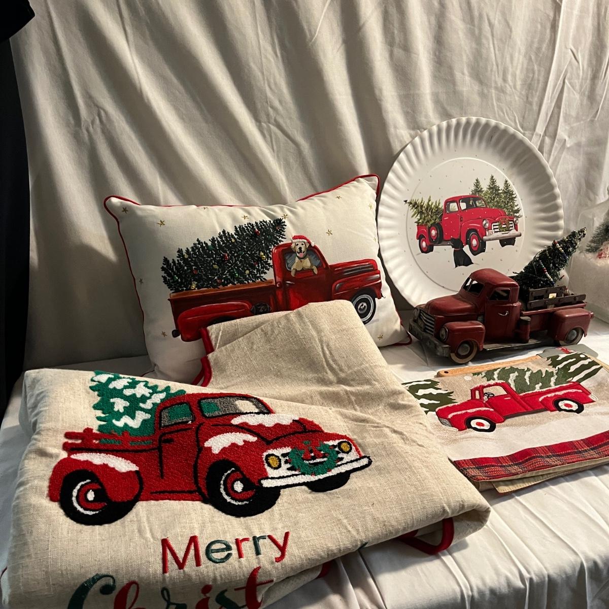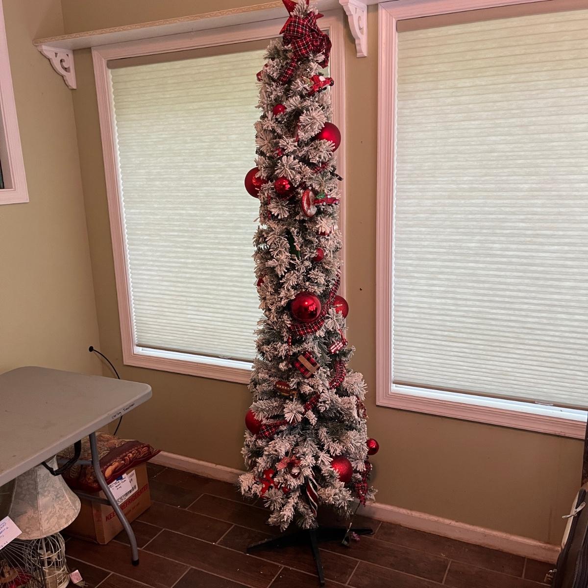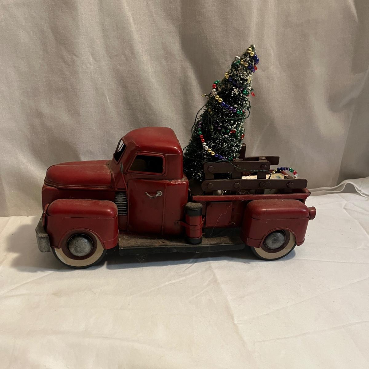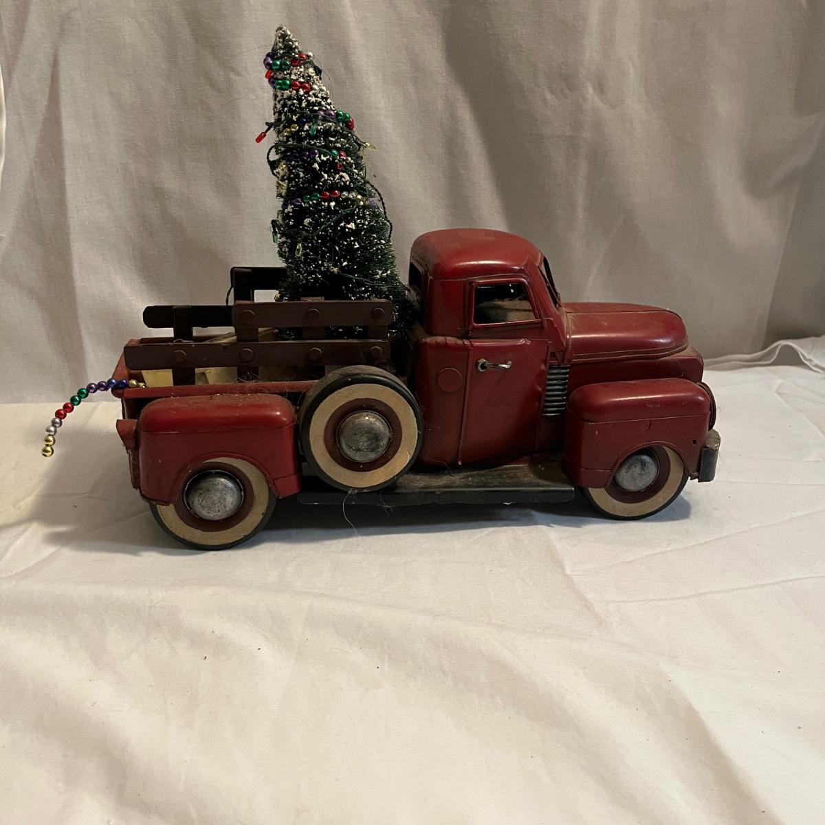 This large Christmas lot contains a lighted tree, table runner, metal trucks and campers, plates, tree skirt, plastic plate and more. Tree measures 24”D x 86”H. Tree lit up when plugged in. The tree separates at the top, making the top piece 27” and the bottom piece(s) 59”. It is likely to separate further, but we were unable because of its garland and lights.